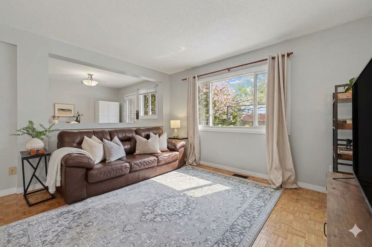 • Bright and spacious living room with hardwood floors and large windows.
