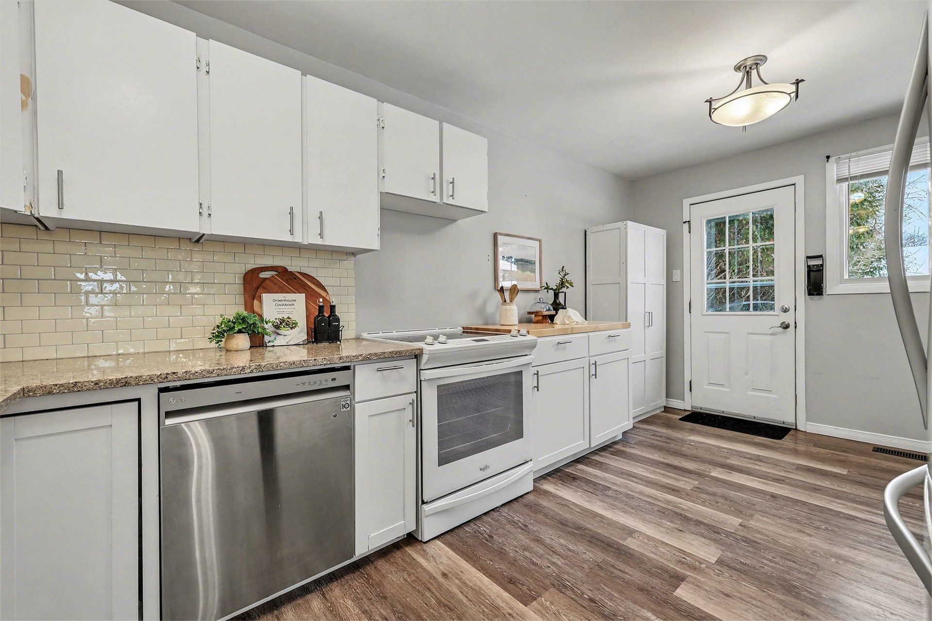 • Eat-in kitchen features quartz countertops and updated flooring.