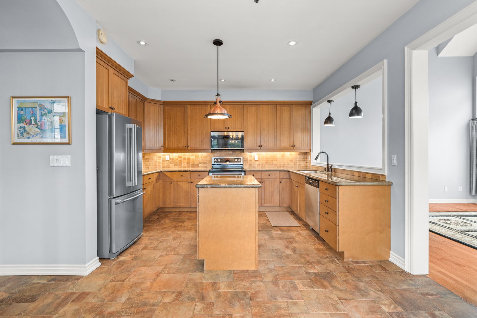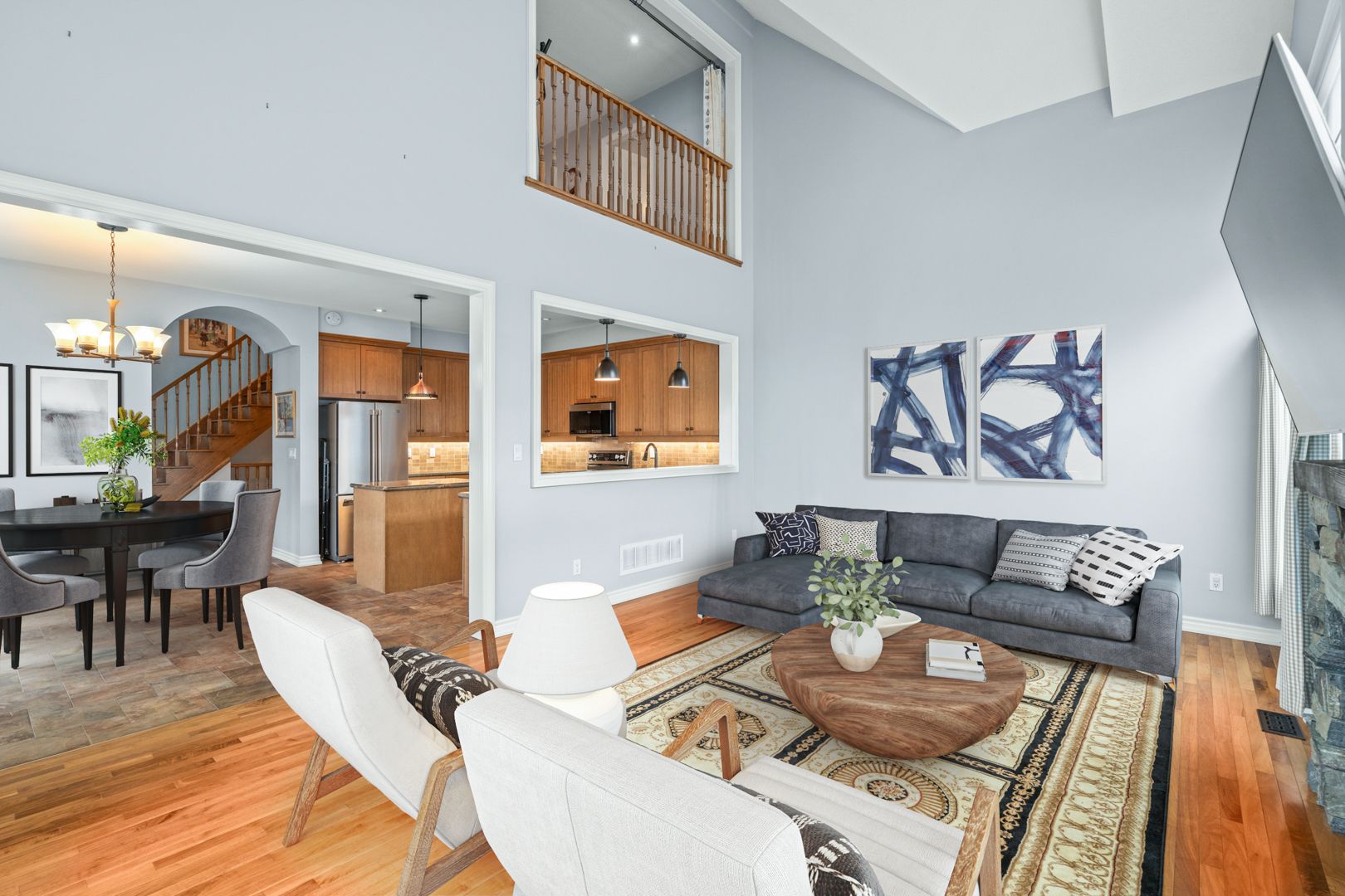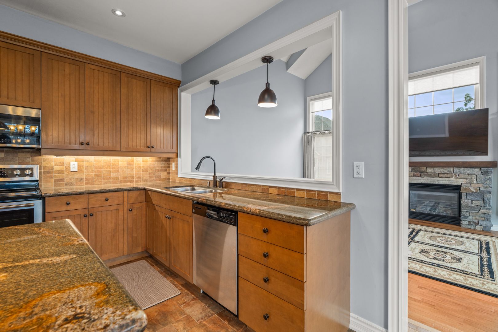 • Bright Great Room with cathedral ceilings and full height stone fireplace.