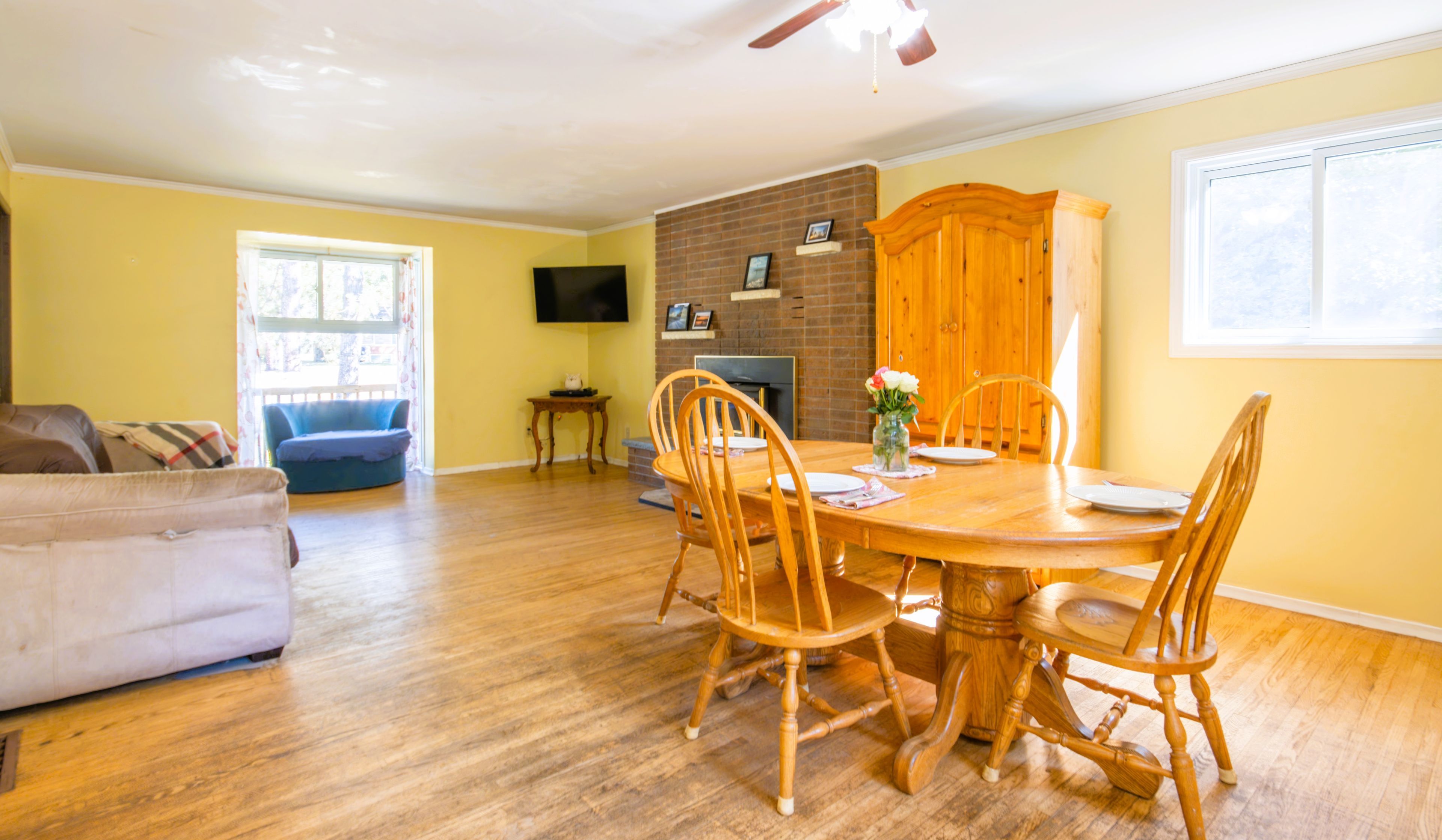 • Bright living spaces with large windows and a cozy brick fireplace.