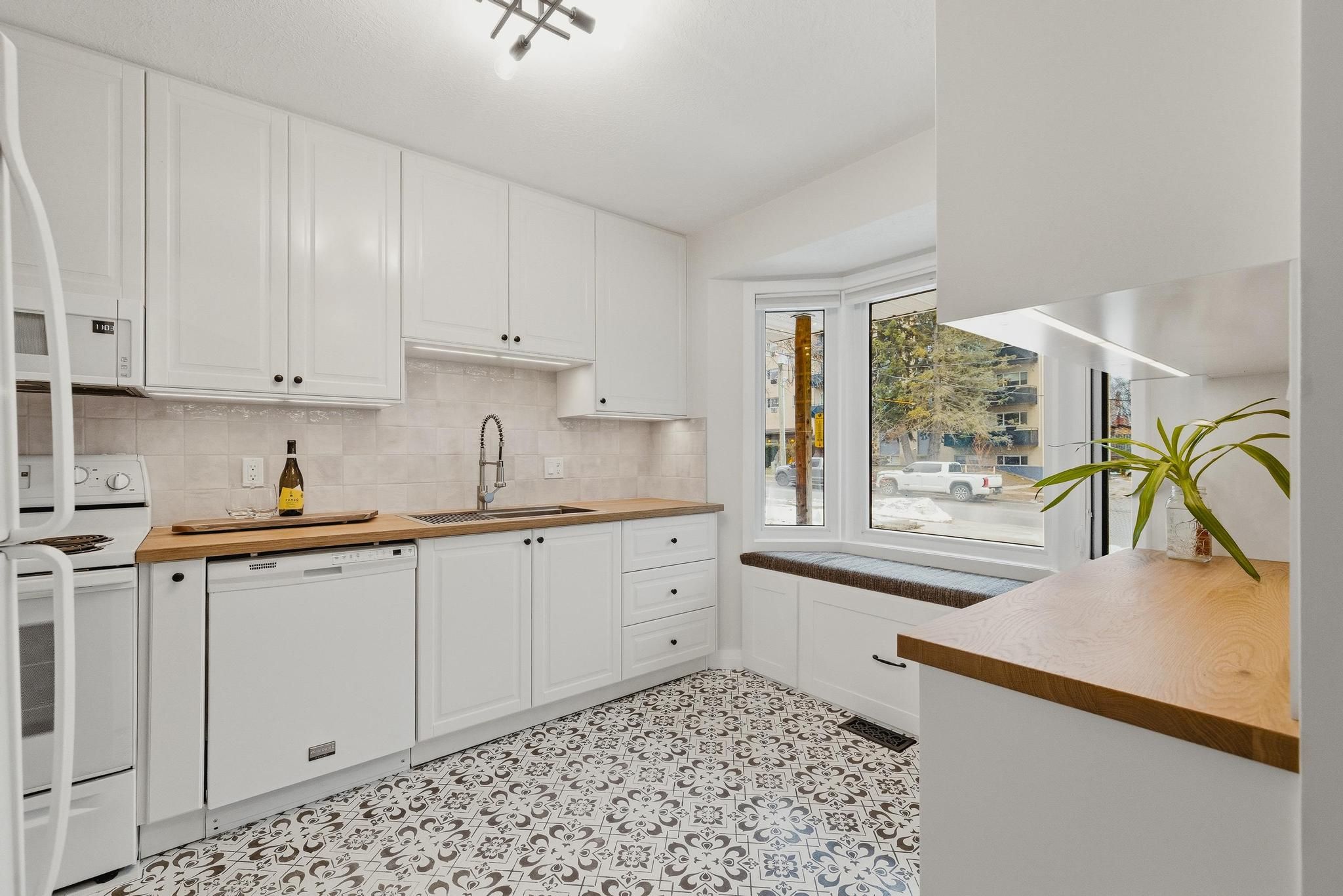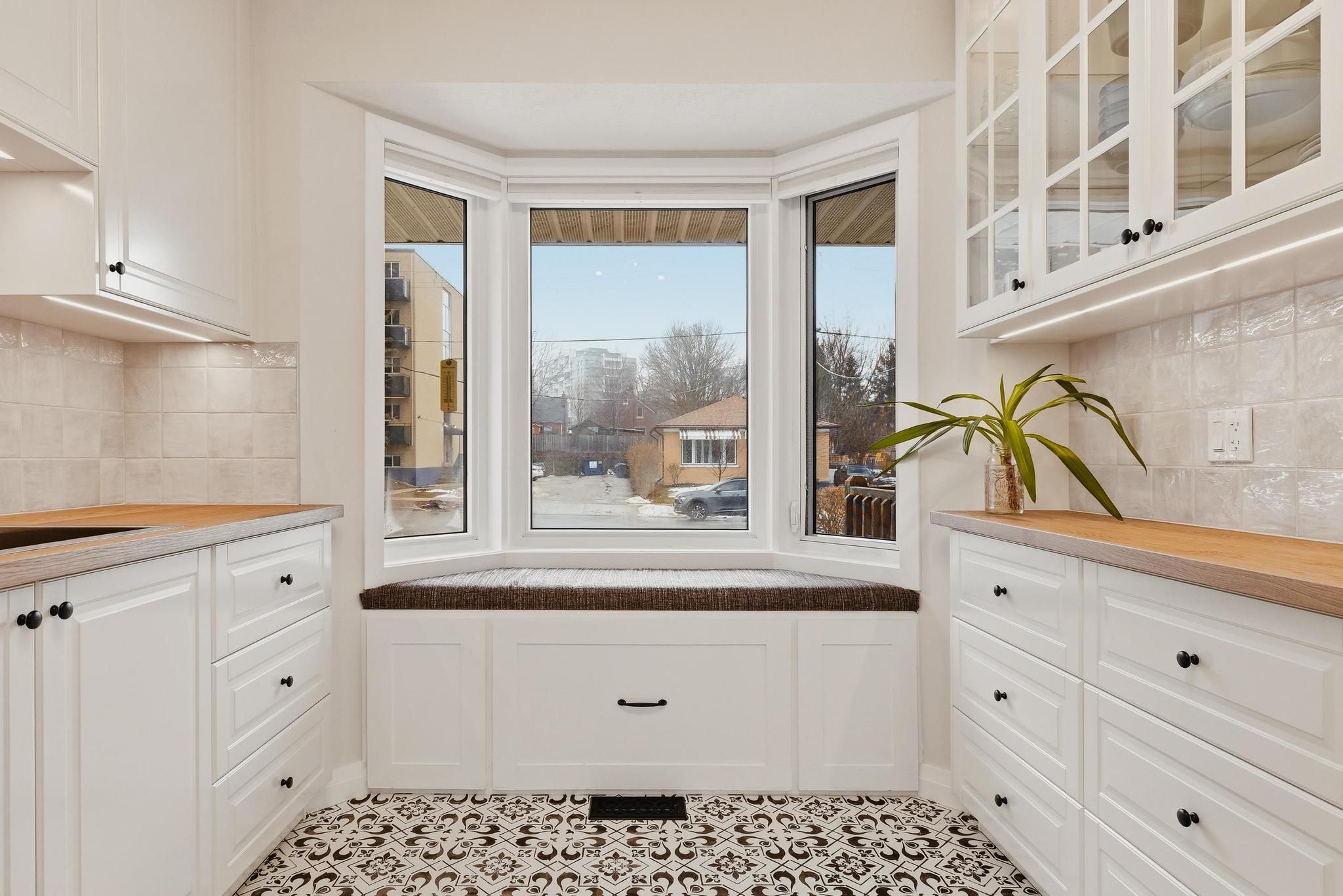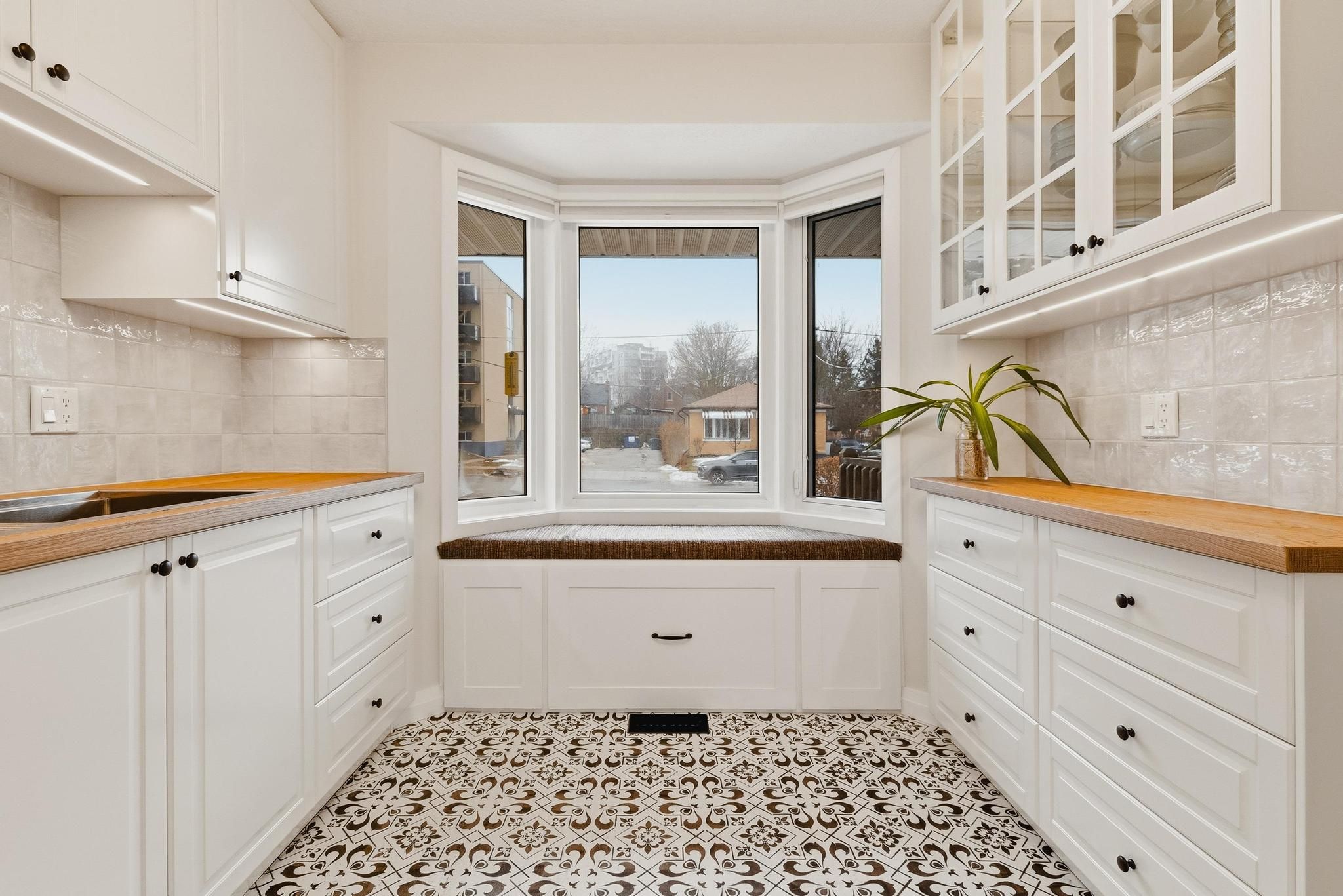 • Bright kitchen with butcher block counters and built-in storage bench.
