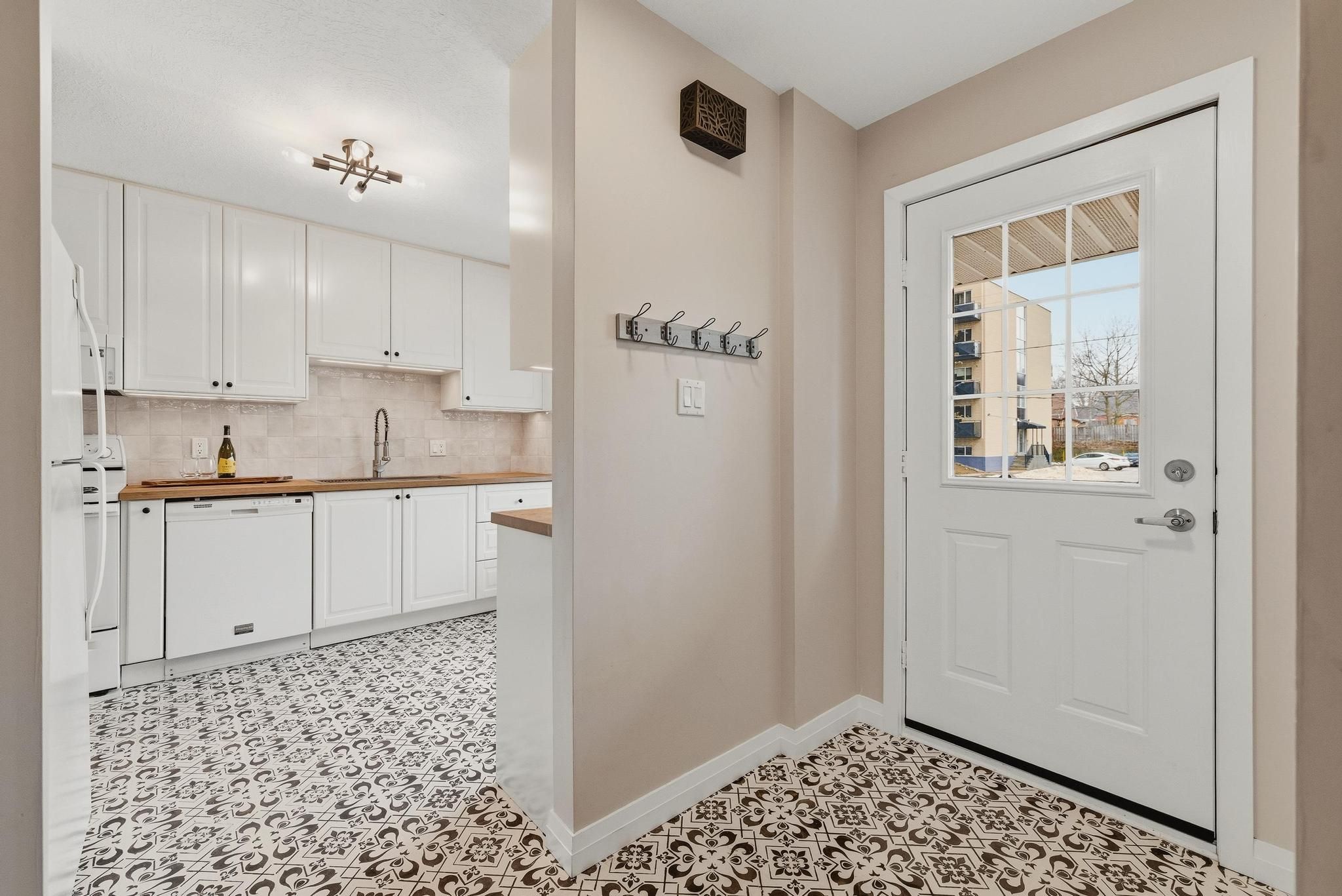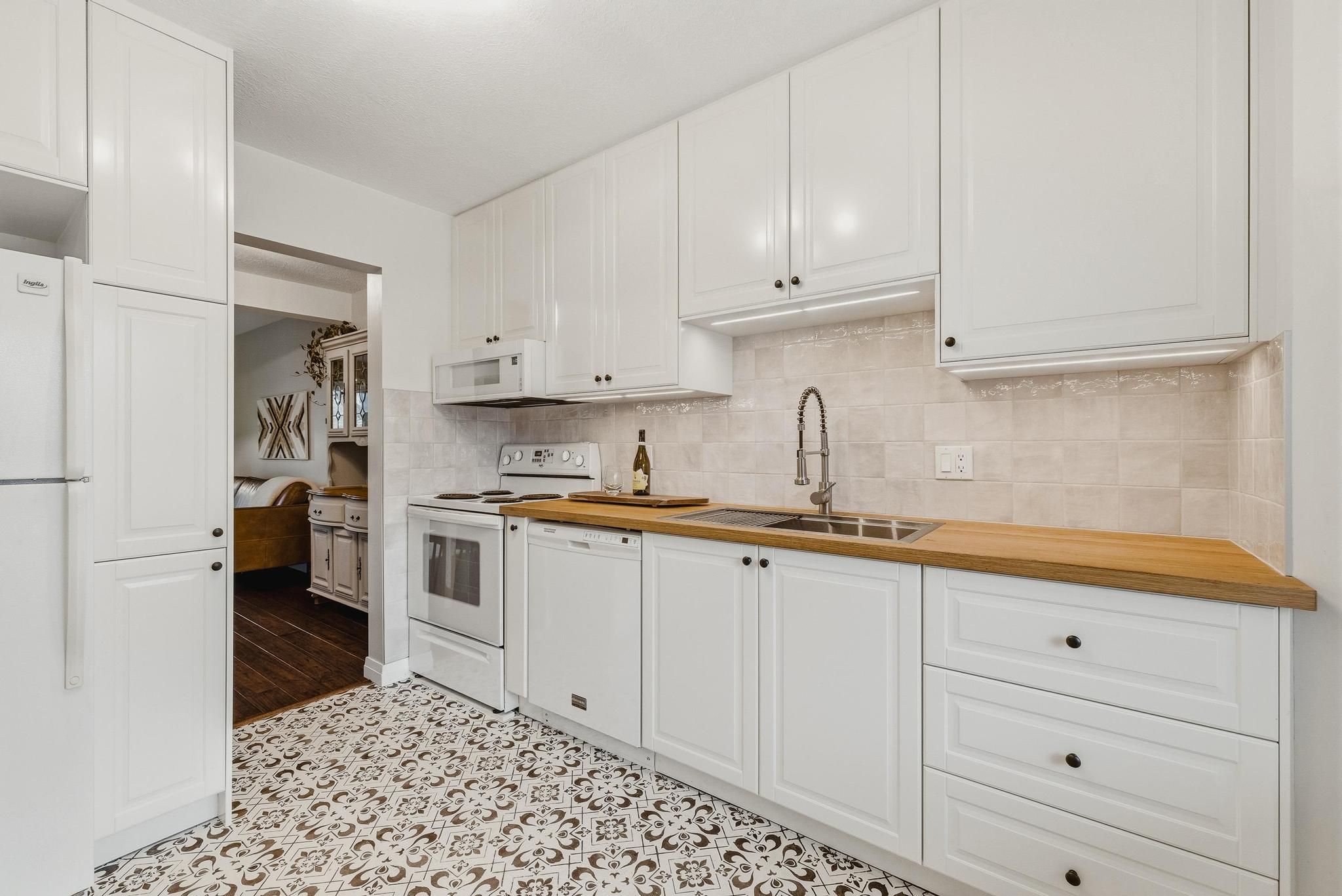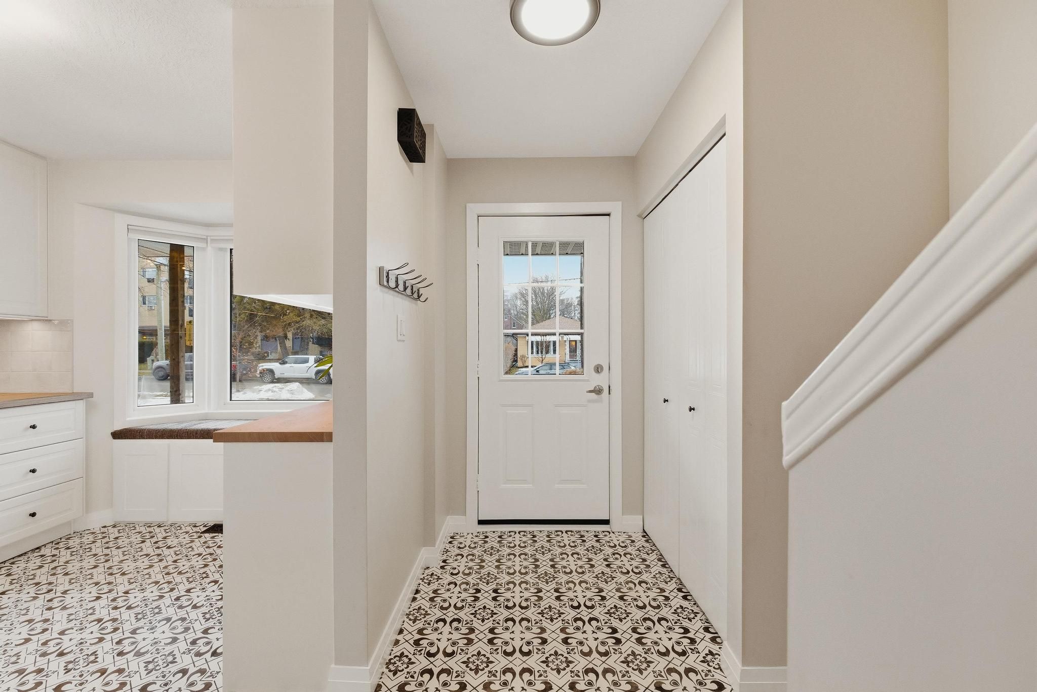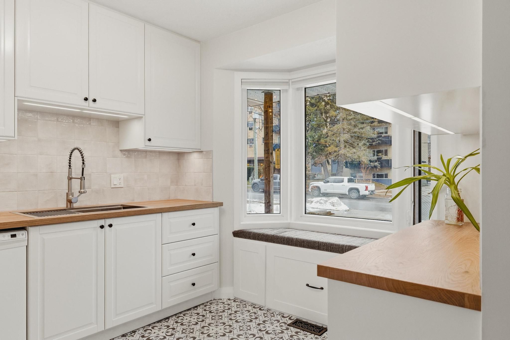 • Bright kitchen with butcher block counters and built-in storage bench.