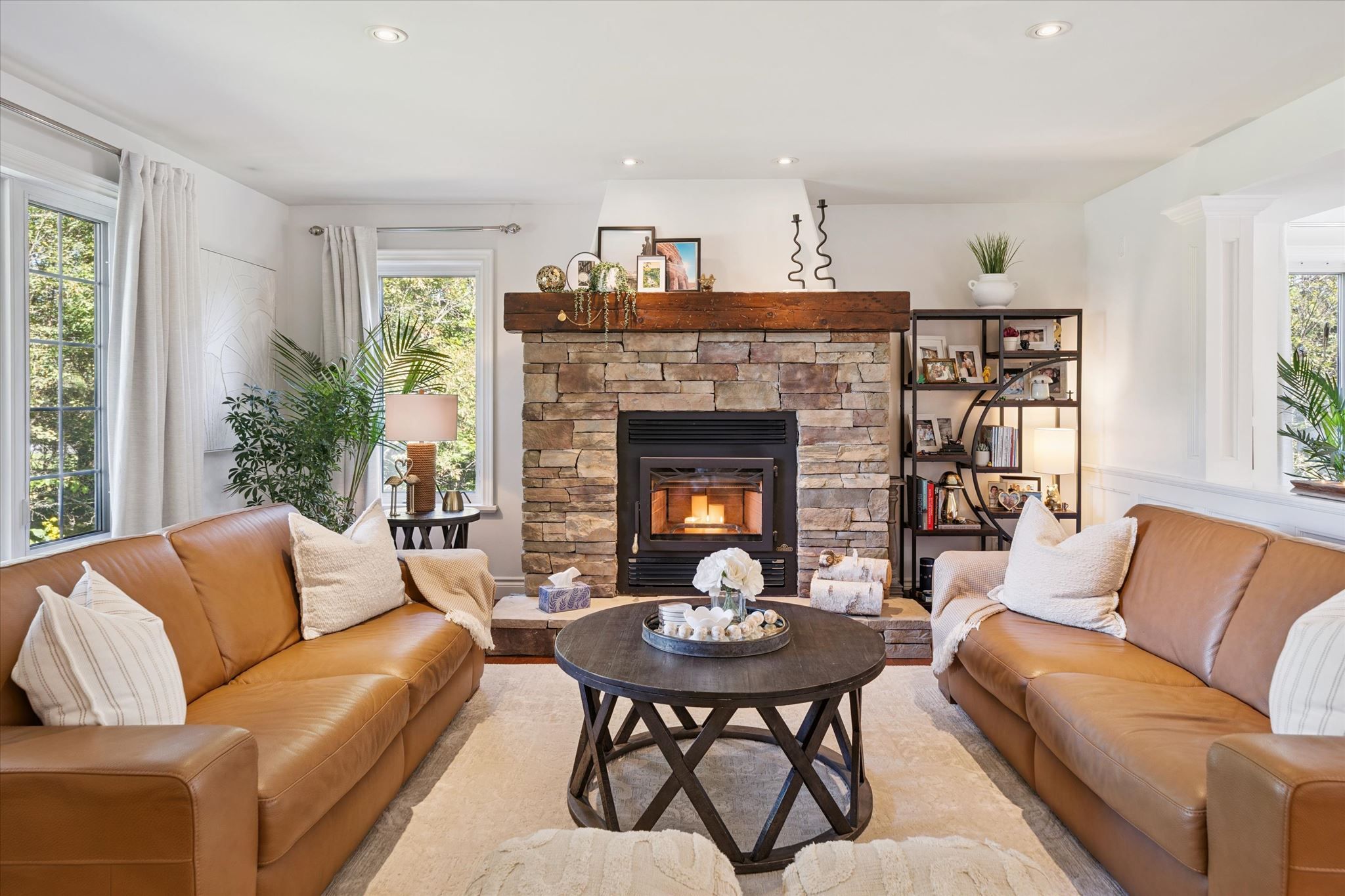 • Warm living space featuring a stone, wood-burning fireplace for cozy nights.