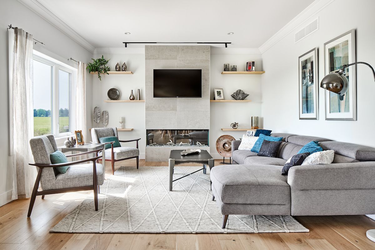 • Open living space with modern features including a 3-sided electric fireplace.