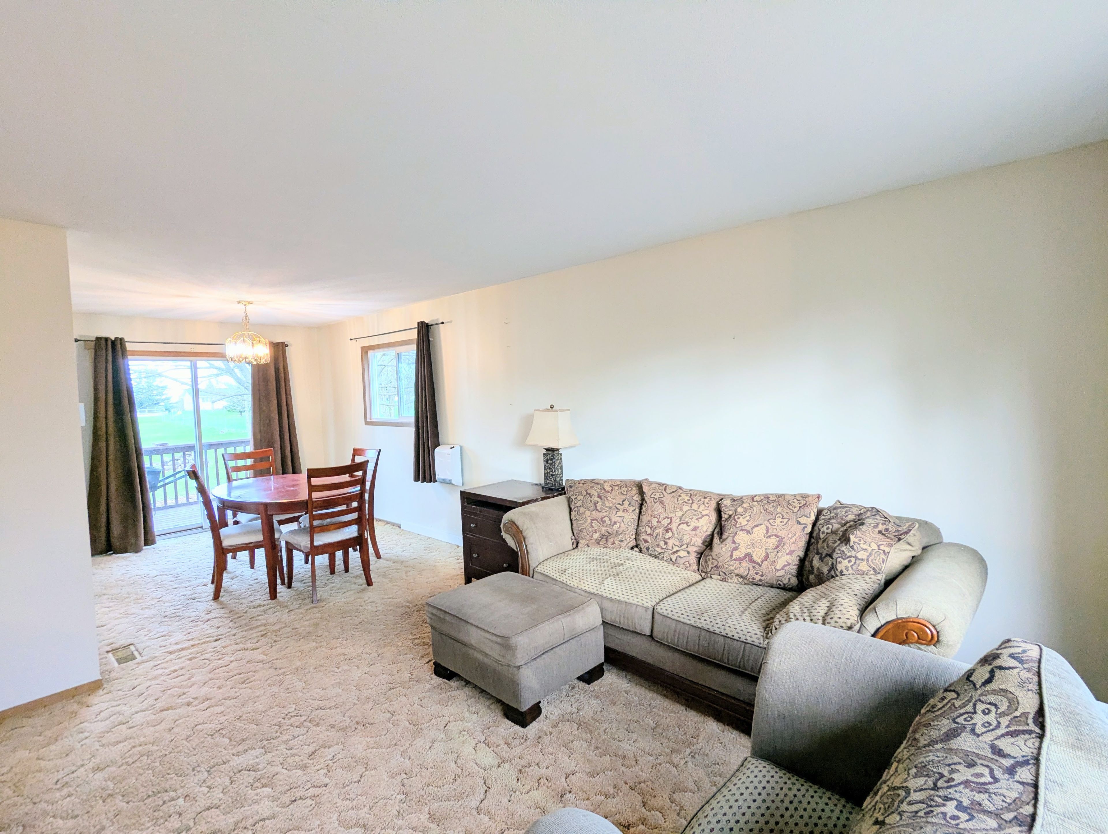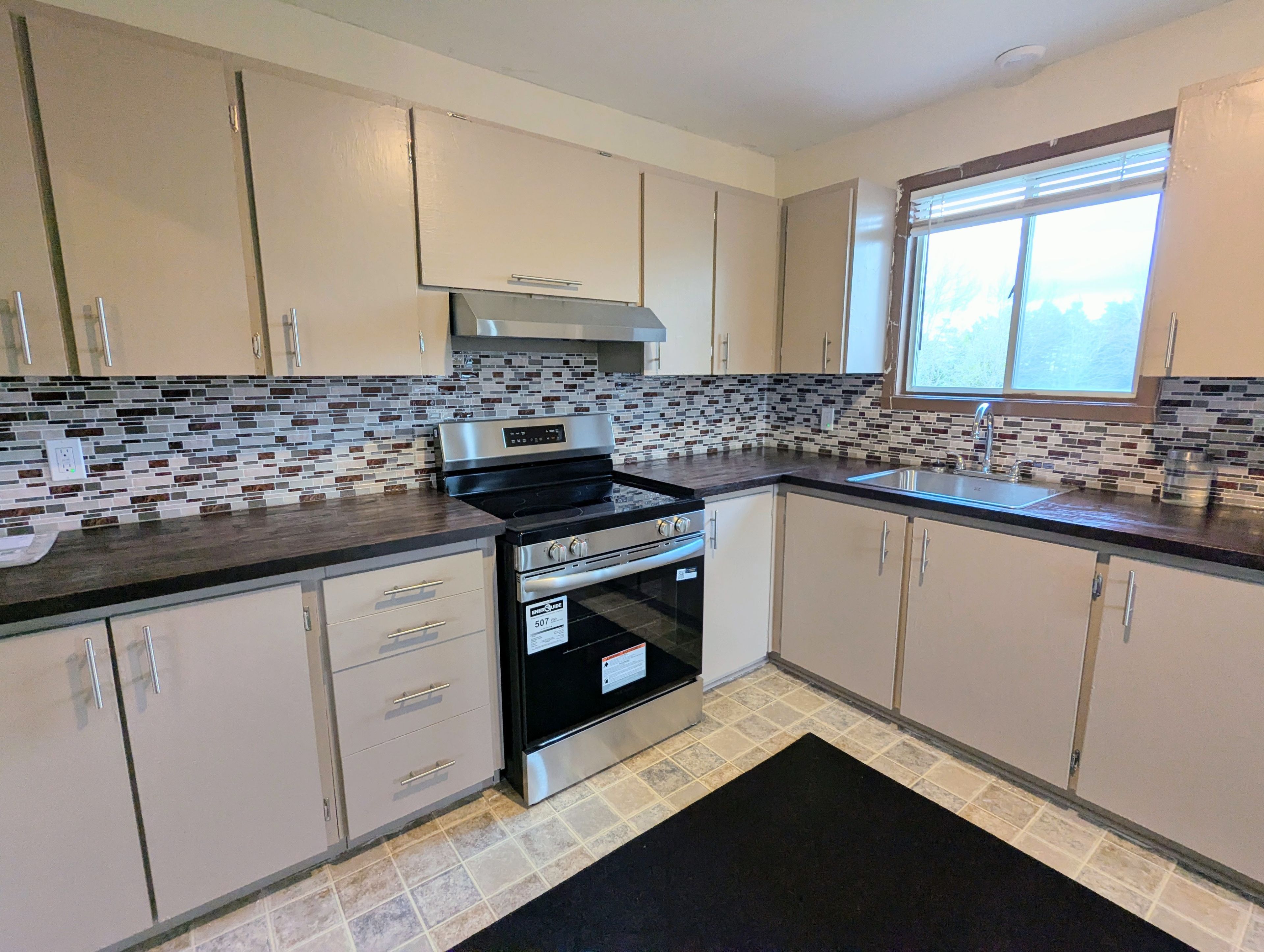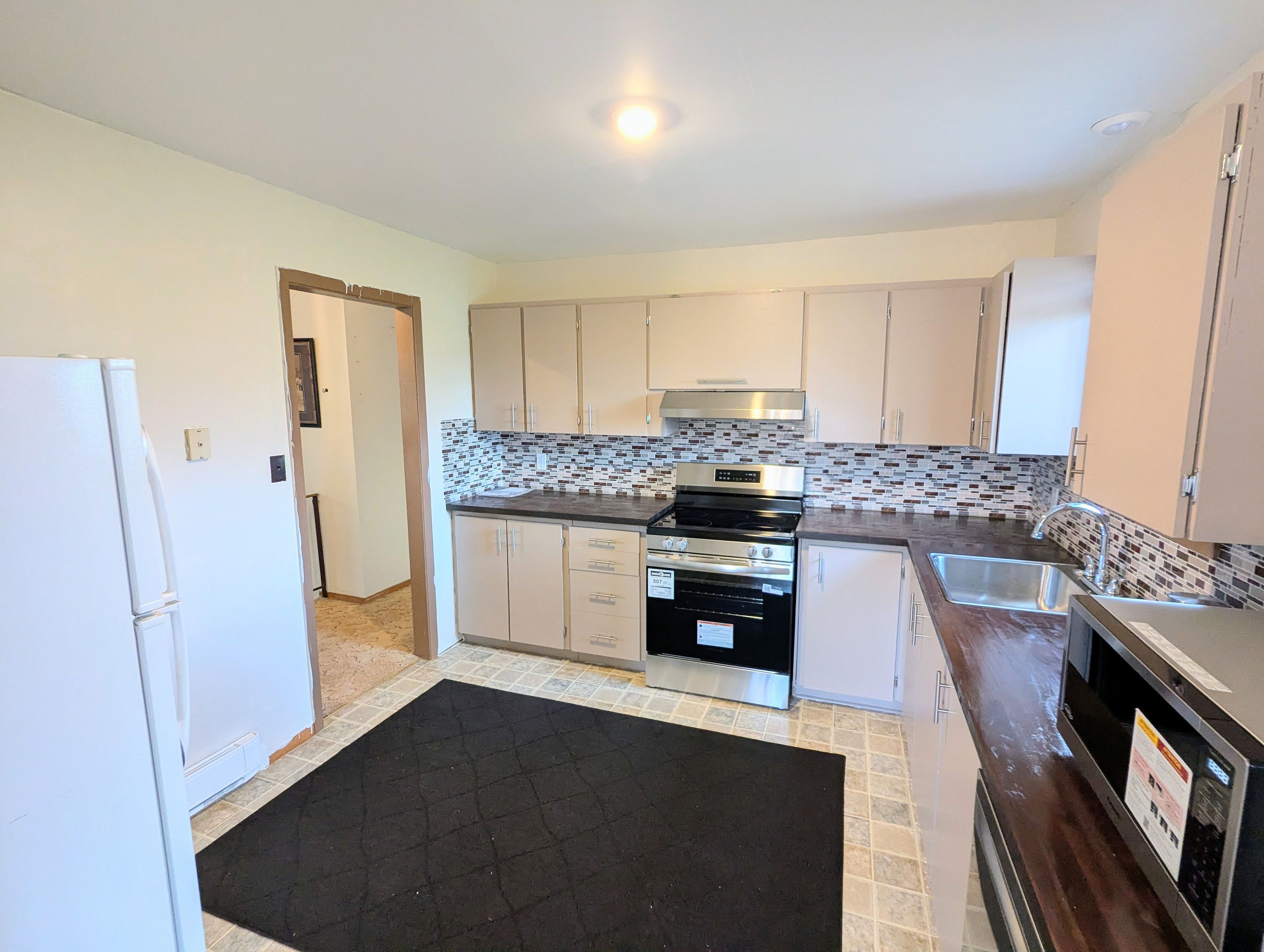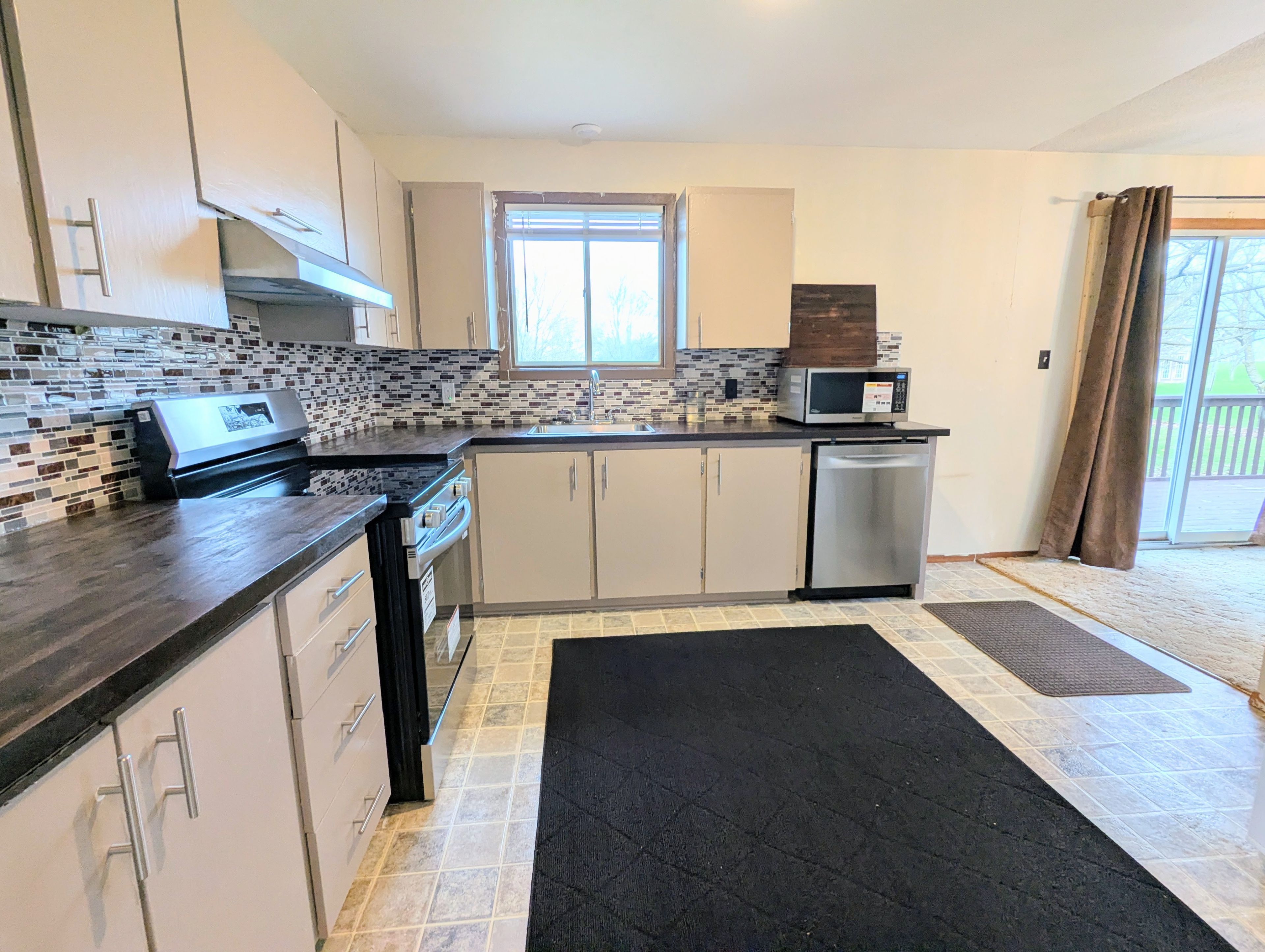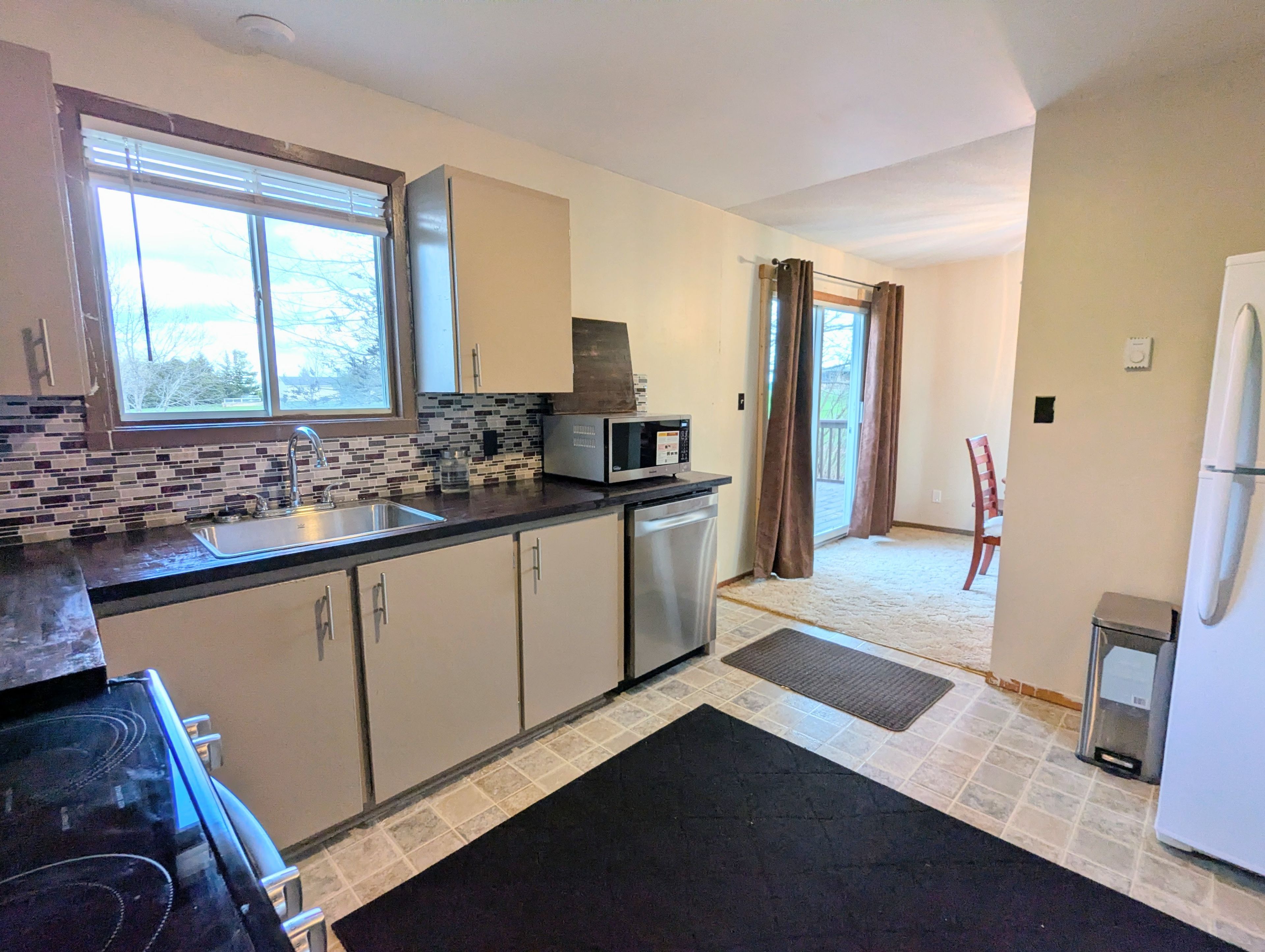 • Bright kitchen with new appliances, flowing into a dining area and backyard.
