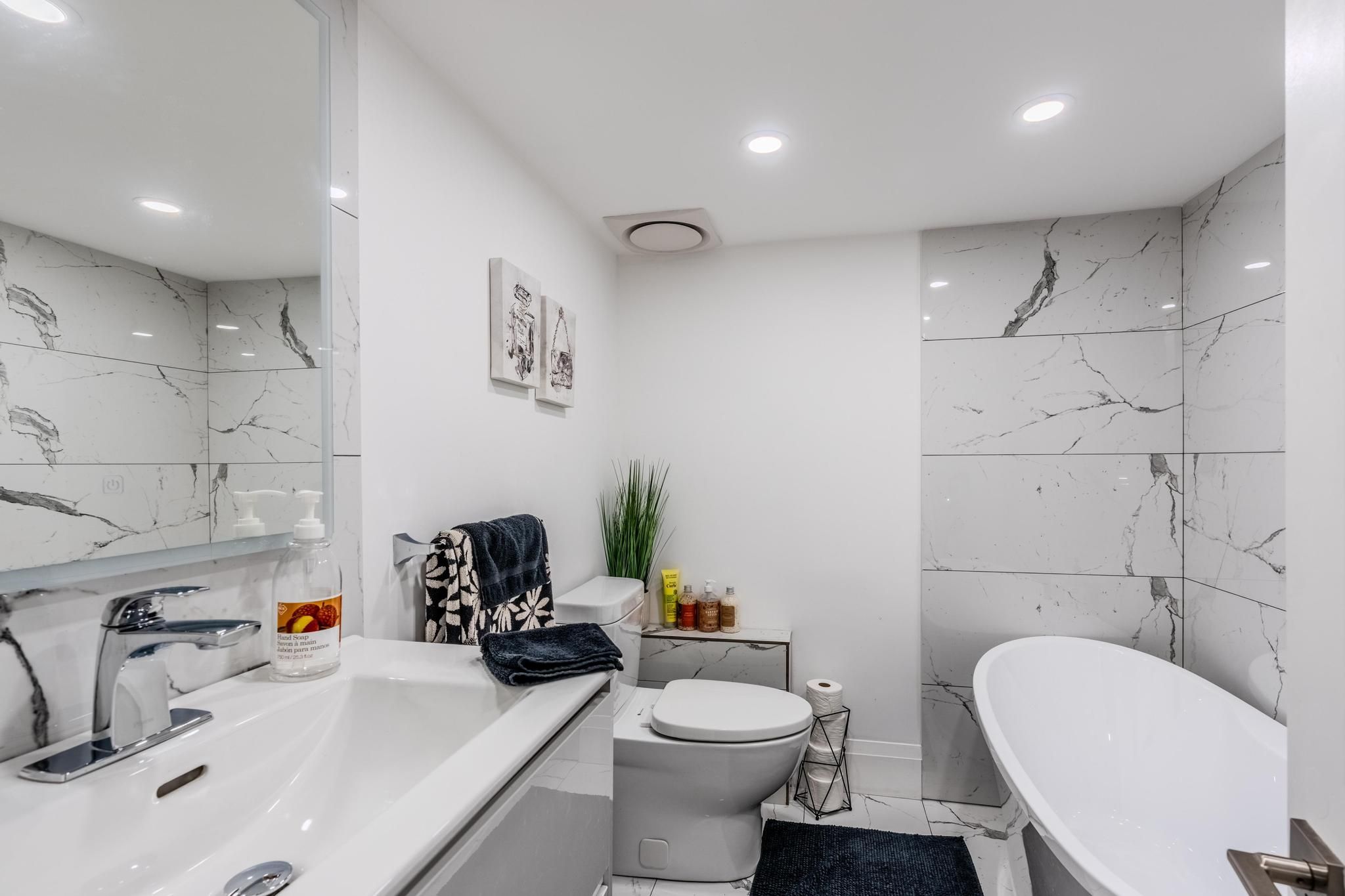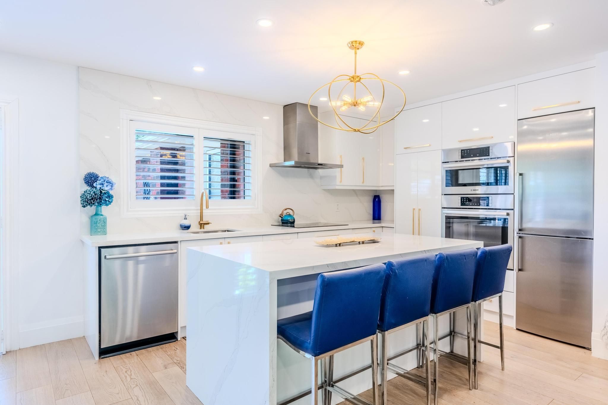 • Designer kitchen features quartz countertops and high-end stainless steel appliances.