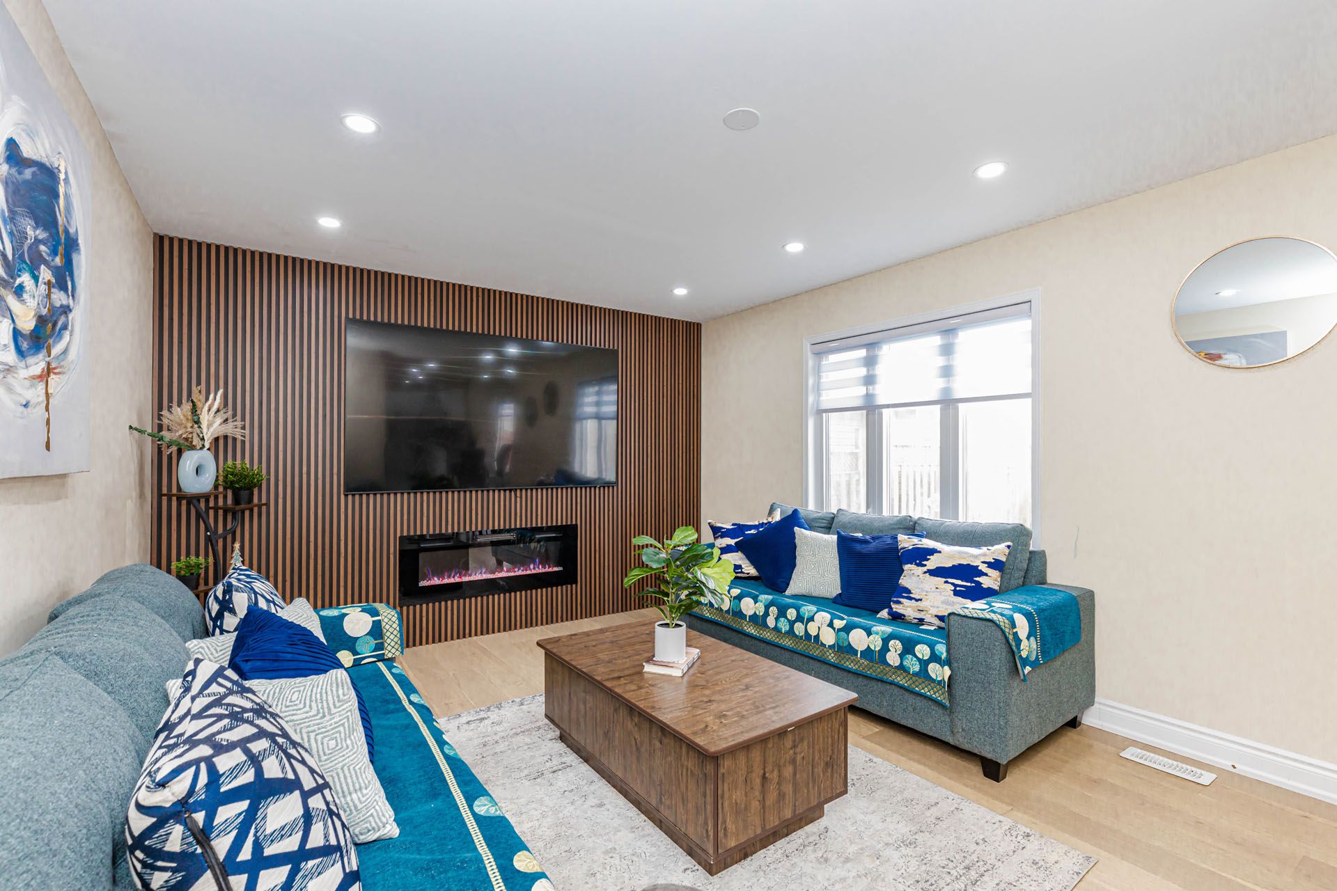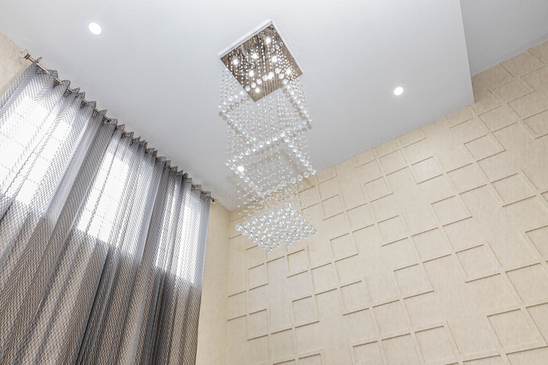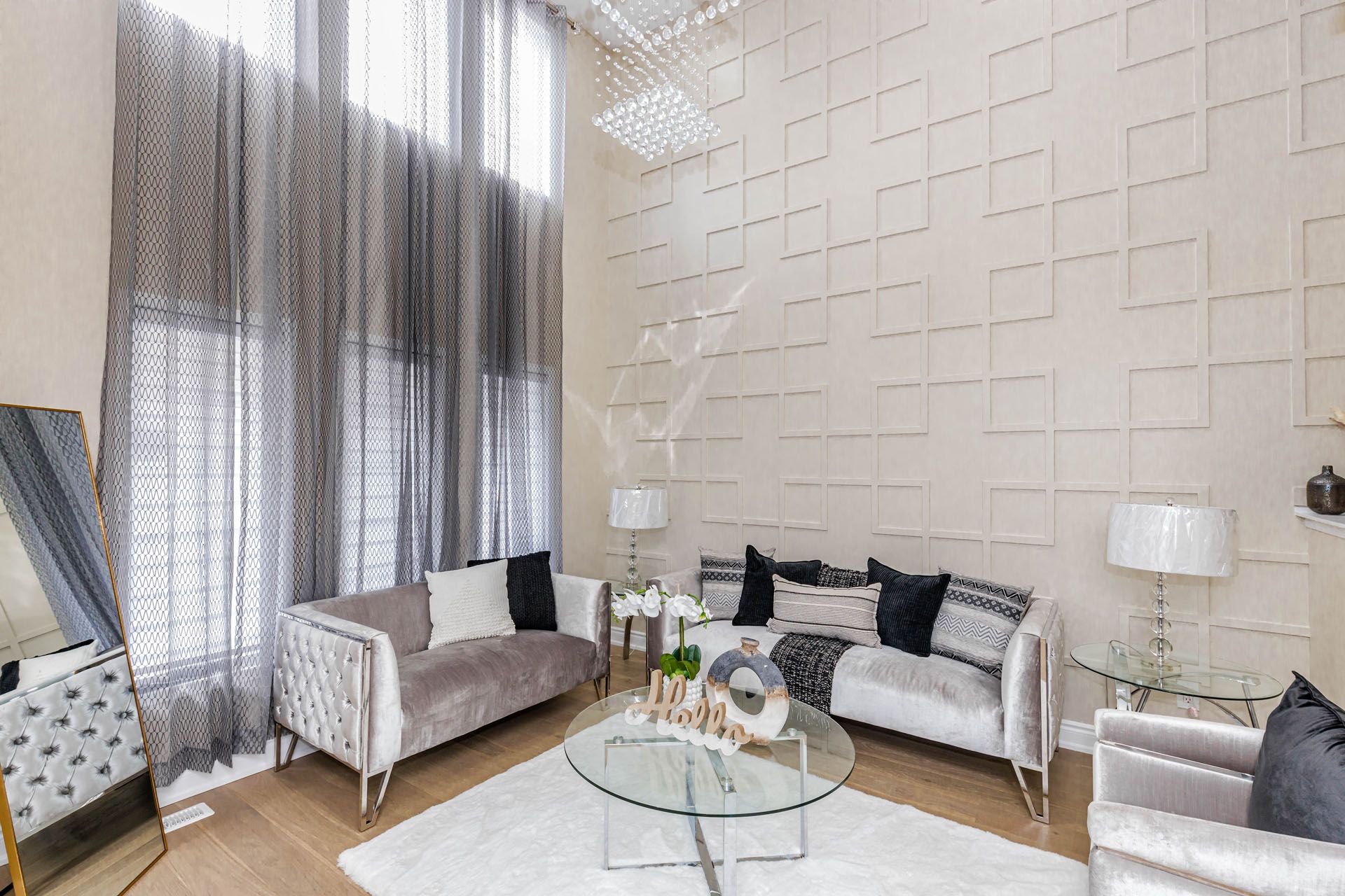 • Grand living room with a stunning chandelier and custom feature wall.