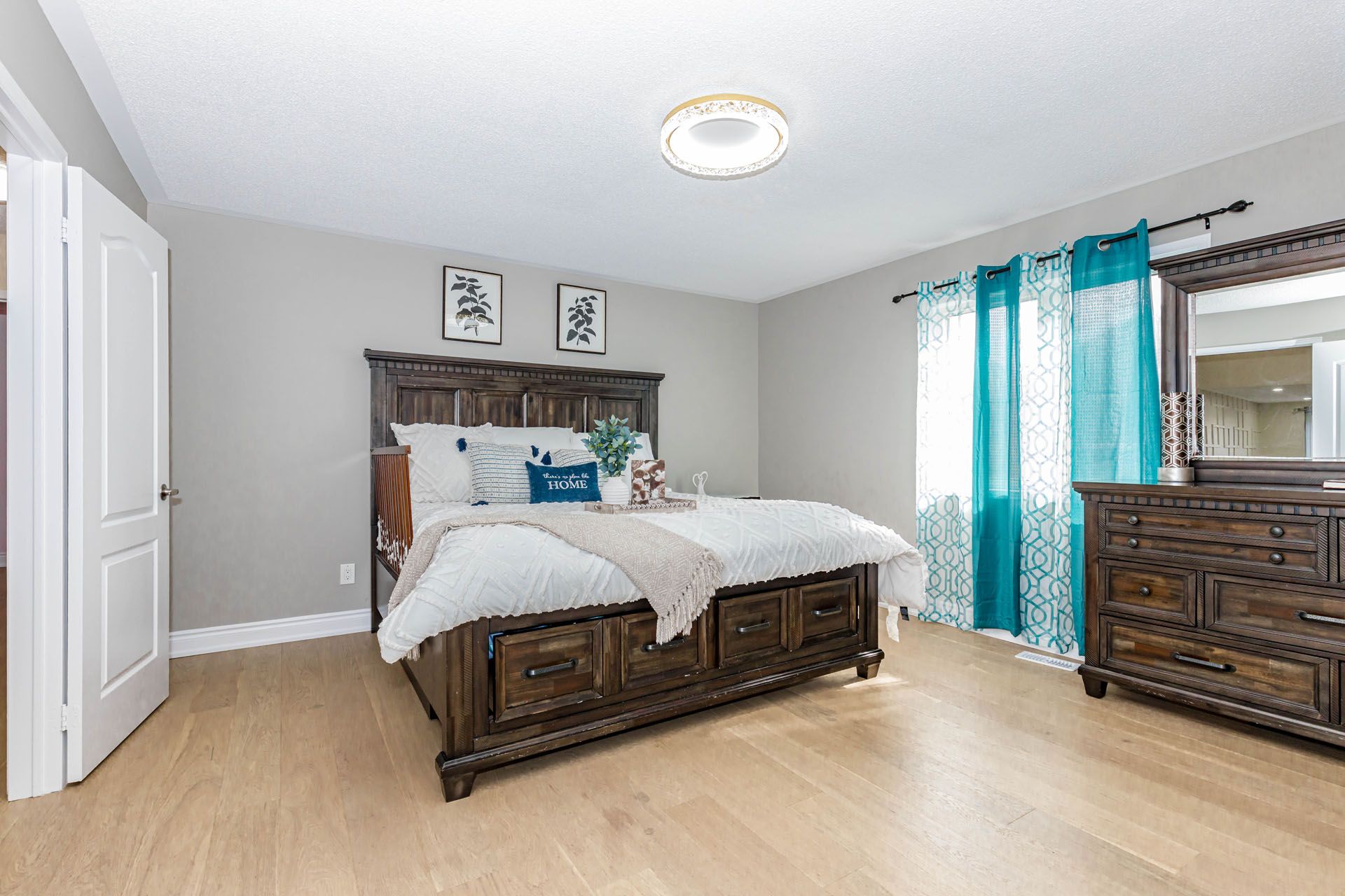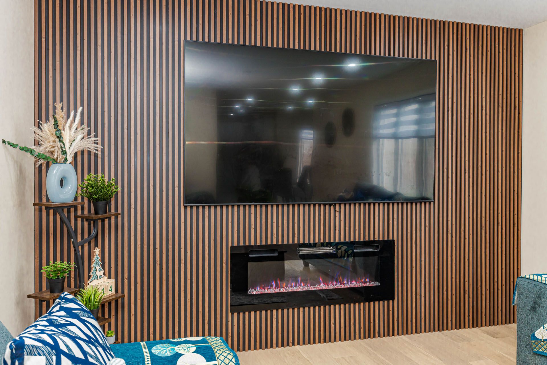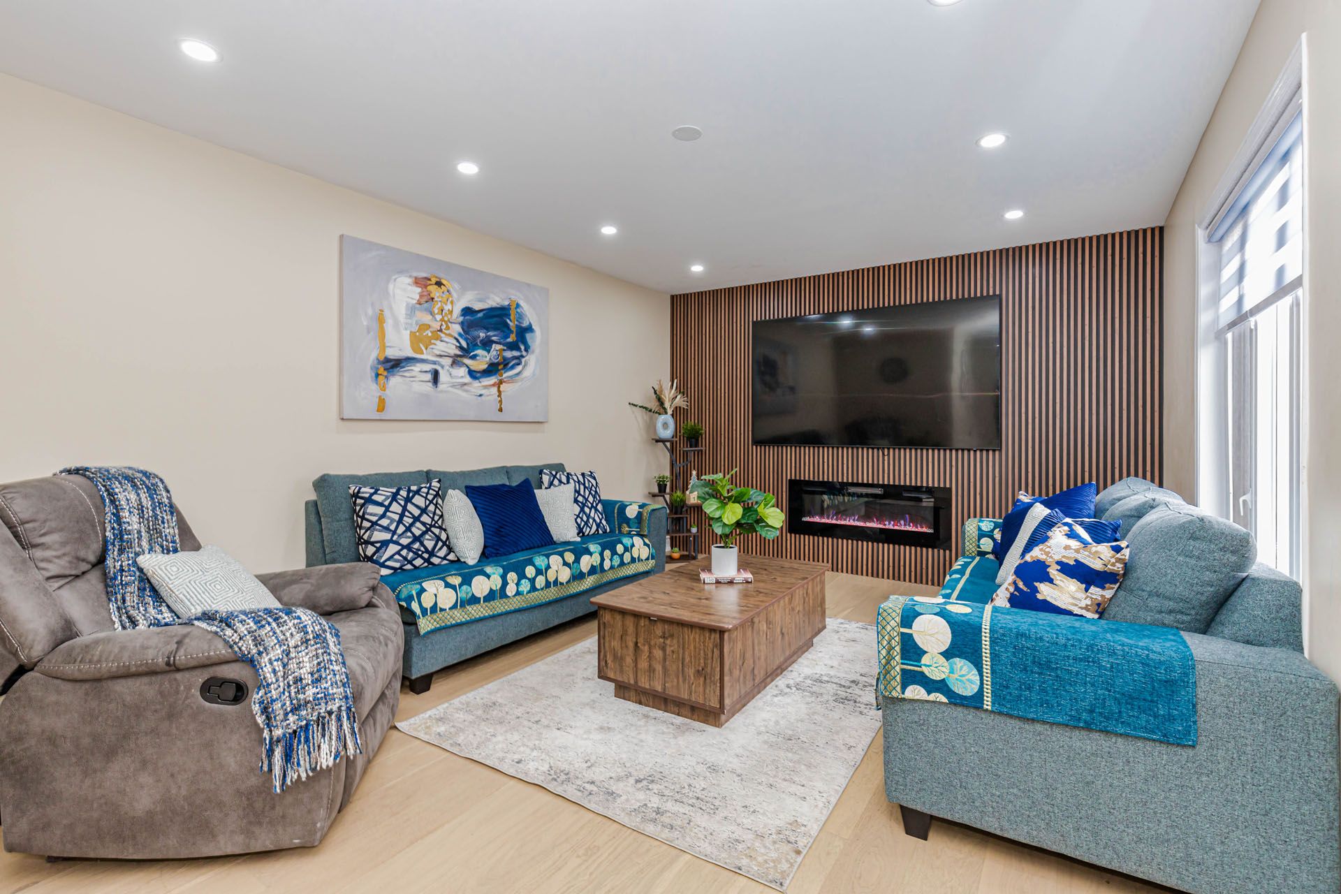 • Grand living room with a stunning chandelier and custom feature wall.