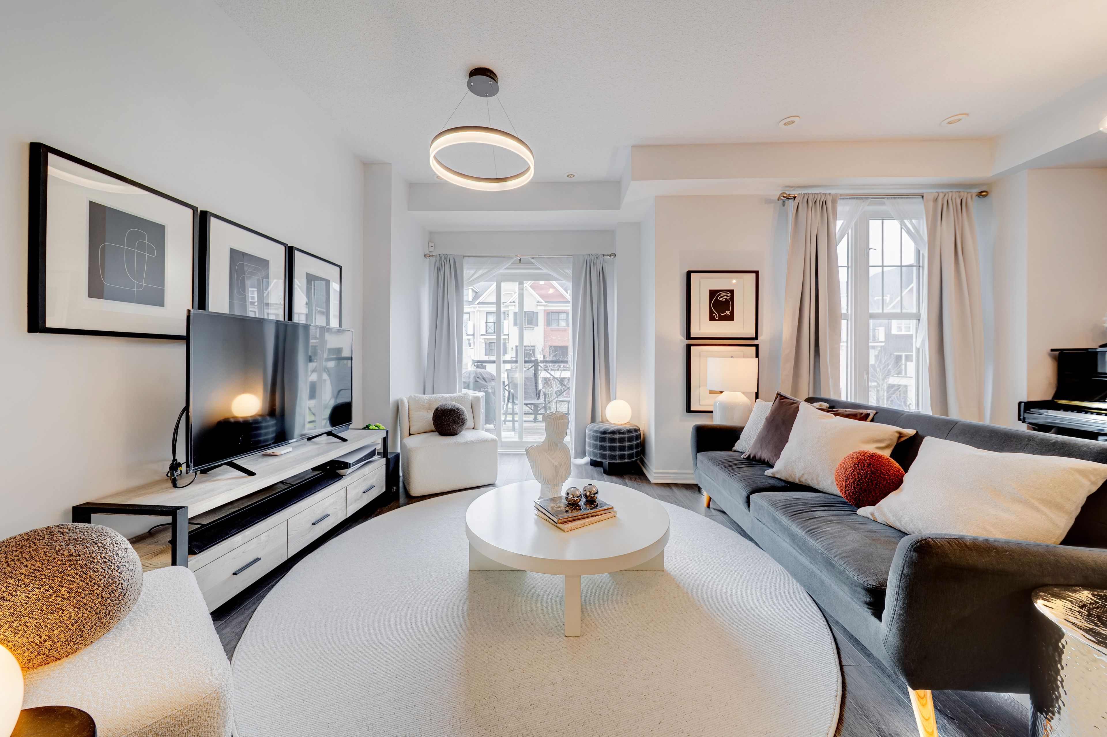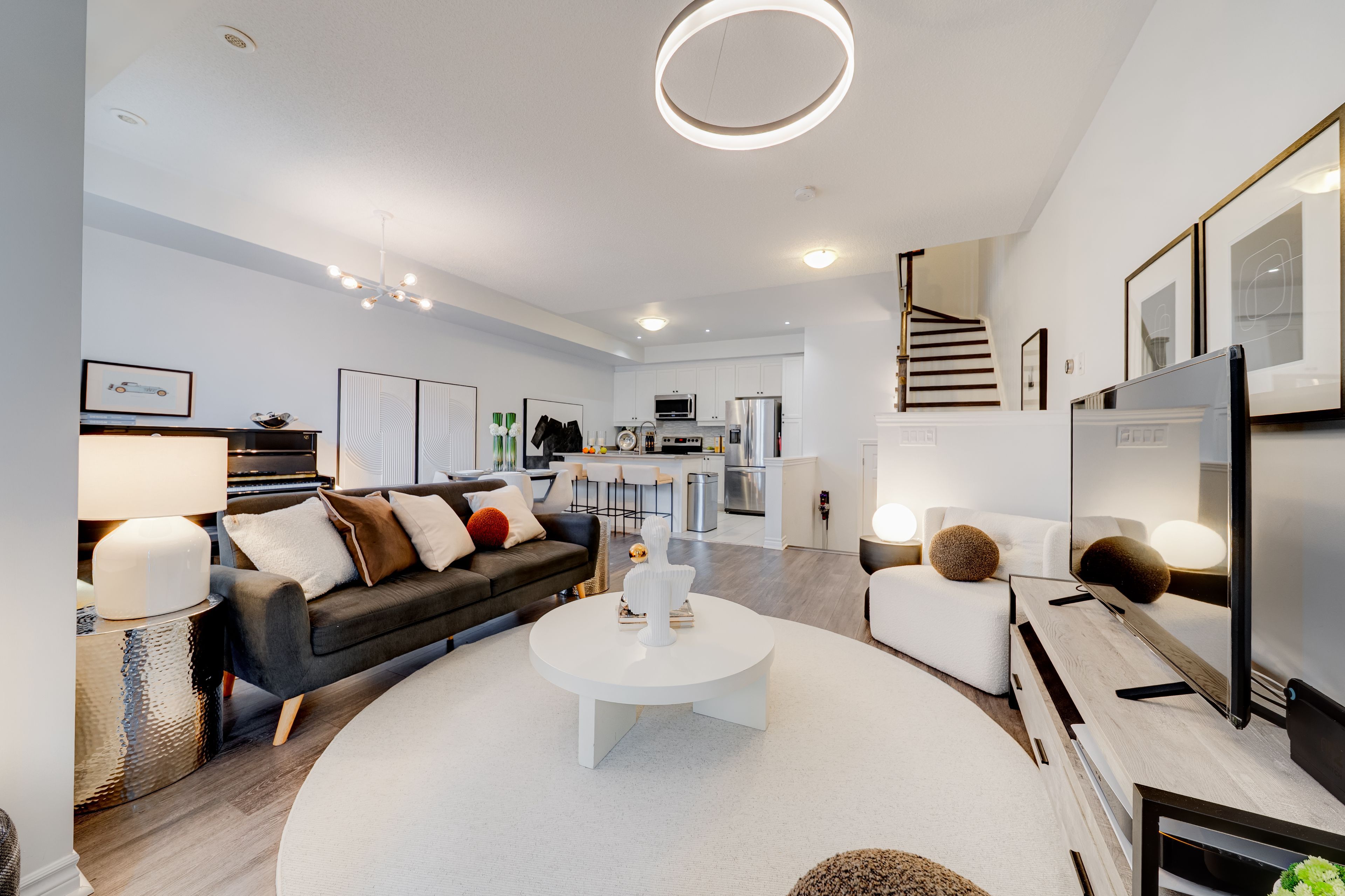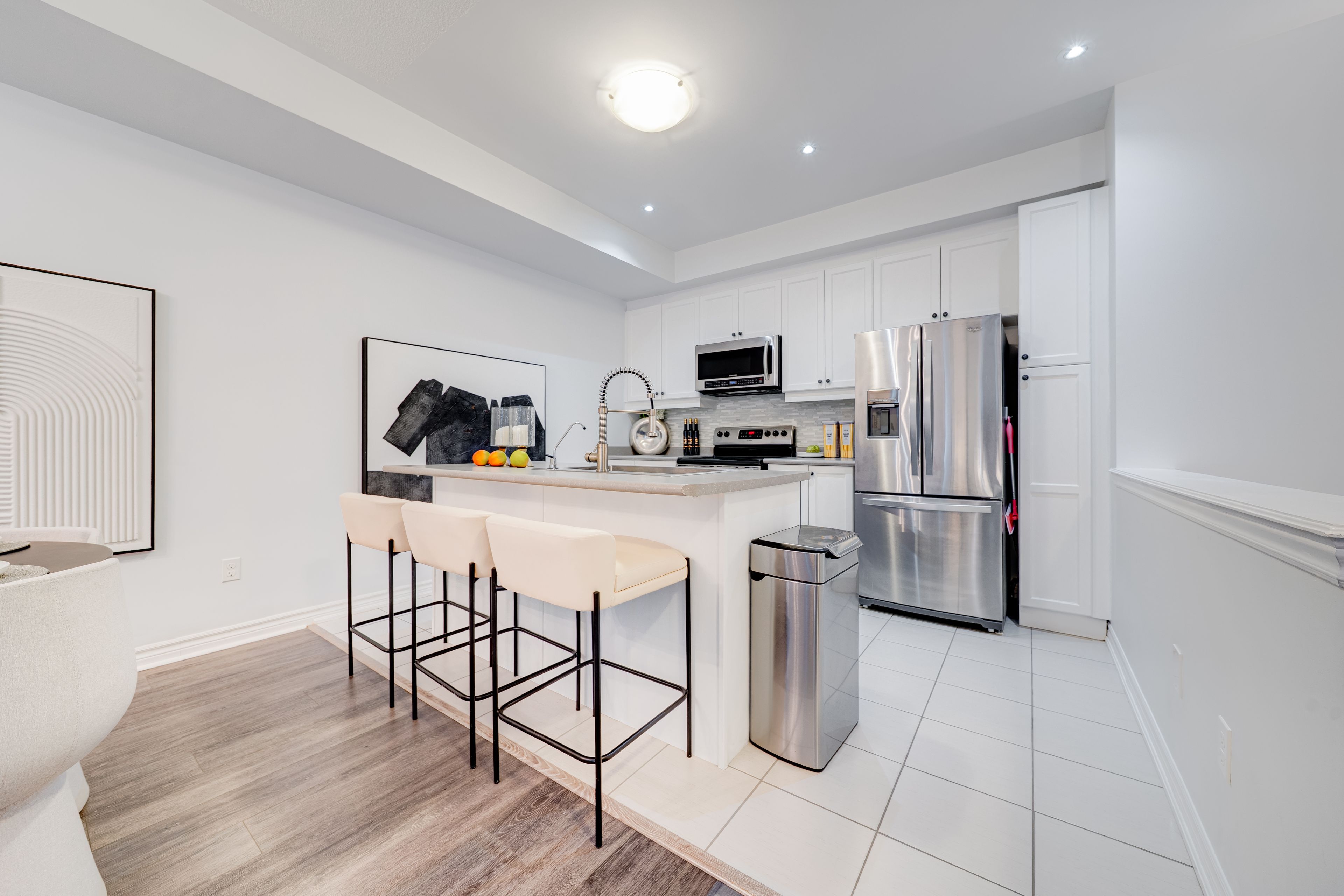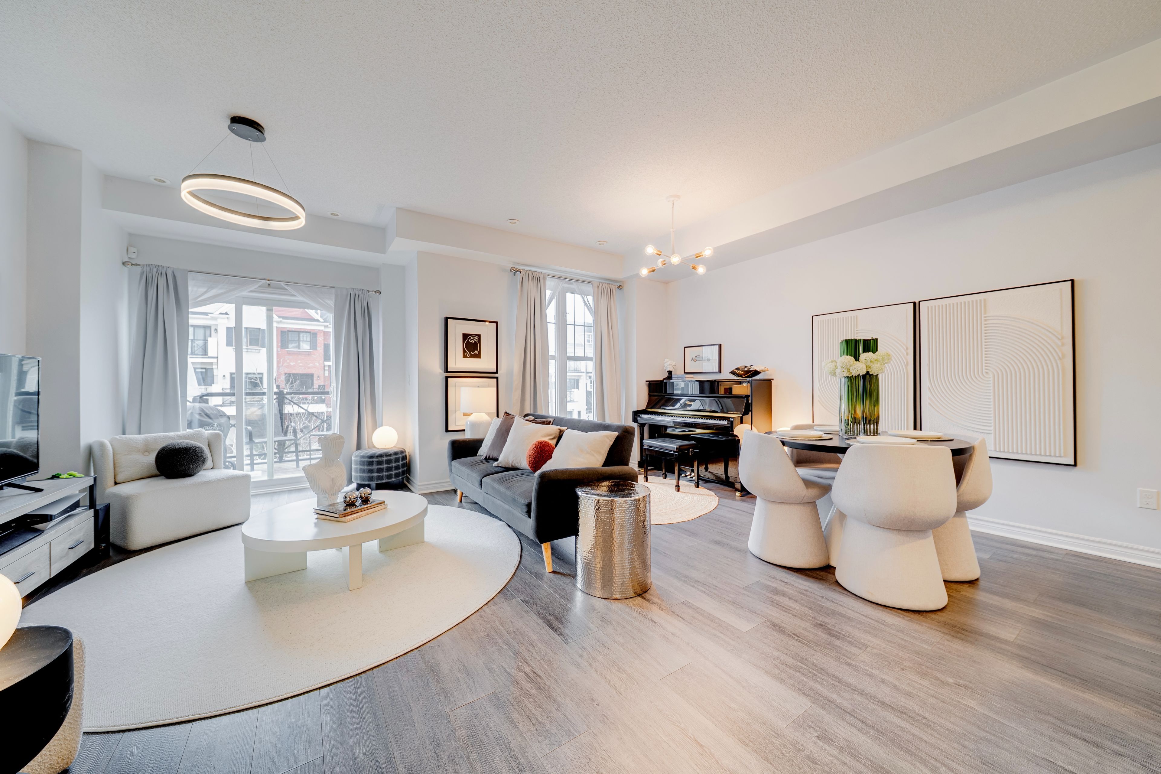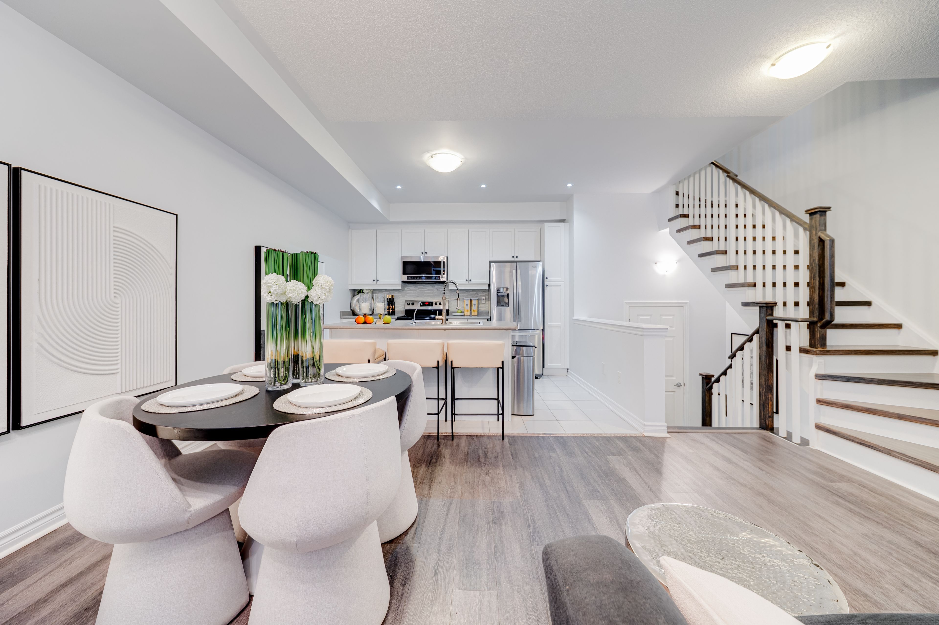 ** freehold townhome w/ no maintenance fees ** this beautifully designed 2 bedrooms, 3 bathrooms freehold townhome by minto offers stylish urban living in one of stouffville's most desirable communities. The bright, open concept features a spacious living & dining area complemented by a sleek, modern kitchen perfect for both everyday living and entertaining. 9 ft ceiling on main. Step out onto your private balcony, ideal for morning coffee, evening relaxation, or weekend bbqs. The primary bedroom boasts a 4 pcs ensuite, while the second bedroom is well served by its own 4 pcs bathroom, offering comfort and convenience for family or guests. The ground level provides practical functionality with interior access to the garage, a dedicated laundry area, & additional storage space. Enjoy parking for up to 3 vehicles, including a single car garage w/ extended depth (23 ft) and a driveway w/ no sidewalk offering added convenience & space. Ideally located just minutes from the stouffville go station, metro, longo's, no frills, walmart, parks, the community centre, library, and more, this home delivers exceptional walkability and lifestyle convenience. Move in ready &thoughtfully designed, it's a fantastic opportunity to own a modern home in a vibrant and growing neighborhood. 10 mins drive to hwy 404, 9 mins to markham, & 20 mins to york university markham campus. The most convenience location for living in stouffville.