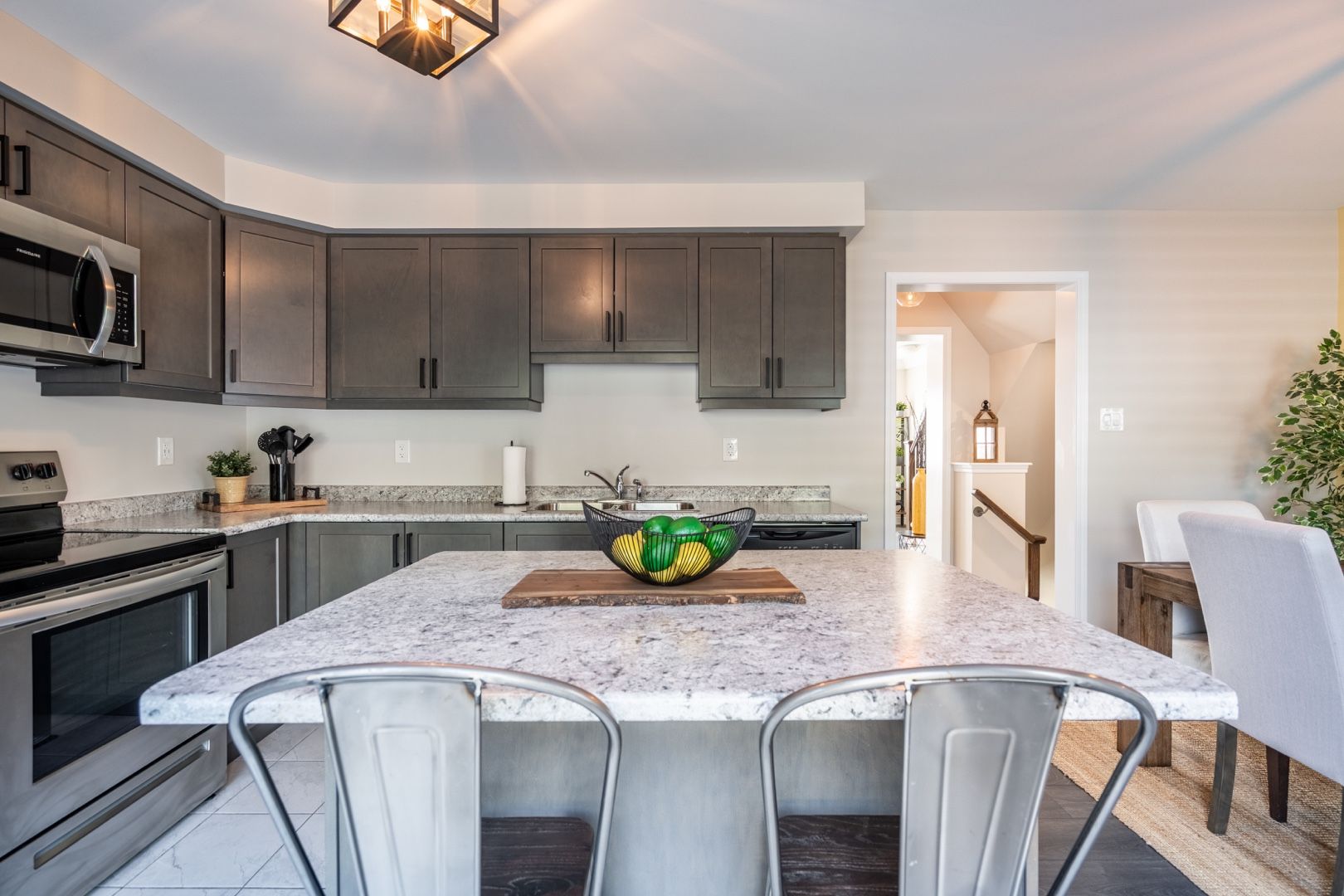 • Spacious eat-in kitchen with stainless-steel appliances and private terrace.