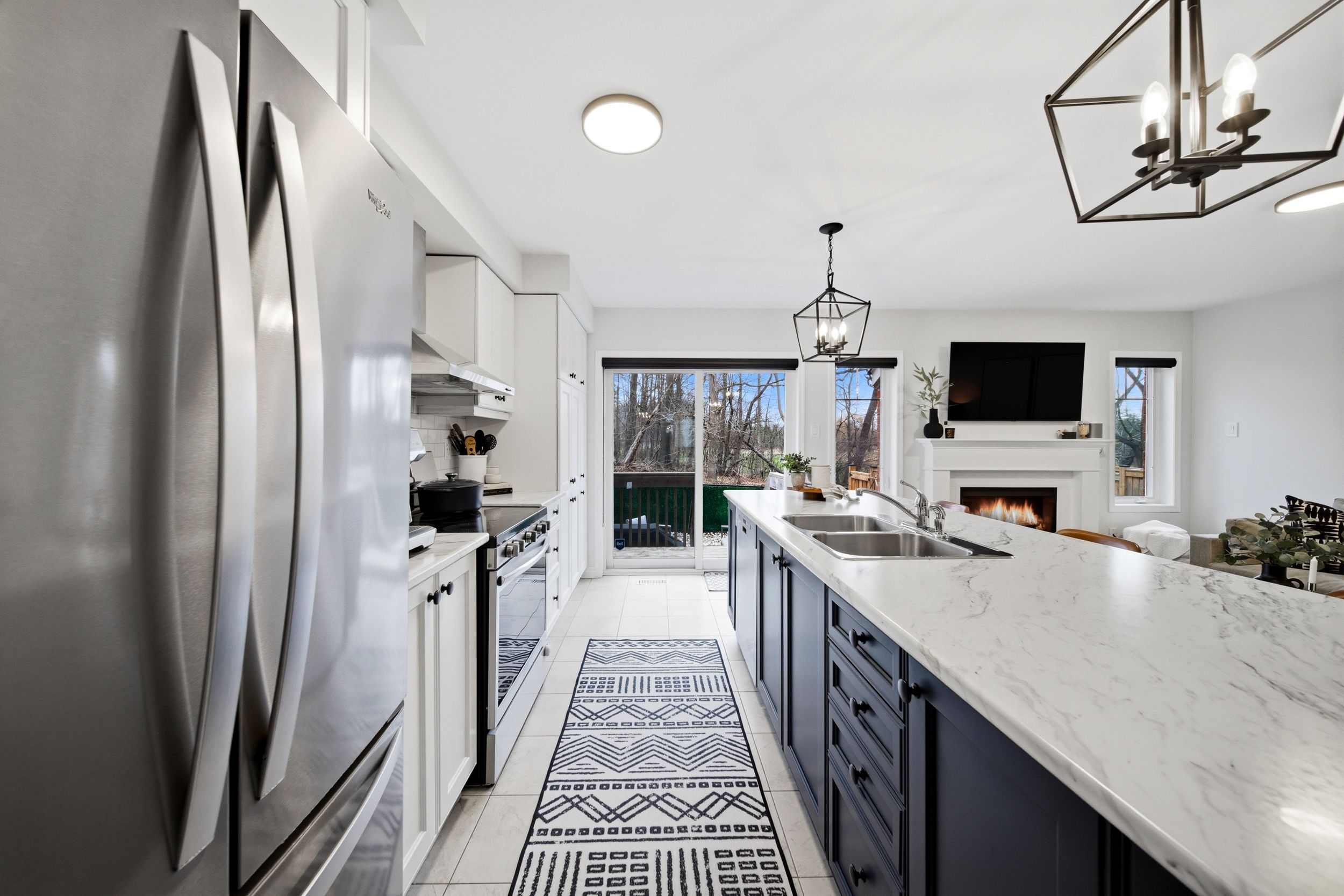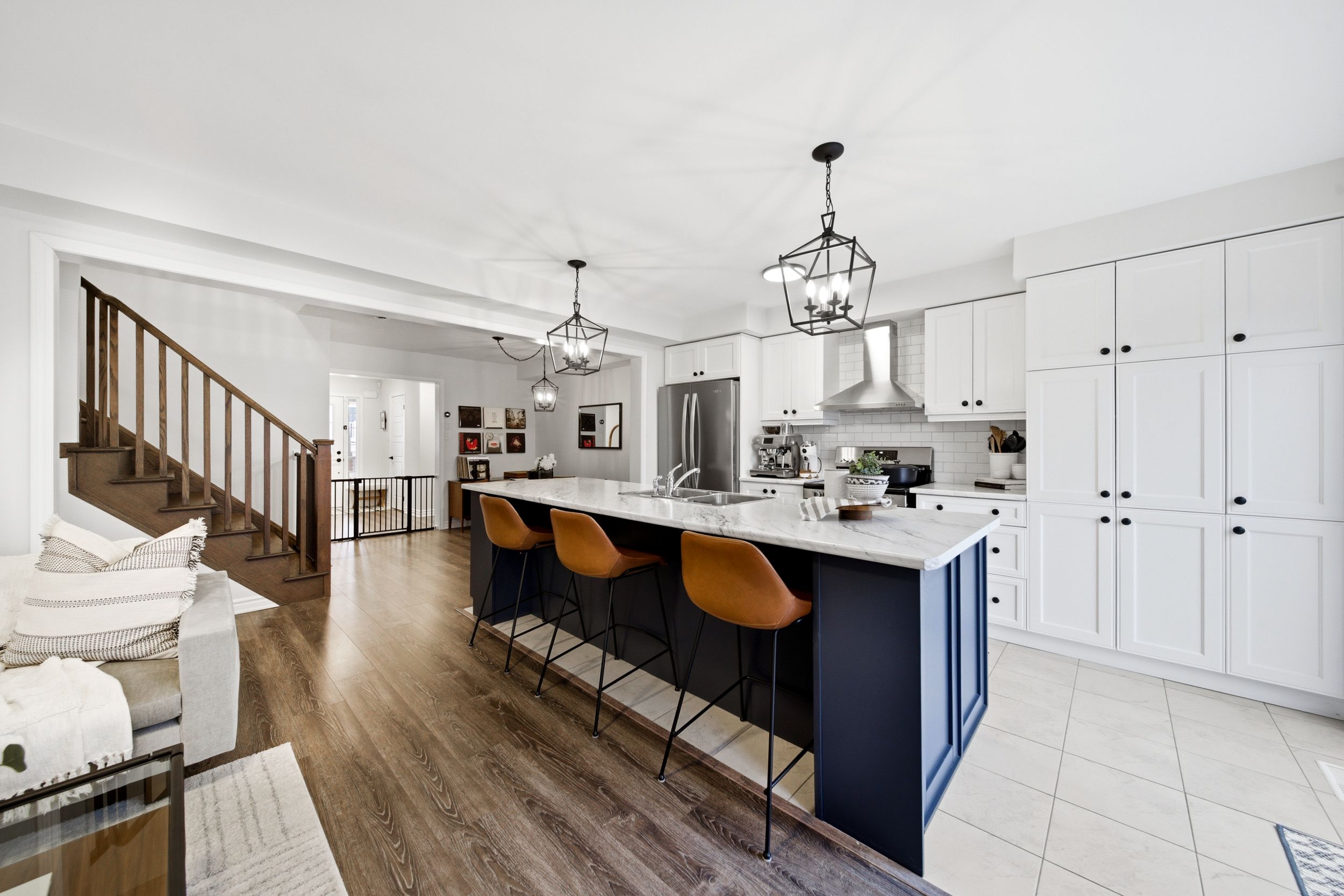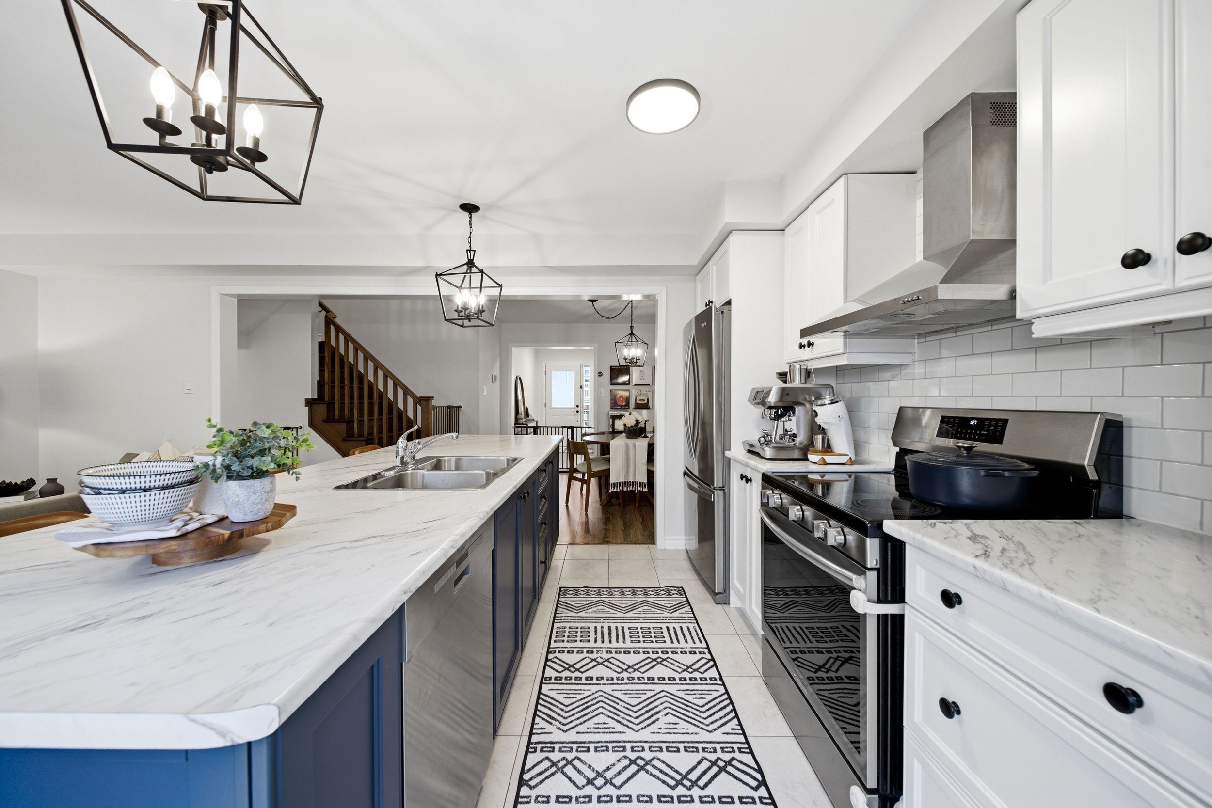 • Stylish kitchen equipped with stainless steel appliances and large eat-in island.