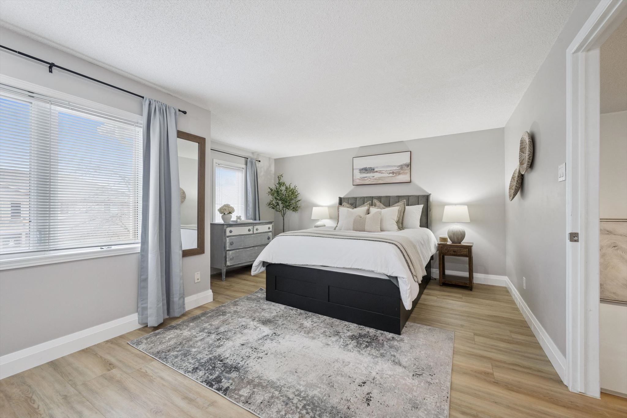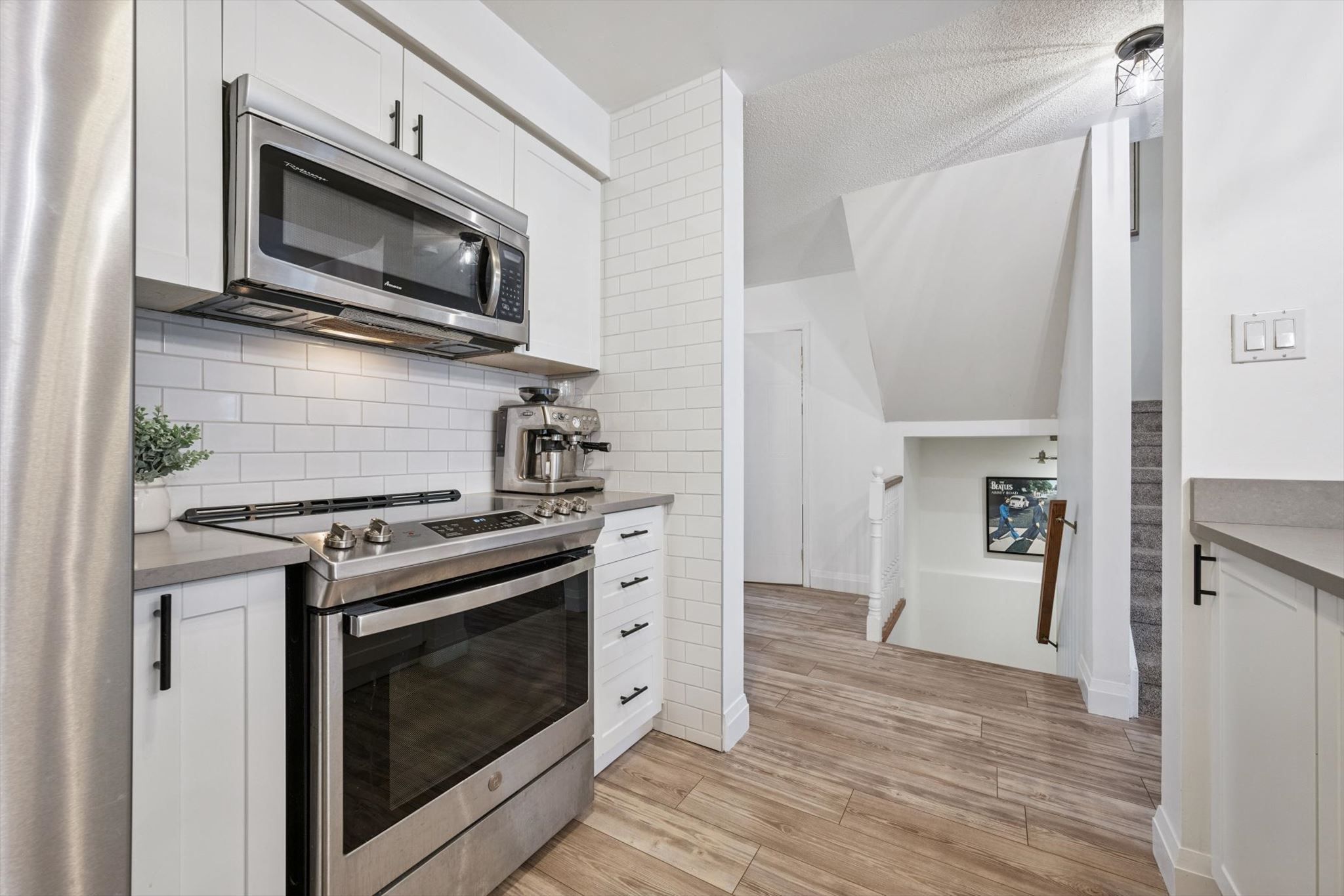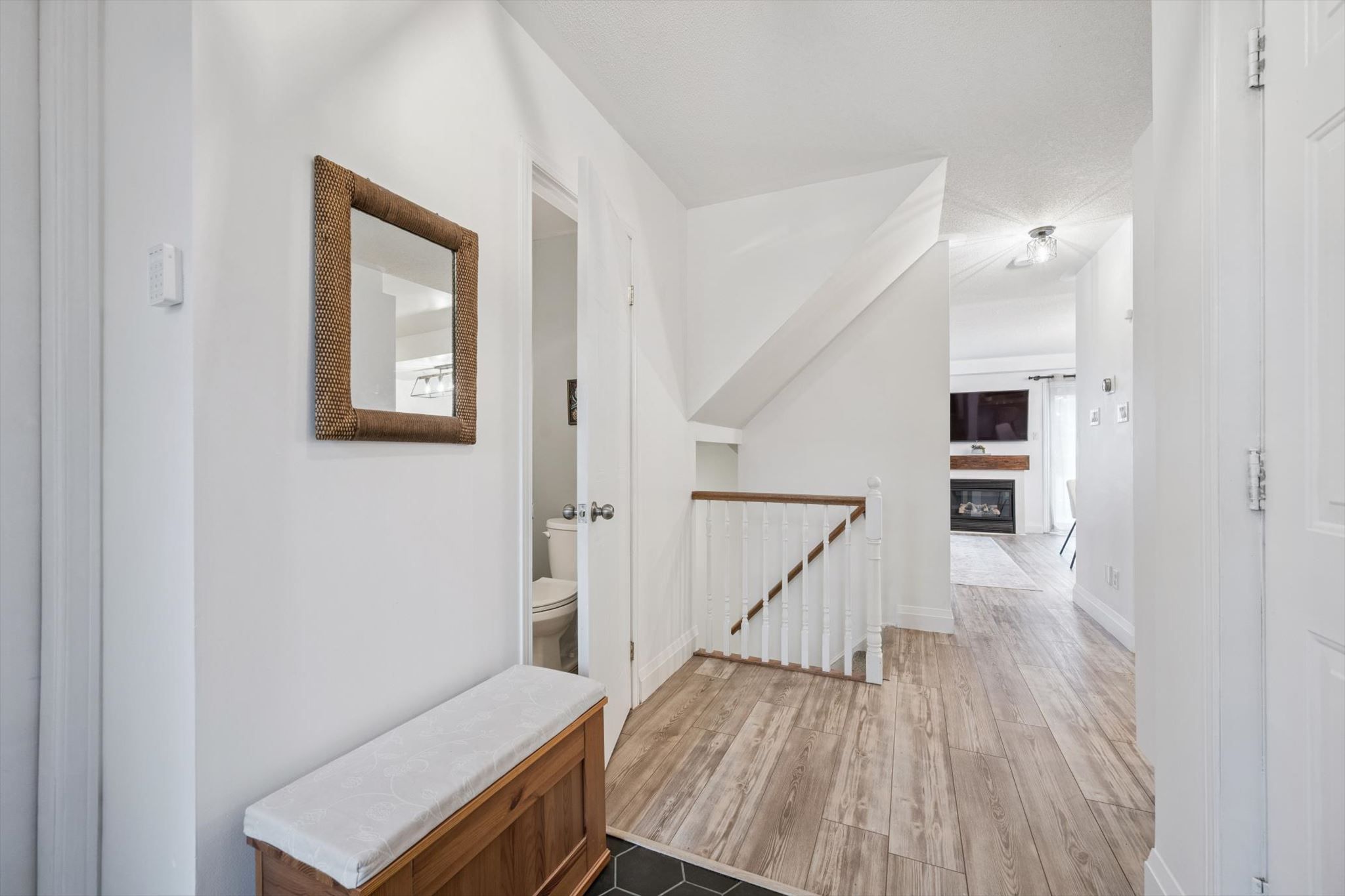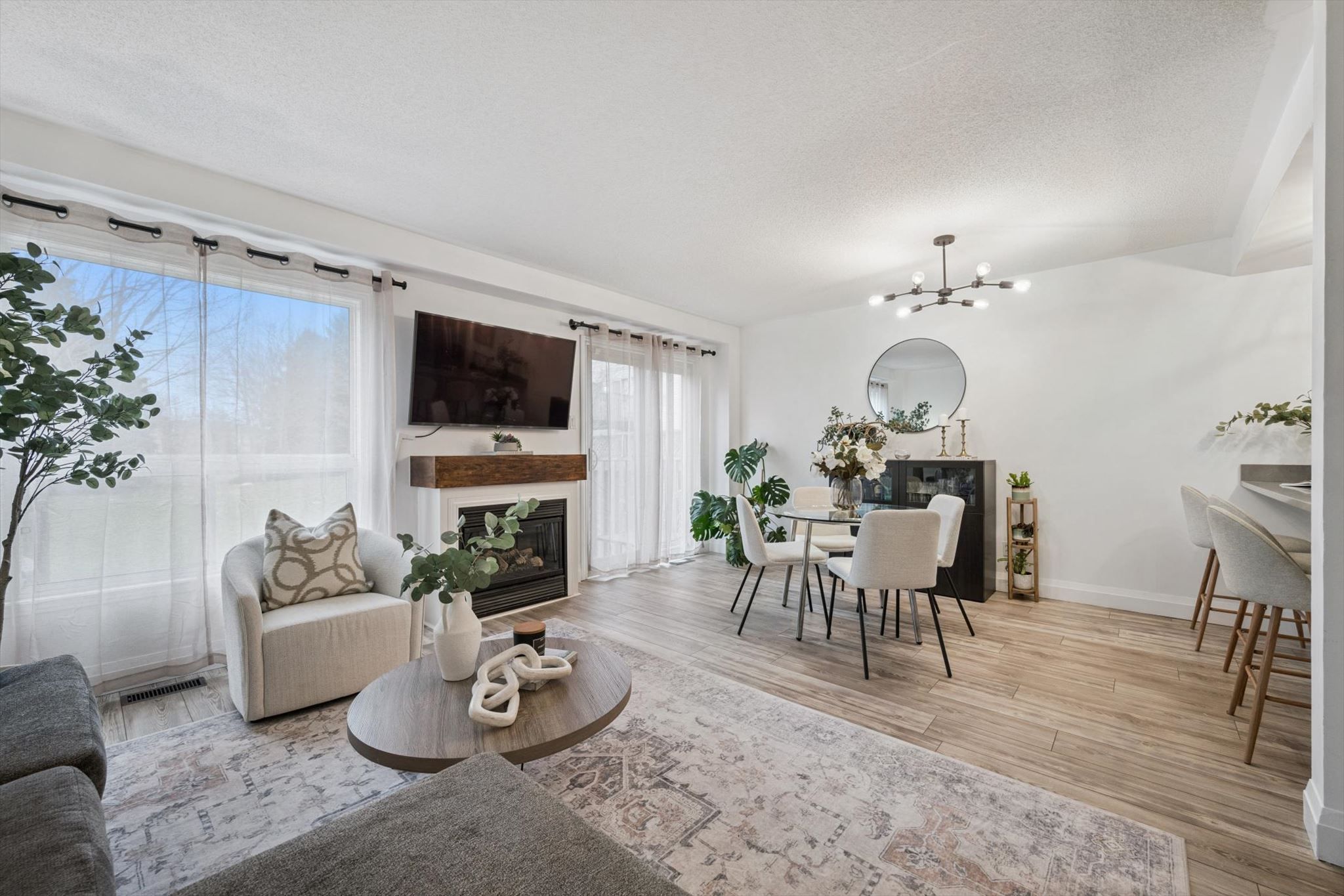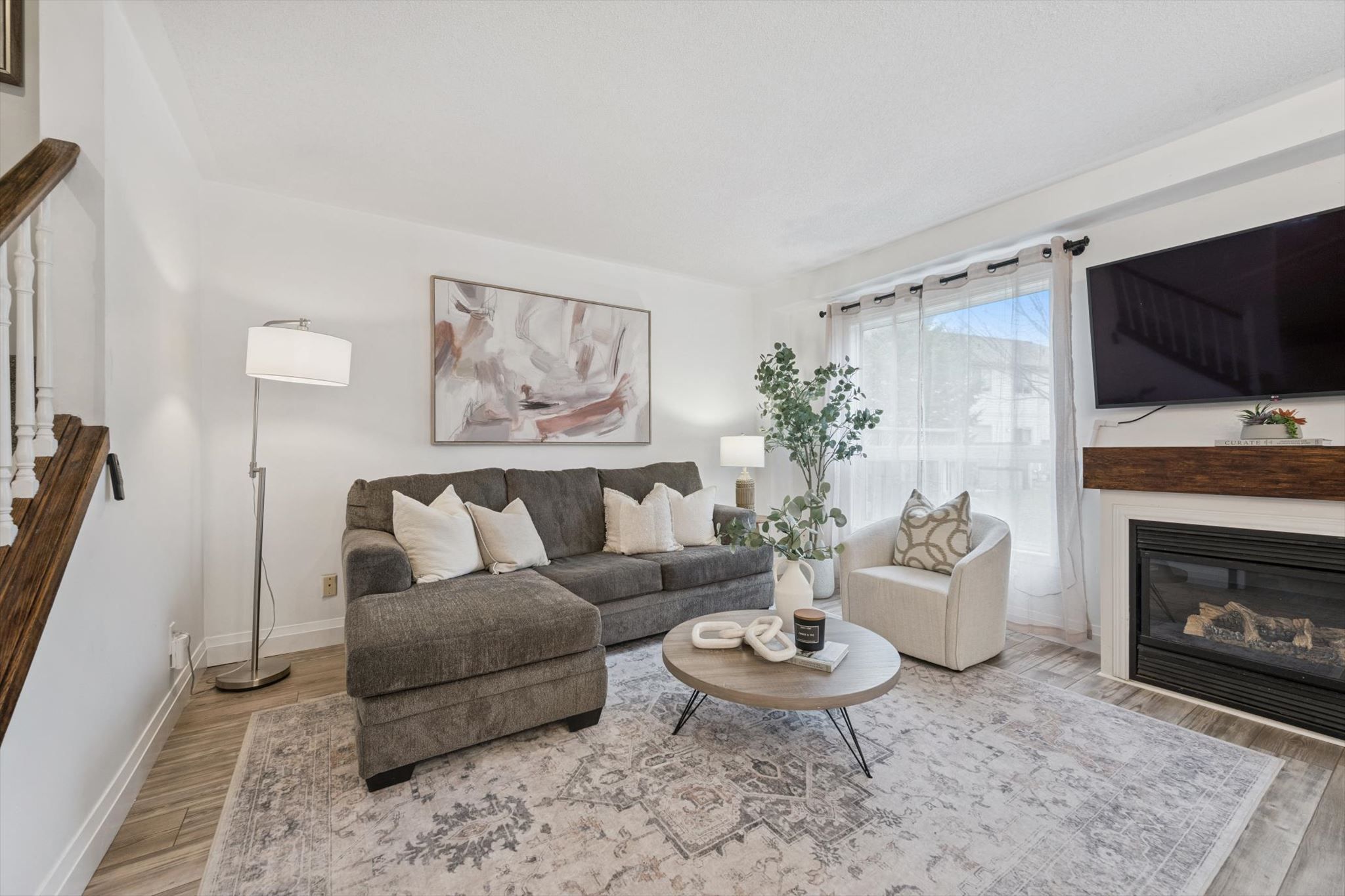 Backs onto mclennan park! This stunning, move-in ready 3-bedroom home is perfect for families or savvy investors, offering peaceful greenspace views and a private backyard patio with natural gas bbq hook-up. The bright, open-concept main floor showcases stylish new flooring throughout, a refreshed kitchen with modern backsplash and quartz counters, and an inviting living area anchored by a cozy gas fireplace. Upstairs, the spacious primary bedroom features his and her closets and ensuite access, plus two additional bedrooms. Both bathrooms have been beautifully renovated with fresh, contemporary finishes. The basement extends your living space with a versatile rec room ideal for relaxing or entertaining, as well as ample storage. Enjoy peace or mind with major updates, including newer fridge, stove, washer, and dryer, along with an owned water softener and whole-home humidifier. Lighting upgrades throughout enhance key areas of the home. Complete with a garage, private driveway, low condo fees, and close proximity to schools, shopping, transit, and trails, this exceptional home blends comfort, style and convenience - don't miss your opportunity!