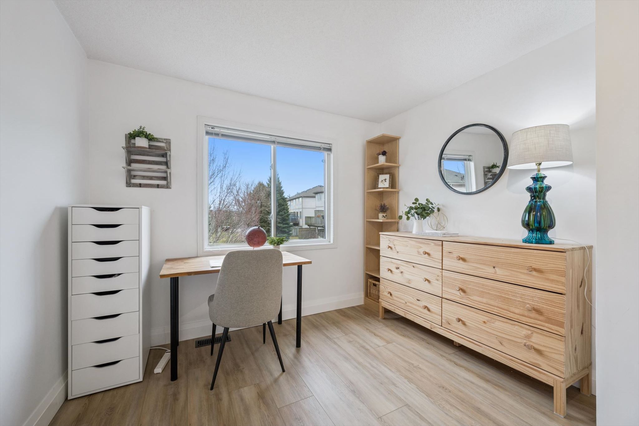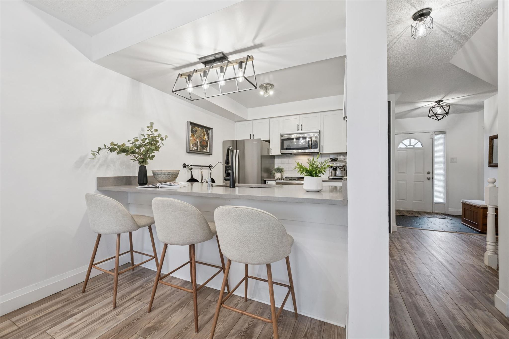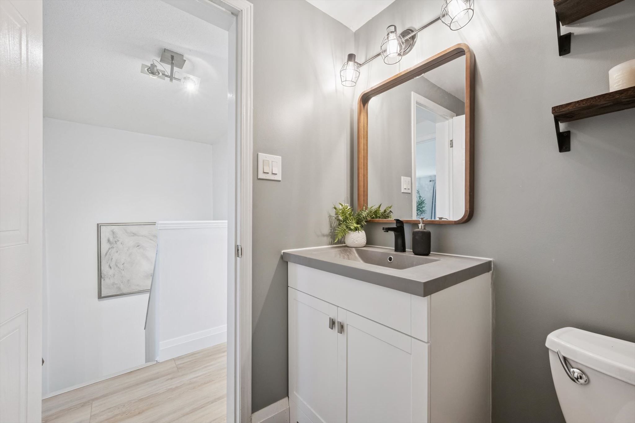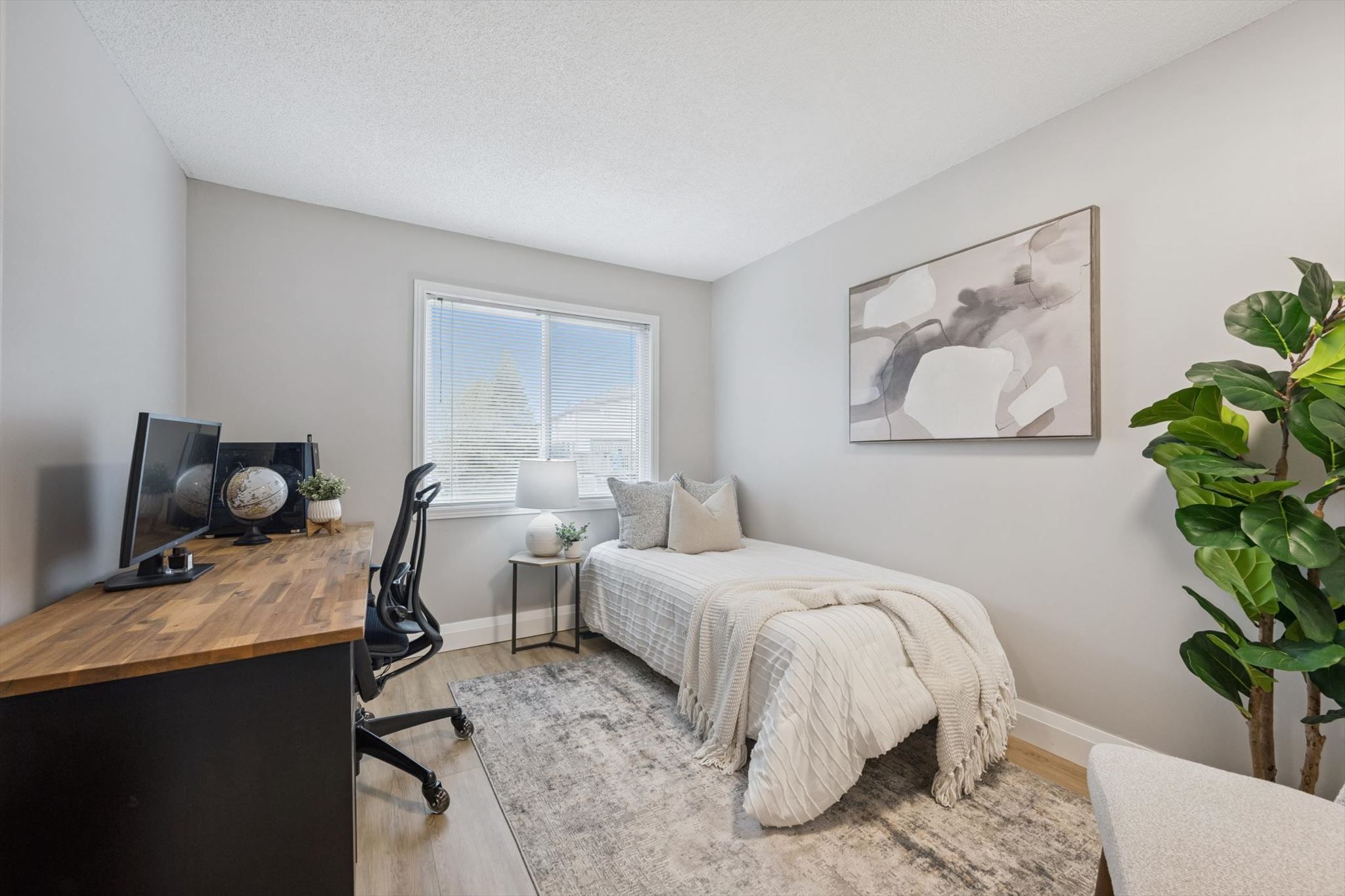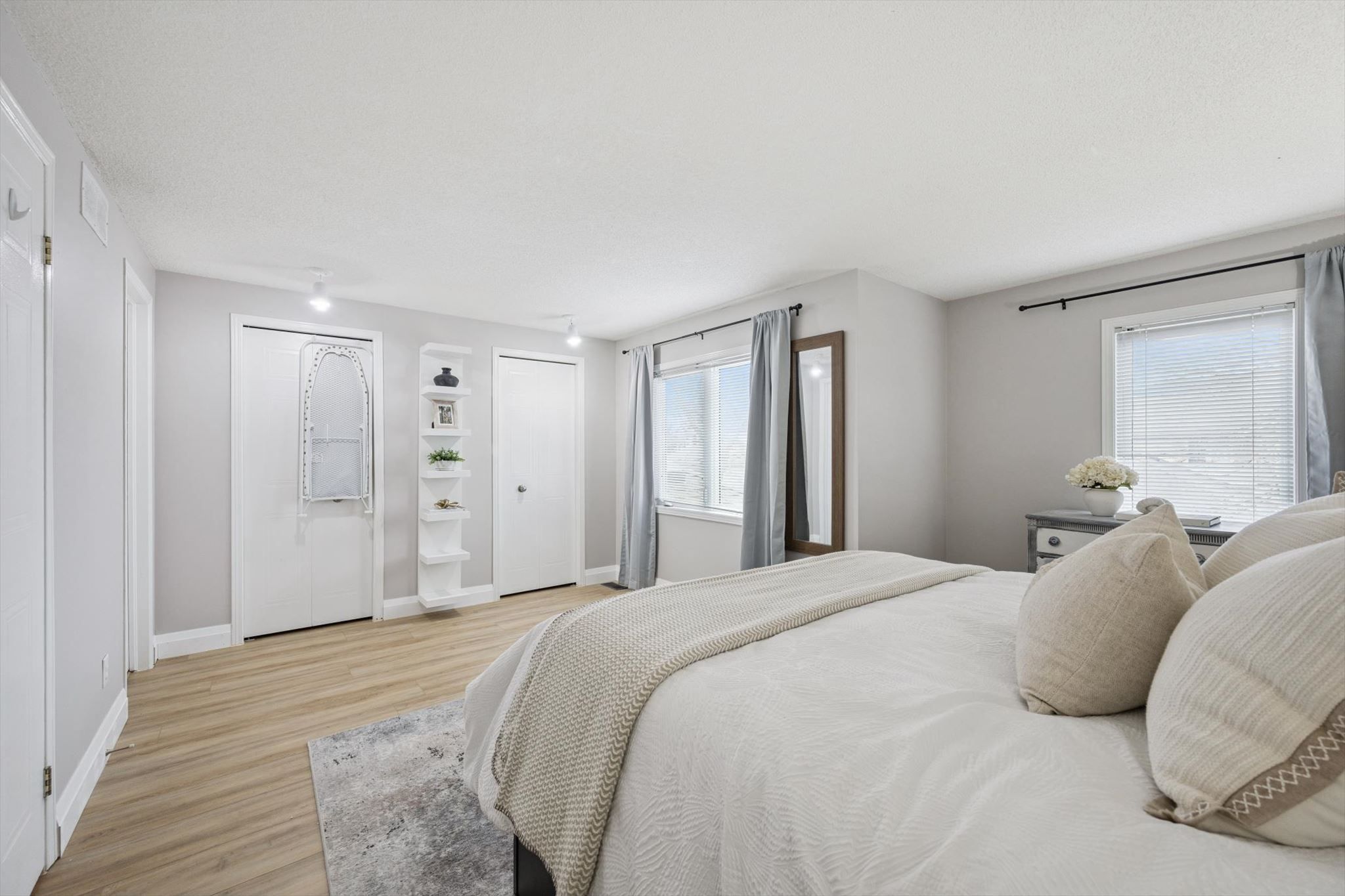 Backs onto mclennan park! This stunning, move-in ready 3-bedroom home is perfect for families or savvy investors, offering peaceful greenspace views and a private backyard patio with natural gas bbq hook-up. The bright, open-concept main floor showcases stylish new flooring throughout, a refreshed kitchen with modern backsplash and quartz counters, and an inviting living area anchored by a cozy gas fireplace. Upstairs, the spacious primary bedroom features his and her closets and ensuite access, plus two additional bedrooms. Both bathrooms have been beautifully renovated with fresh, contemporary finishes. The basement extends your living space with a versatile rec room ideal for relaxing or entertaining, as well as ample storage. Enjoy peace or mind with major updates, including newer fridge, stove, washer, and dryer, along with an owned water softener and whole-home humidifier. Lighting upgrades throughout enhance key areas of the home. Complete with a garage, private driveway, low condo fees, and close proximity to schools, shopping, transit, and trails, this exceptional home blends comfort, style and convenience - don't miss your opportunity!