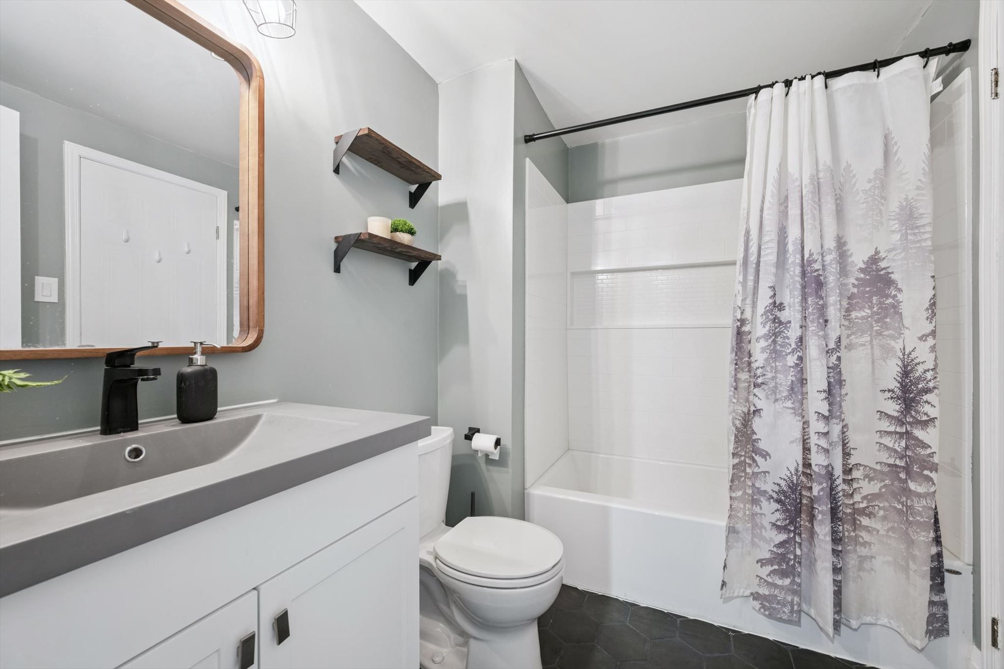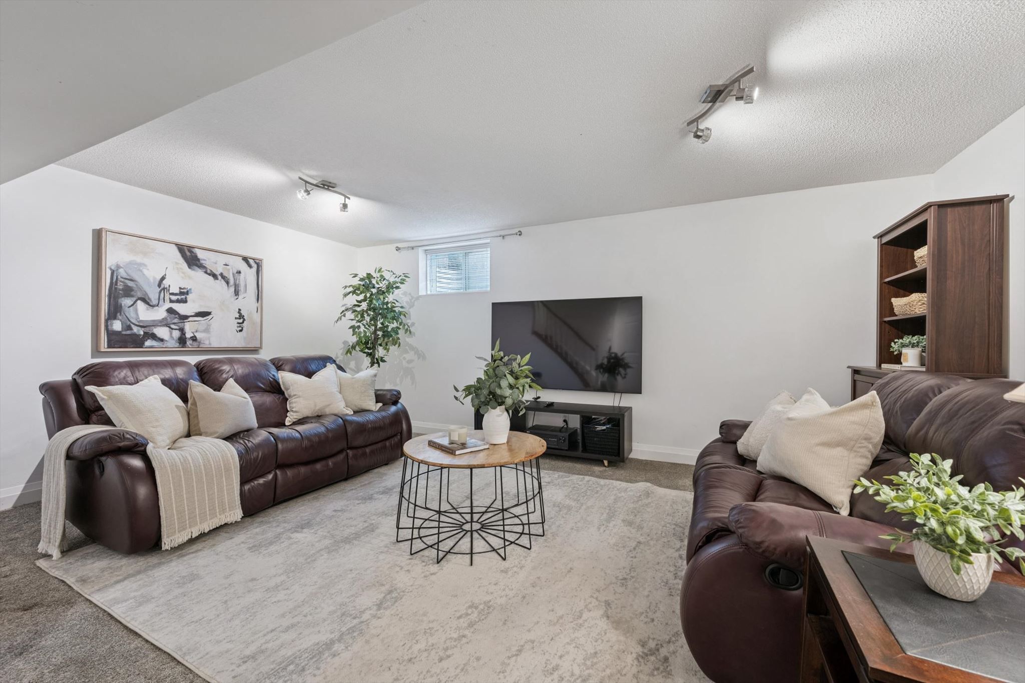 • Versatile basement rec room perfect for relaxing or entertaining with extra storage.