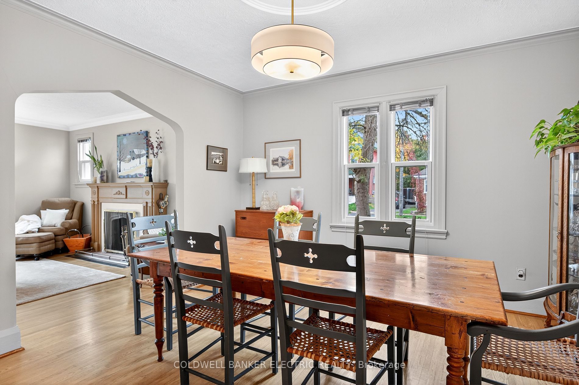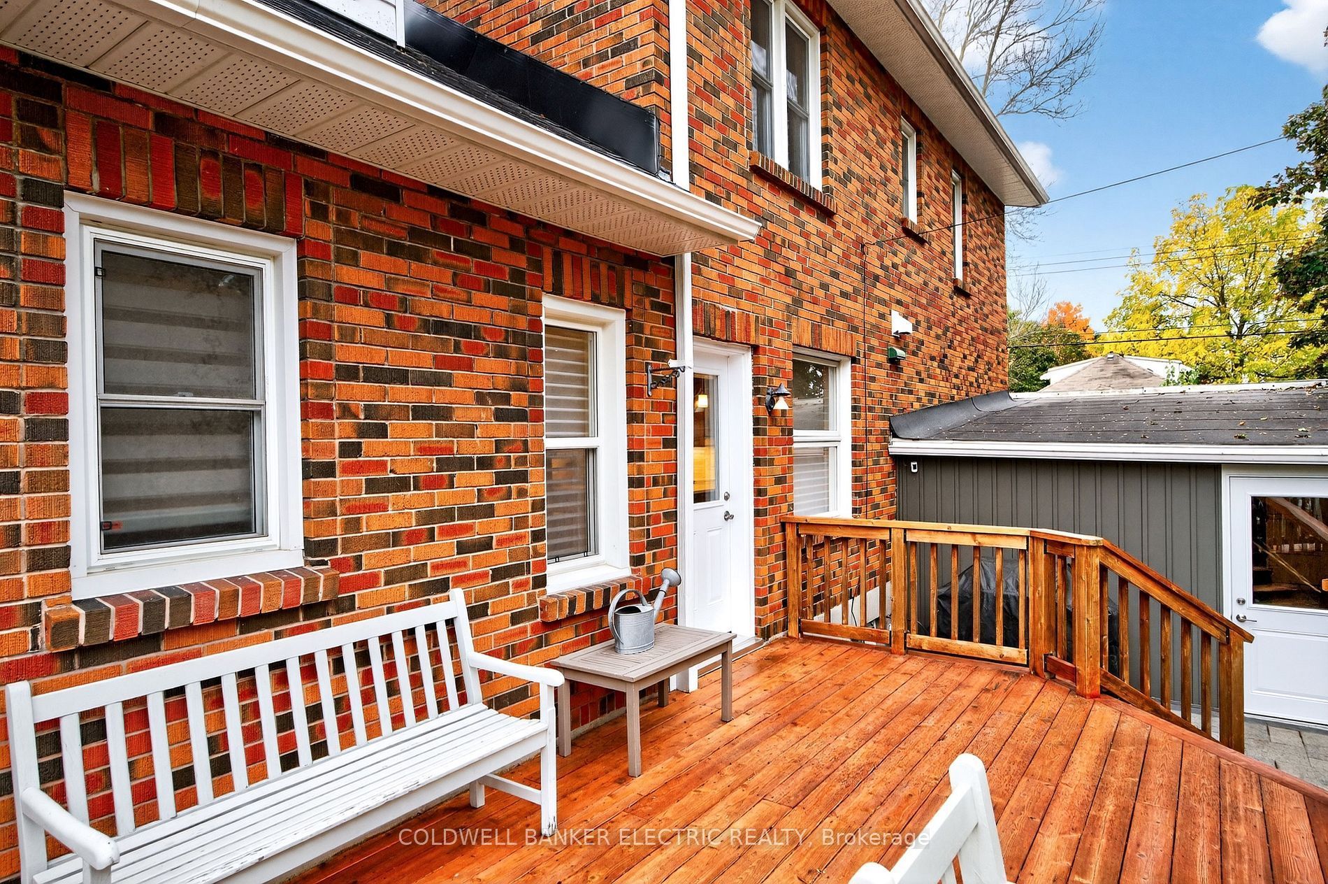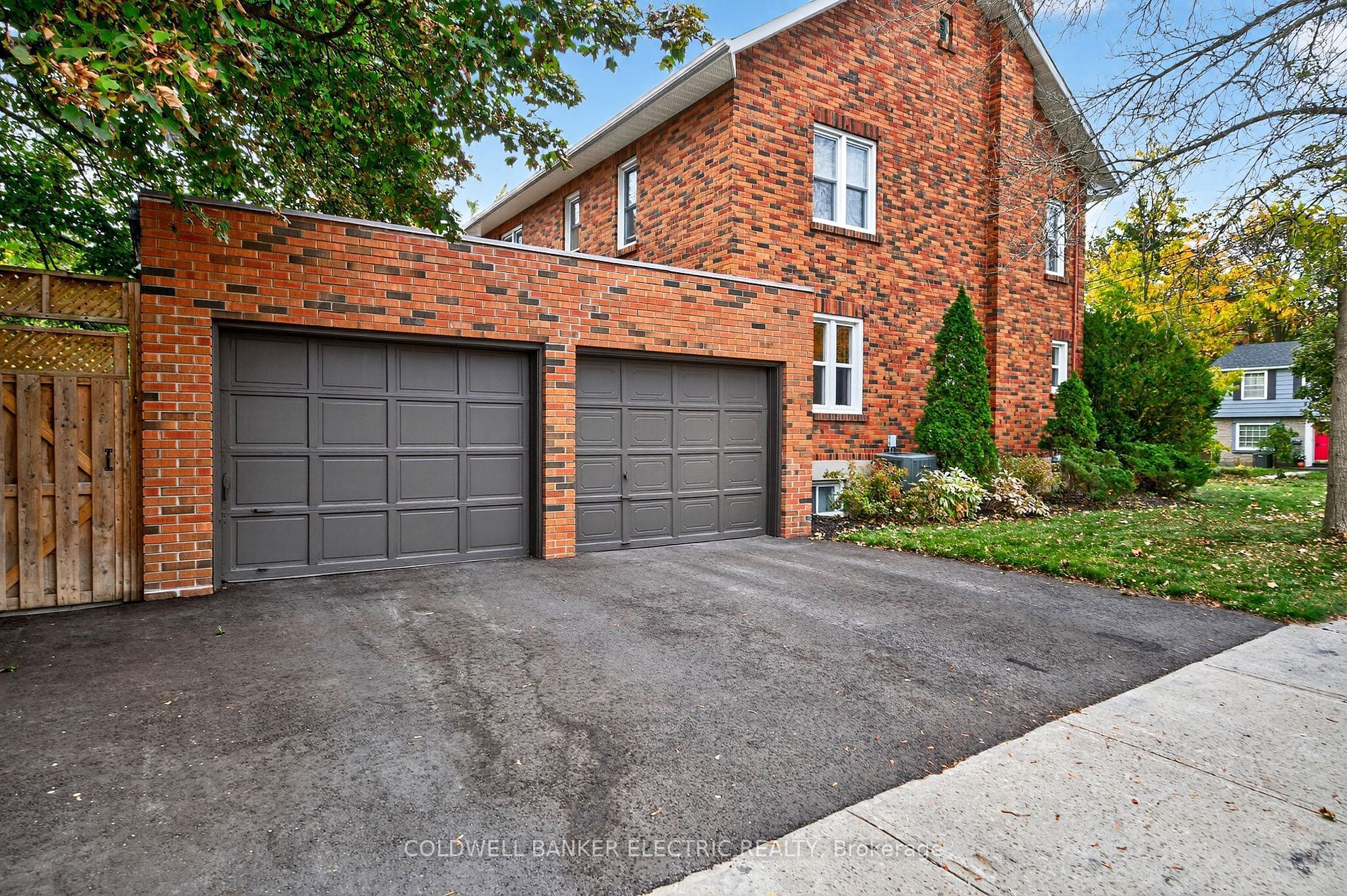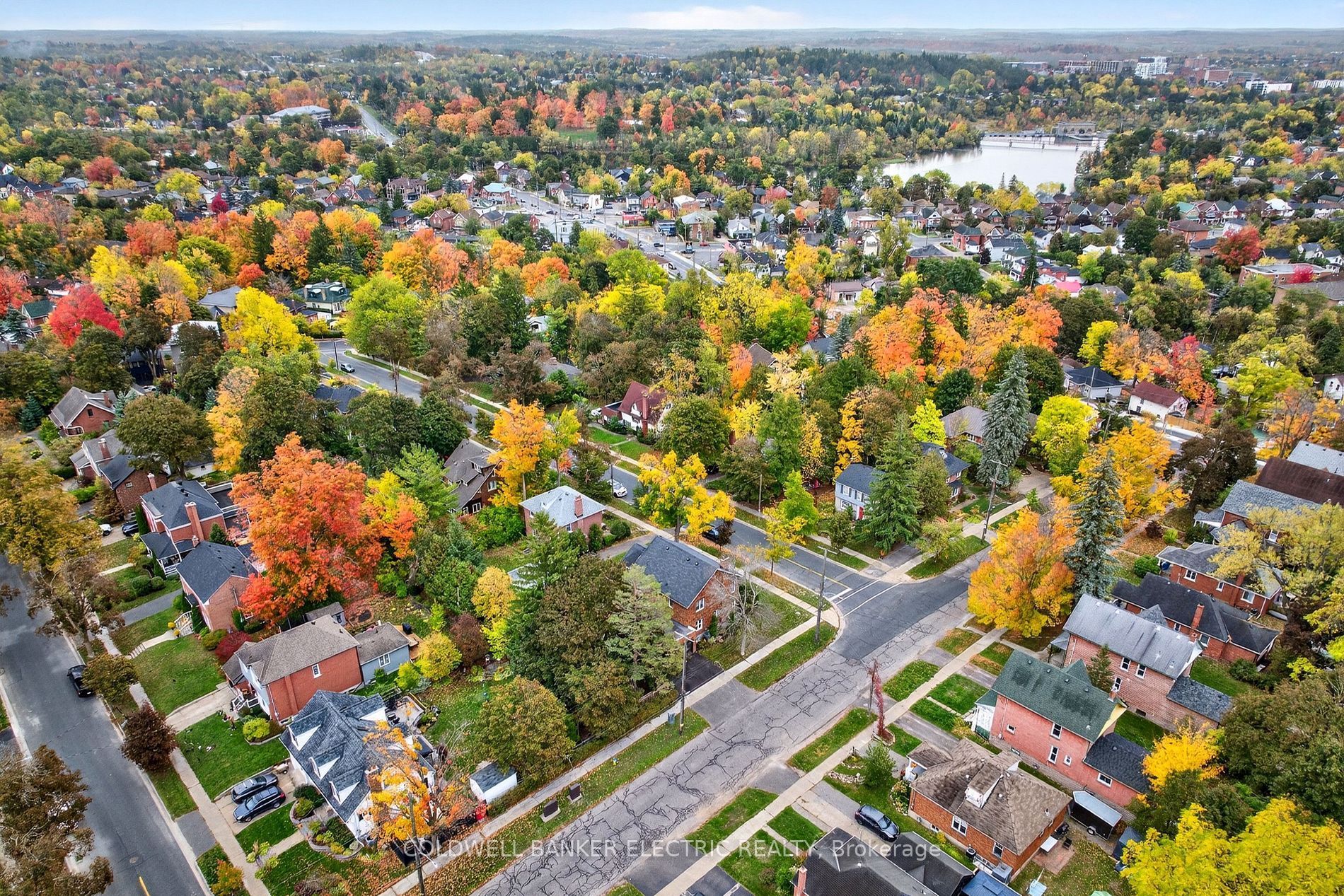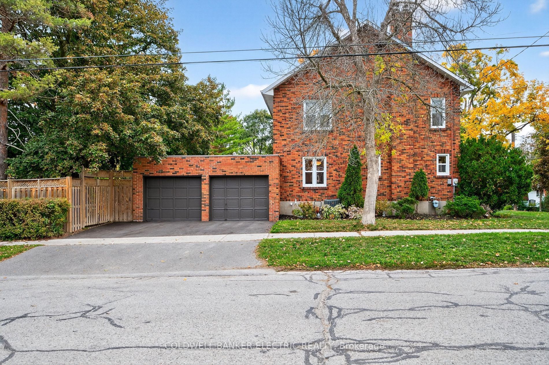 Located in the sought-after teachers college area of peterborough, this charming all-brick two-storey home sits on a desirable corner lot in one of the city's most established neighbourhoods - known for its tree-lined streets, character homes, and walkable access to downtown amenities. Step inside to find original hardwood floors flowing through a warm and inviting spacious living room with a cozy fireplace. The formal dining room offers a welcoming environment for entertaining and leads into the beautifully renovated custom maple kitchen - featuring quartz countertops, stainless steel appliances, dovetail cabinetry, and elegant tile flooring. From the kitchen, step out onto the large cedar deck overlooking a fully fenced backyard with a newly constructed patio-perfect for outdoor living and access to the double bay garage offering a functioning ford ev charger. Back into the main house, and down a side hall features a thoughtfully designed family room addition with vaulted wood ceilings, exposed beams, and two skylights. A high end renovated three-piece bathroom completes the space, while a staircase leads to a versatile loft - ideal for a home office or potential fifth bedroom. The second storey offers four bedrooms, including a generously sized primary, along with a beautifully renovated three-piece bathroom with glass shower. The basement provides a rec room and ample storage in the utility / laundry room. Located just minutes to downtown shops, restaurants, and amenities - offering a connected, walkable lifestyle in a well-established neighbourhood. Ideal for families, professionals, or those with a connection to local colleges and universities.