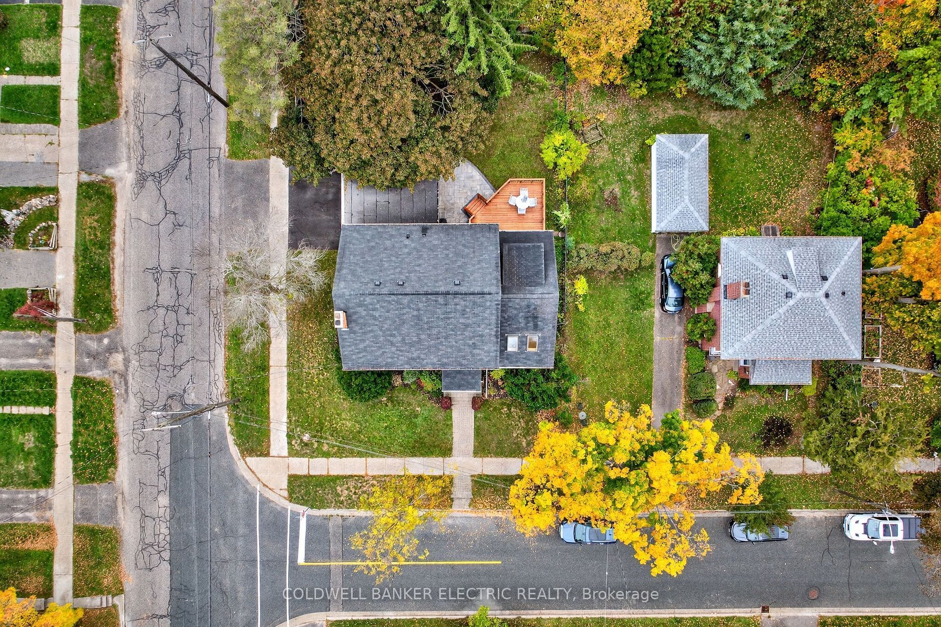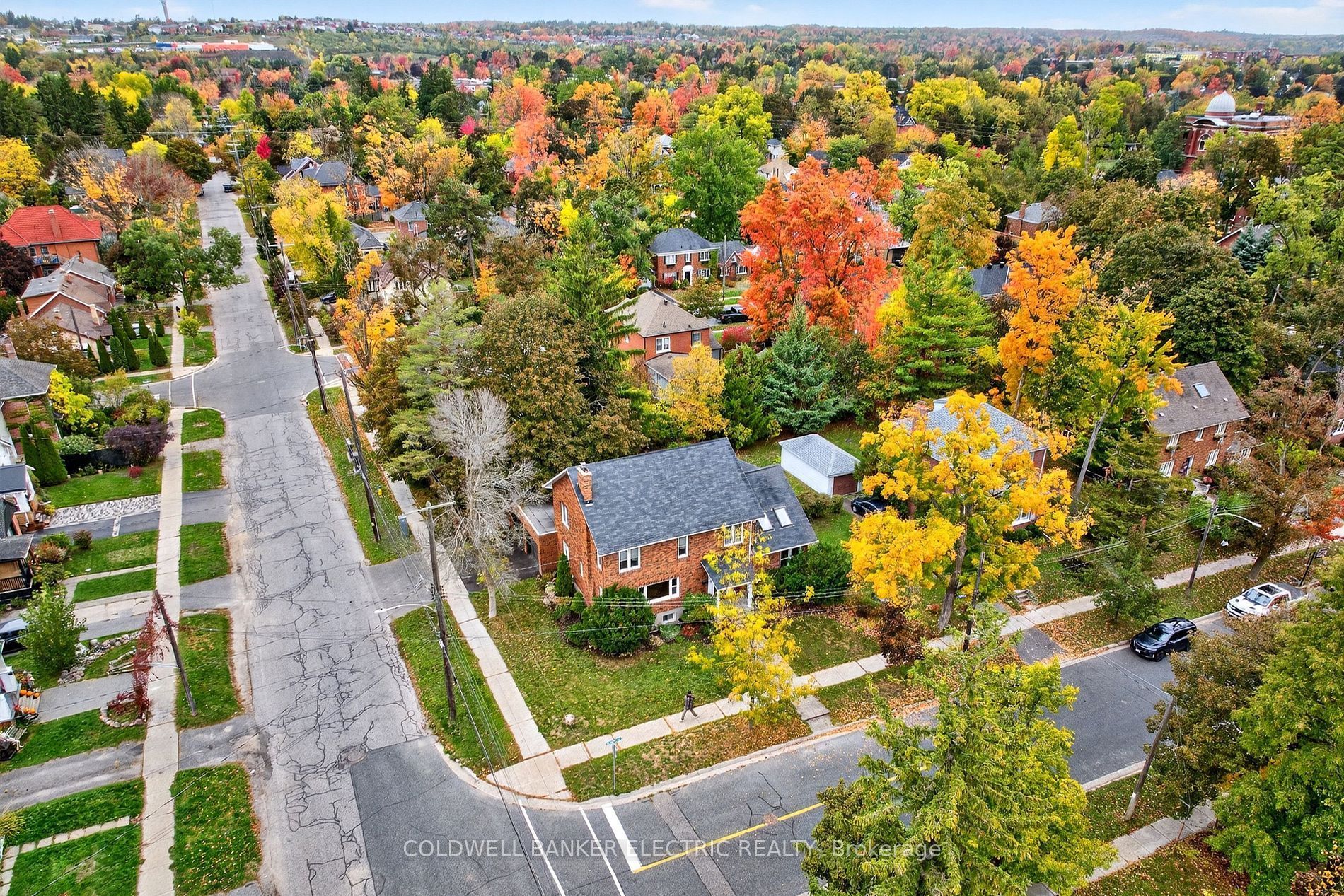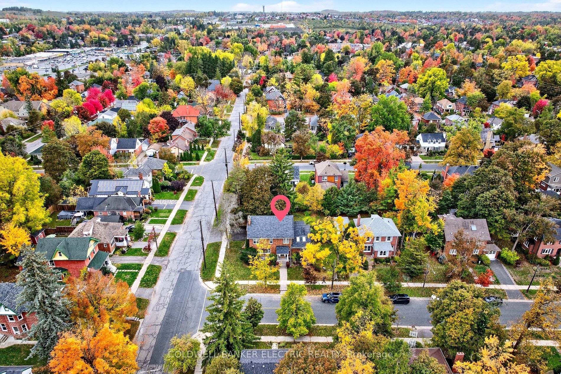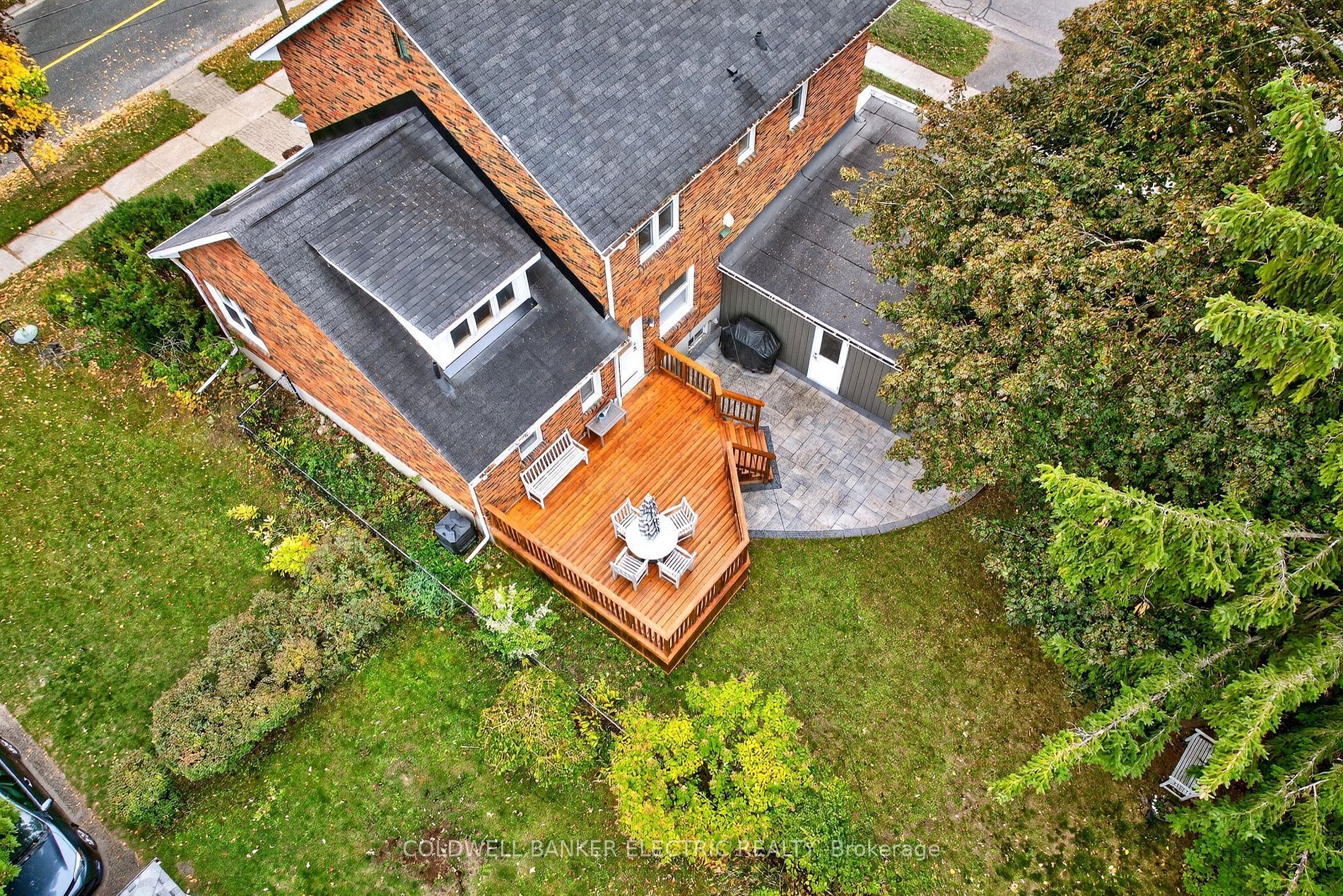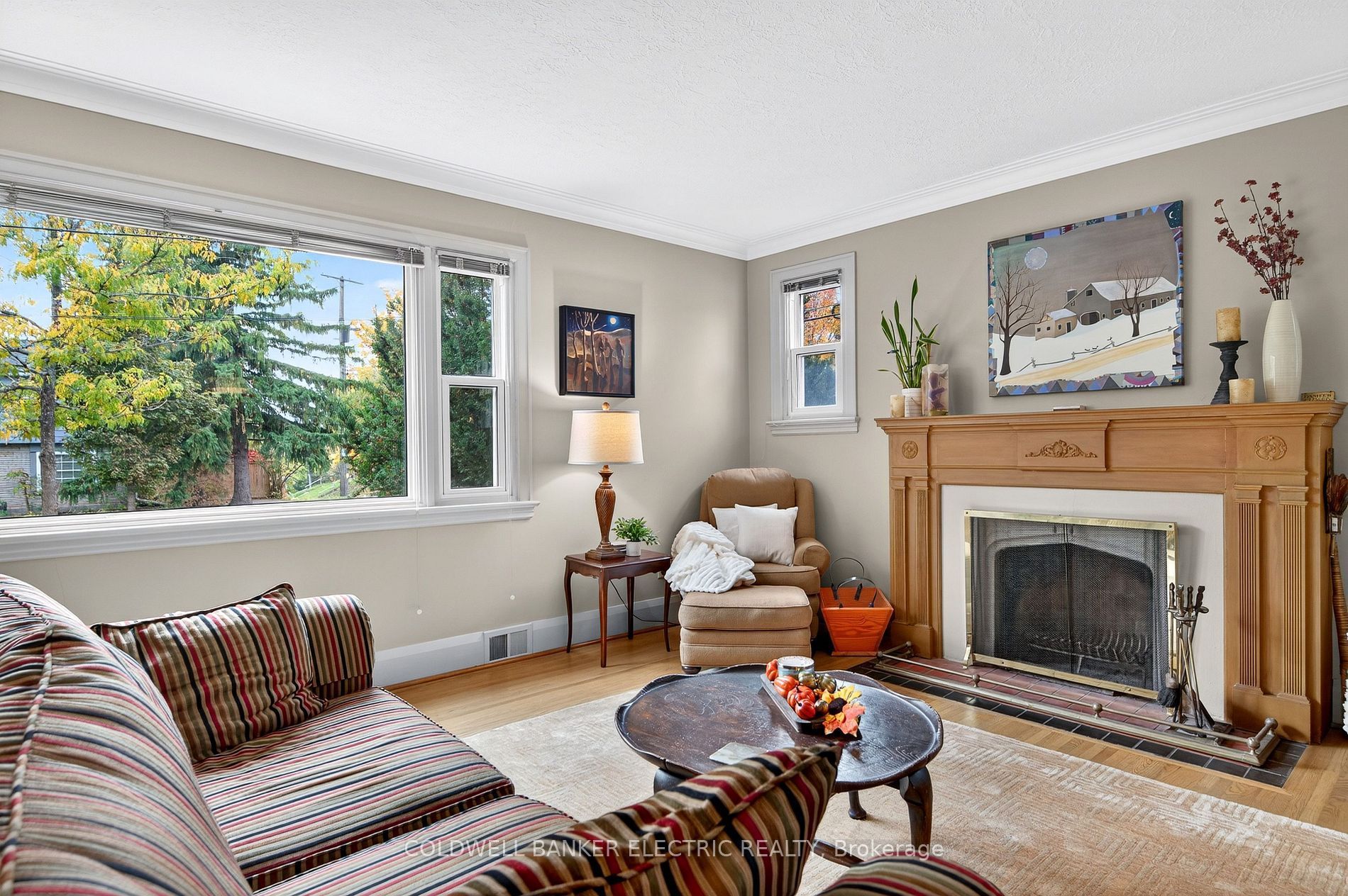 Located in the sought-after teachers college area of peterborough, this charming all-brick two-storey home sits on a desirable corner lot in one of the city's most established neighbourhoods - known for its tree-lined streets, character homes, and walkable access to downtown amenities. Step inside to find original hardwood floors flowing through a warm and inviting spacious living room with a cozy fireplace. The formal dining room offers a welcoming environment for entertaining and leads into the beautifully renovated custom maple kitchen - featuring quartz countertops, stainless steel appliances, dovetail cabinetry, and elegant tile flooring. From the kitchen, step out onto the large cedar deck overlooking a fully fenced backyard with a newly constructed patio-perfect for outdoor living and access to the double bay garage offering a functioning ford ev charger. Back into the main house, and down a side hall features a thoughtfully designed family room addition with vaulted wood ceilings, exposed beams, and two skylights. A high end renovated three-piece bathroom completes the space, while a staircase leads to a versatile loft - ideal for a home office or potential fifth bedroom. The second storey offers four bedrooms, including a generously sized primary, along with a beautifully renovated three-piece bathroom with glass shower. The basement provides a rec room and ample storage in the utility / laundry room. Located just minutes to downtown shops, restaurants, and amenities - offering a connected, walkable lifestyle in a well-established neighbourhood. Ideal for families, professionals, or those with a connection to local colleges and universities.