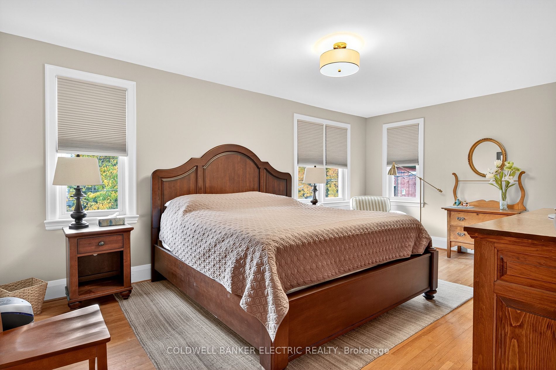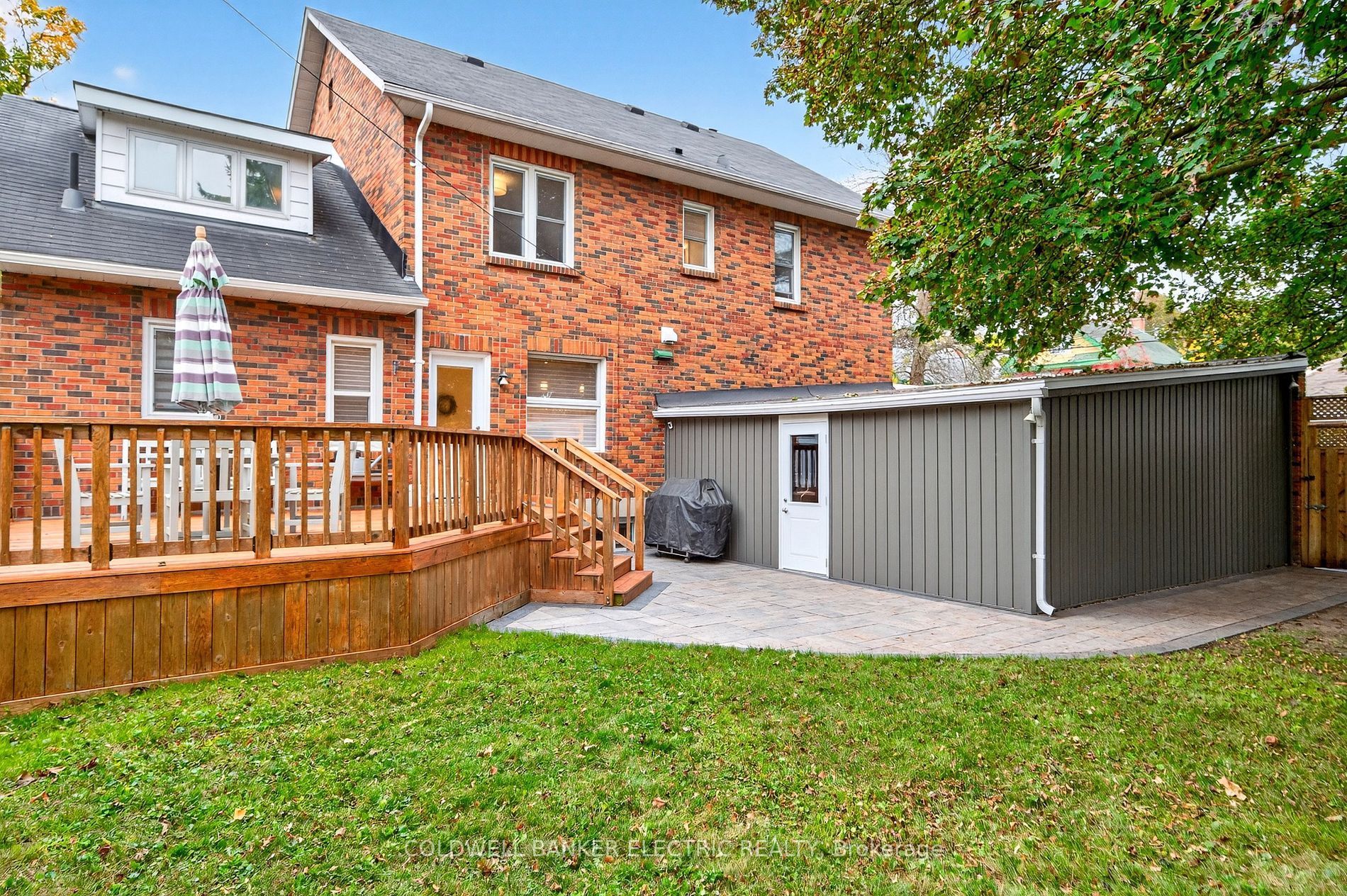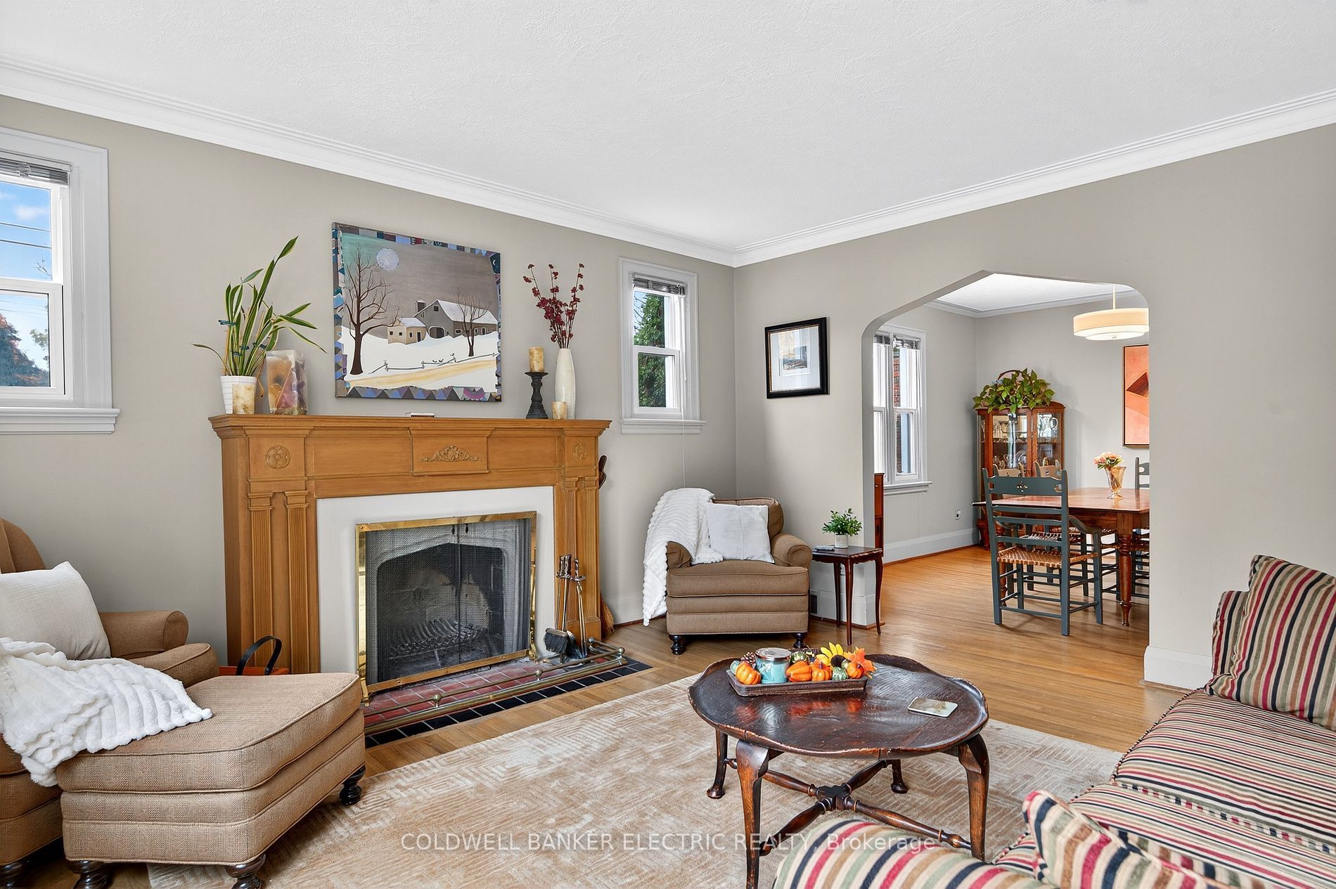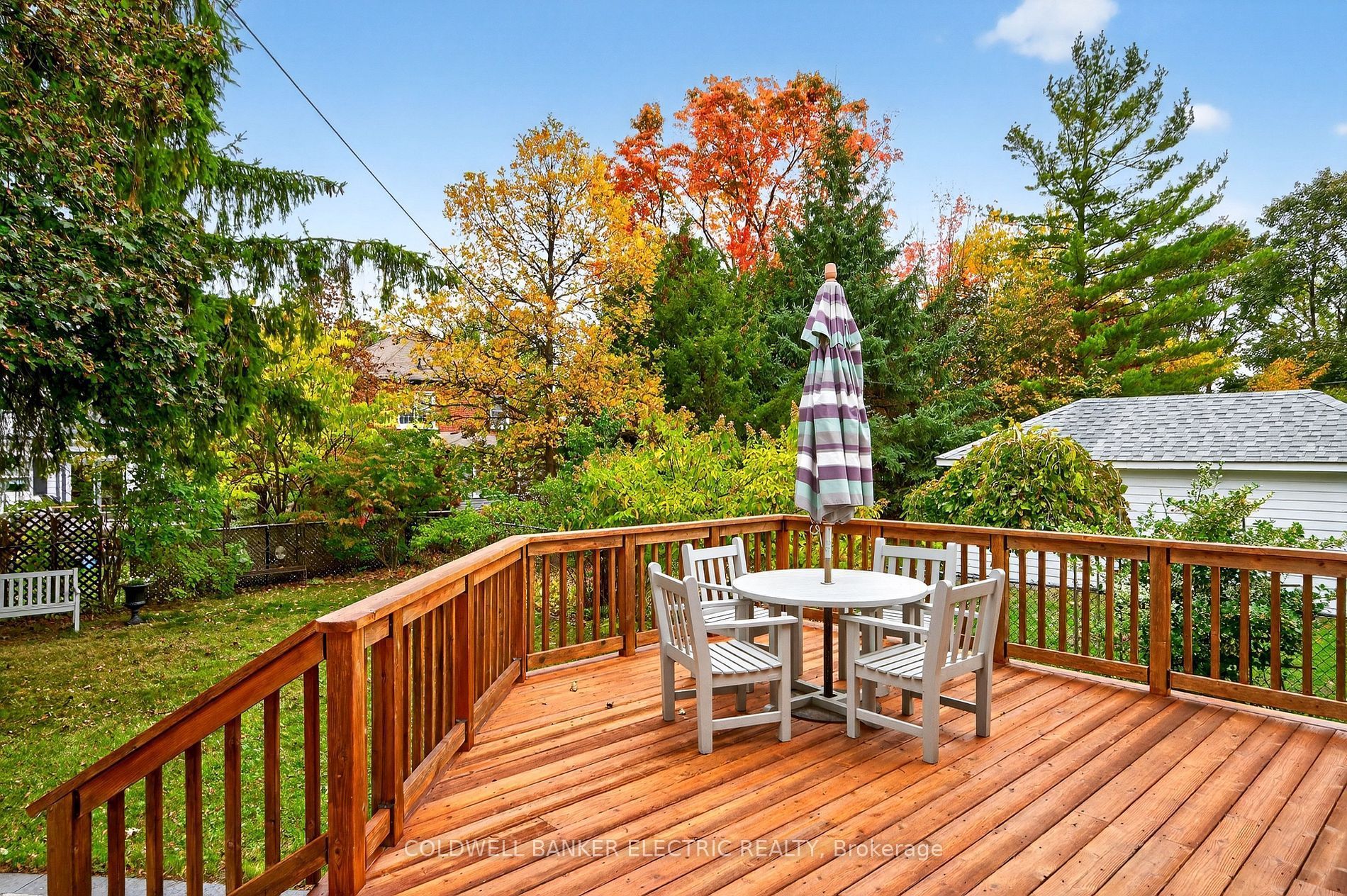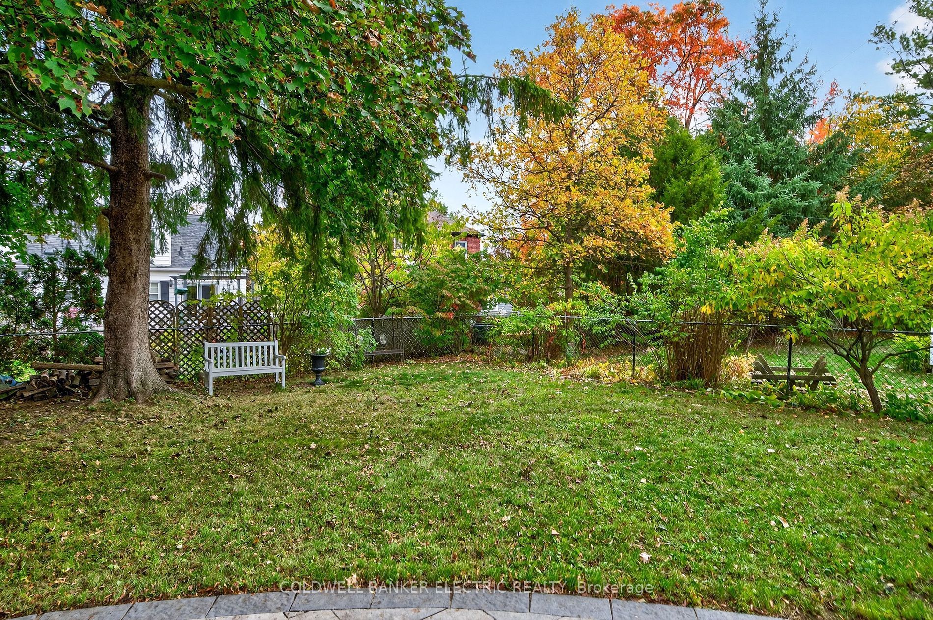 Located in the sought-after teachers college area of peterborough, this charming all-brick two-storey home sits on a desirable corner lot in one of the city's most established neighbourhoods - known for its tree-lined streets, character homes, and walkable access to downtown amenities. Step inside to find original hardwood floors flowing through a warm and inviting spacious living room with a cozy fireplace. The formal dining room offers a welcoming environment for entertaining and leads into the beautifully renovated custom maple kitchen - featuring quartz countertops, stainless steel appliances, dovetail cabinetry, and elegant tile flooring. From the kitchen, step out onto the large cedar deck overlooking a fully fenced backyard with a newly constructed patio-perfect for outdoor living and access to the double bay garage offering a functioning ford ev charger. Back into the main house, and down a side hall features a thoughtfully designed family room addition with vaulted wood ceilings, exposed beams, and two skylights. A high end renovated three-piece bathroom completes the space, while a staircase leads to a versatile loft - ideal for a home office or potential fifth bedroom. The second storey offers four bedrooms, including a generously sized primary, along with a beautifully renovated three-piece bathroom with glass shower. The basement provides a rec room and ample storage in the utility / laundry room. Located just minutes to downtown shops, restaurants, and amenities - offering a connected, walkable lifestyle in a well-established neighbourhood. Ideal for families, professionals, or those with a connection to local colleges and universities.