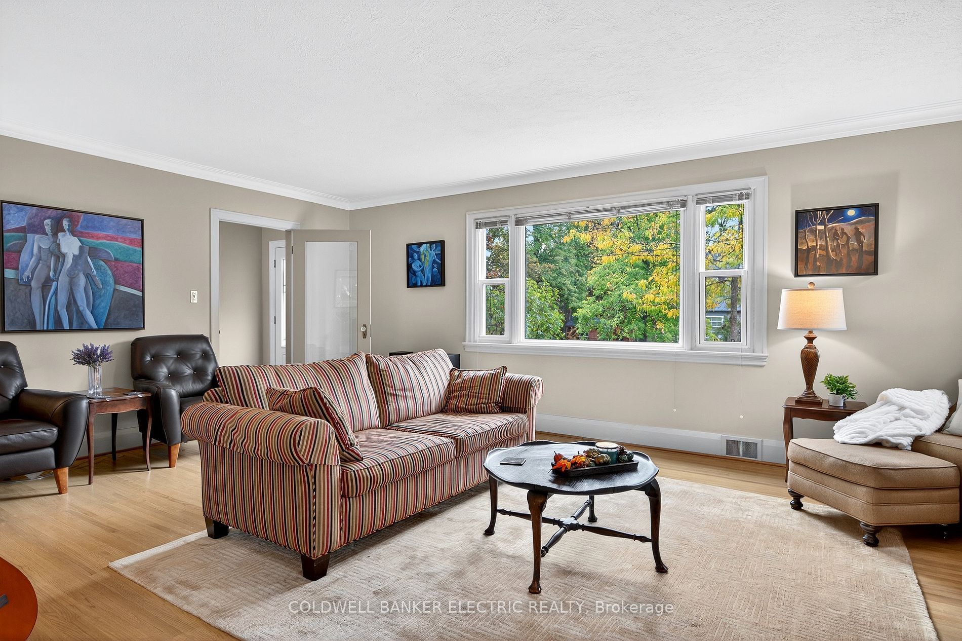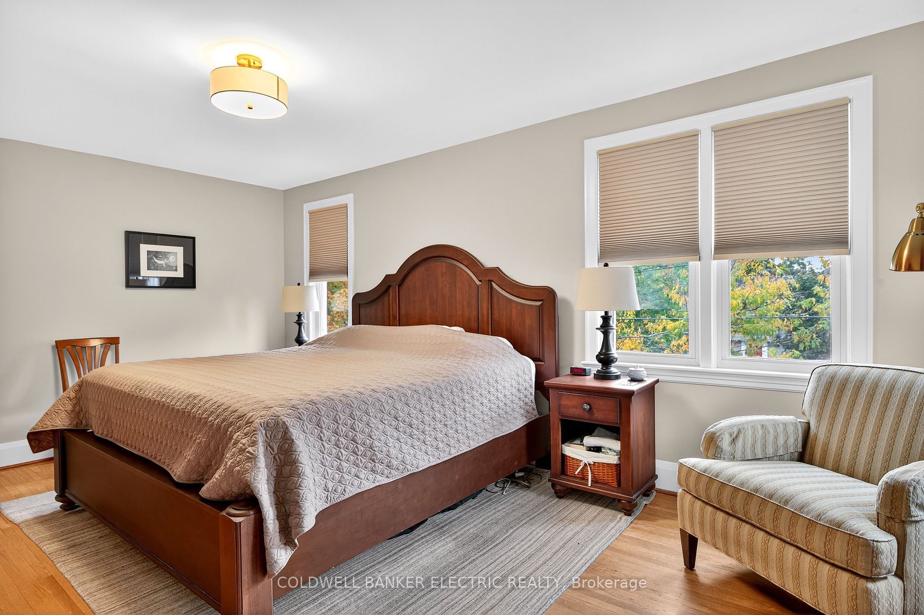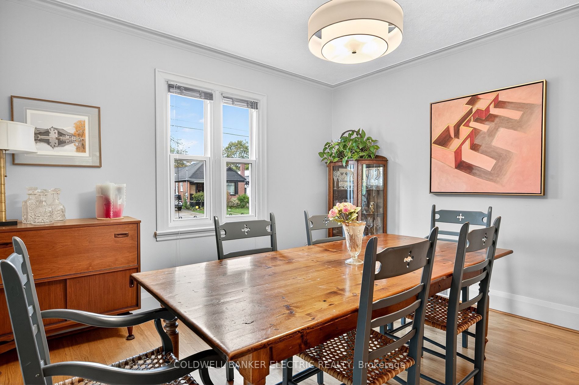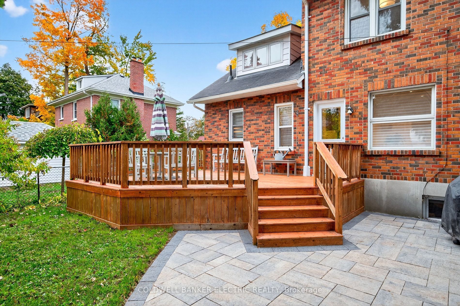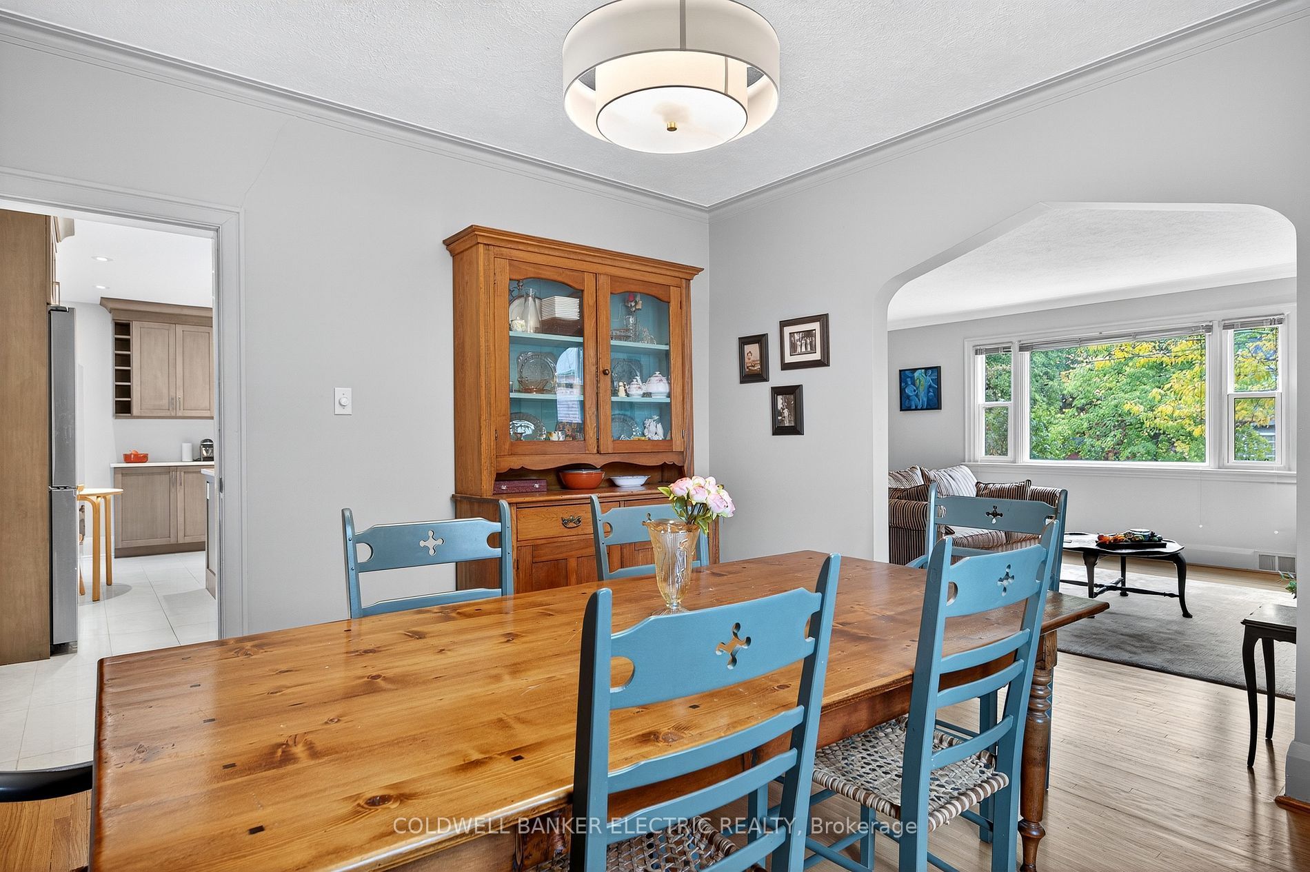 Located in the sought-after teachers college area of peterborough, this charming all-brick two-storey home sits on a desirable corner lot in one of the city's most established neighbourhoods - known for its tree-lined streets, character homes, and walkable access to downtown amenities. Step inside to find original hardwood floors flowing through a warm and inviting spacious living room with a cozy fireplace. The formal dining room offers a welcoming environment for entertaining and leads into the beautifully renovated custom maple kitchen - featuring quartz countertops, stainless steel appliances, dovetail cabinetry, and elegant tile flooring. From the kitchen, step out onto the large cedar deck overlooking a fully fenced backyard with a newly constructed patio-perfect for outdoor living and access to the double bay garage offering a functioning ford ev charger. Back into the main house, and down a side hall features a thoughtfully designed family room addition with vaulted wood ceilings, exposed beams, and two skylights. A high end renovated three-piece bathroom completes the space, while a staircase leads to a versatile loft - ideal for a home office or potential fifth bedroom. The second storey offers four bedrooms, including a generously sized primary, along with a beautifully renovated three-piece bathroom with glass shower. The basement provides a rec room and ample storage in the utility / laundry room. Located just minutes to downtown shops, restaurants, and amenities - offering a connected, walkable lifestyle in a well-established neighbourhood. Ideal for families, professionals, or those with a connection to local colleges and universities.