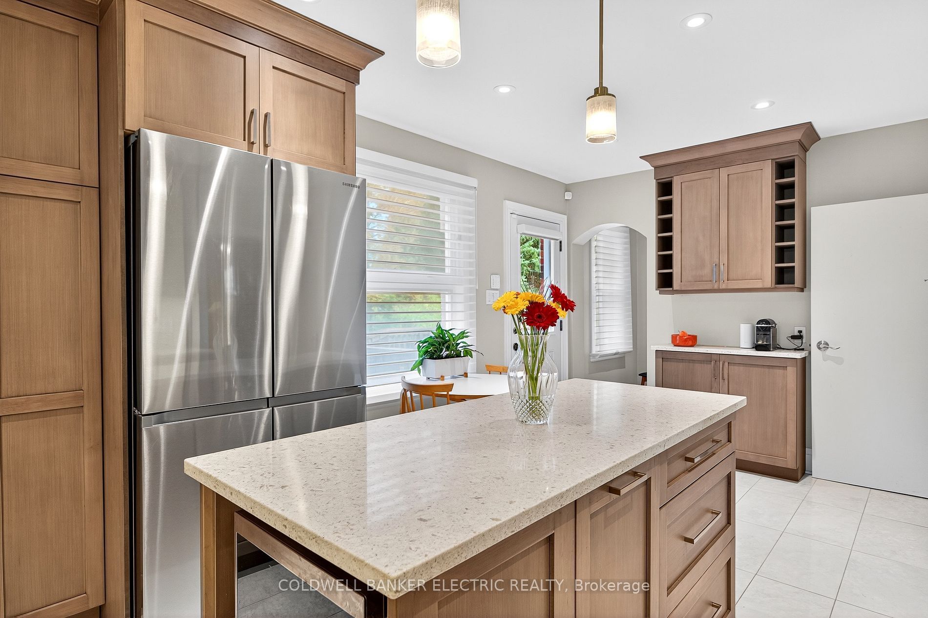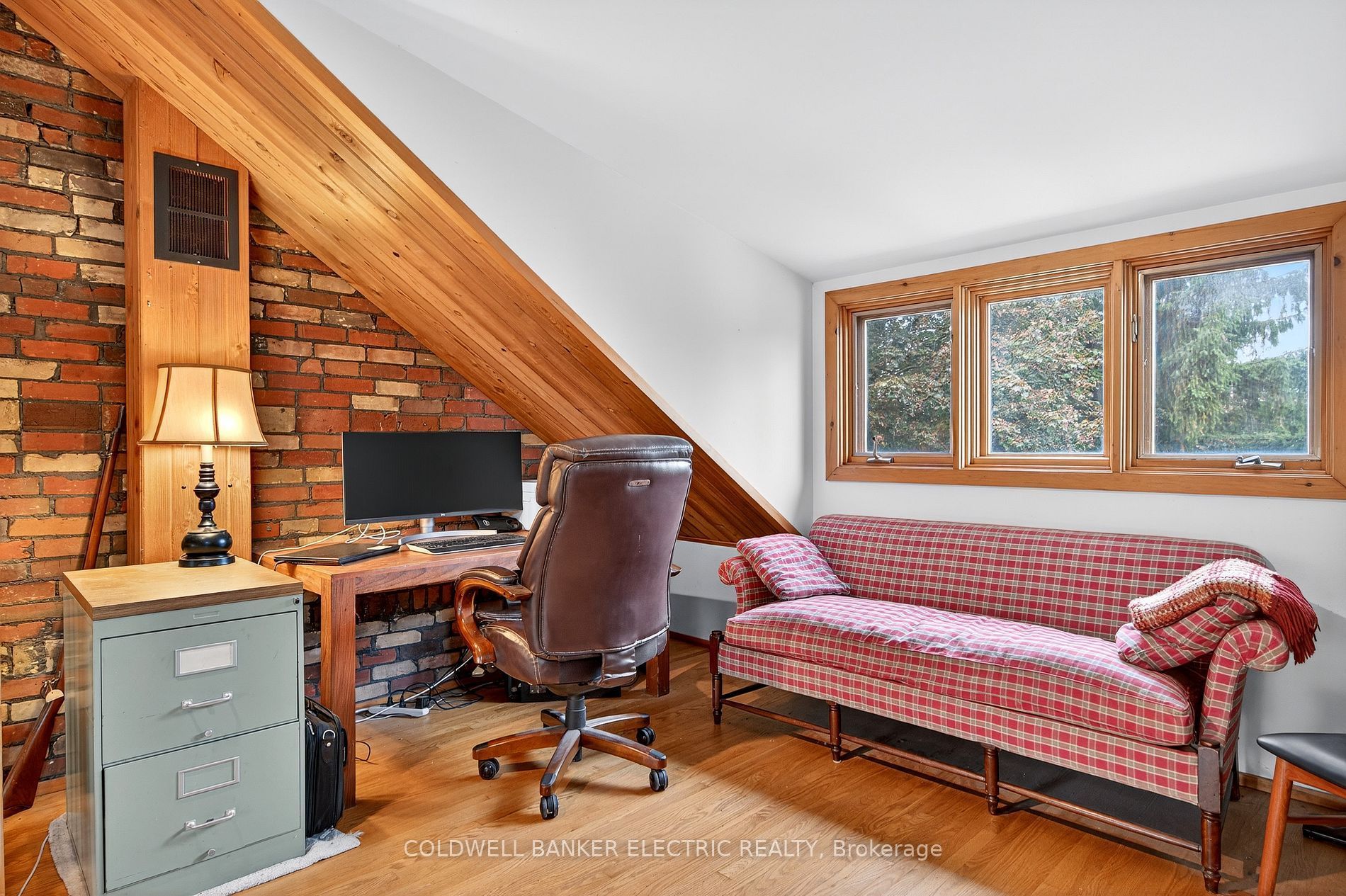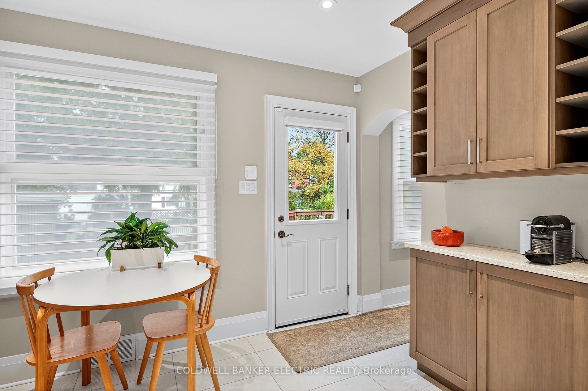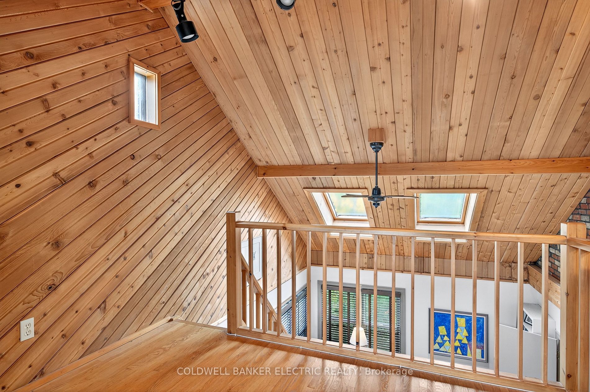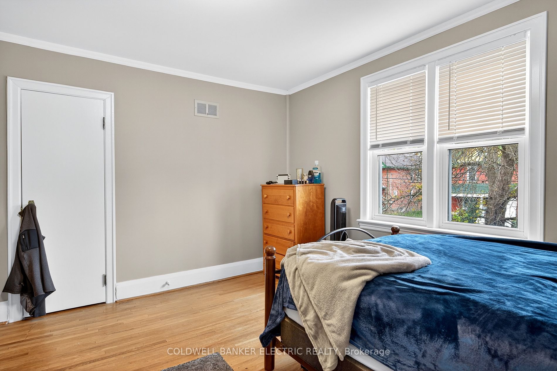 Located in the sought-after teachers college area of peterborough, this charming all-brick two-storey home sits on a desirable corner lot in one of the city's most established neighbourhoods - known for its tree-lined streets, character homes, and walkable access to downtown amenities. Step inside to find original hardwood floors flowing through a warm and inviting spacious living room with a cozy fireplace. The formal dining room offers a welcoming environment for entertaining and leads into the beautifully renovated custom maple kitchen - featuring quartz countertops, stainless steel appliances, dovetail cabinetry, and elegant tile flooring. From the kitchen, step out onto the large cedar deck overlooking a fully fenced backyard with a newly constructed patio-perfect for outdoor living and access to the double bay garage offering a functioning ford ev charger. Back into the main house, and down a side hall features a thoughtfully designed family room addition with vaulted wood ceilings, exposed beams, and two skylights. A high end renovated three-piece bathroom completes the space, while a staircase leads to a versatile loft - ideal for a home office or potential fifth bedroom. The second storey offers four bedrooms, including a generously sized primary, along with a beautifully renovated three-piece bathroom with glass shower. The basement provides a rec room and ample storage in the utility / laundry room. Located just minutes to downtown shops, restaurants, and amenities - offering a connected, walkable lifestyle in a well-established neighbourhood. Ideal for families, professionals, or those with a connection to local colleges and universities.