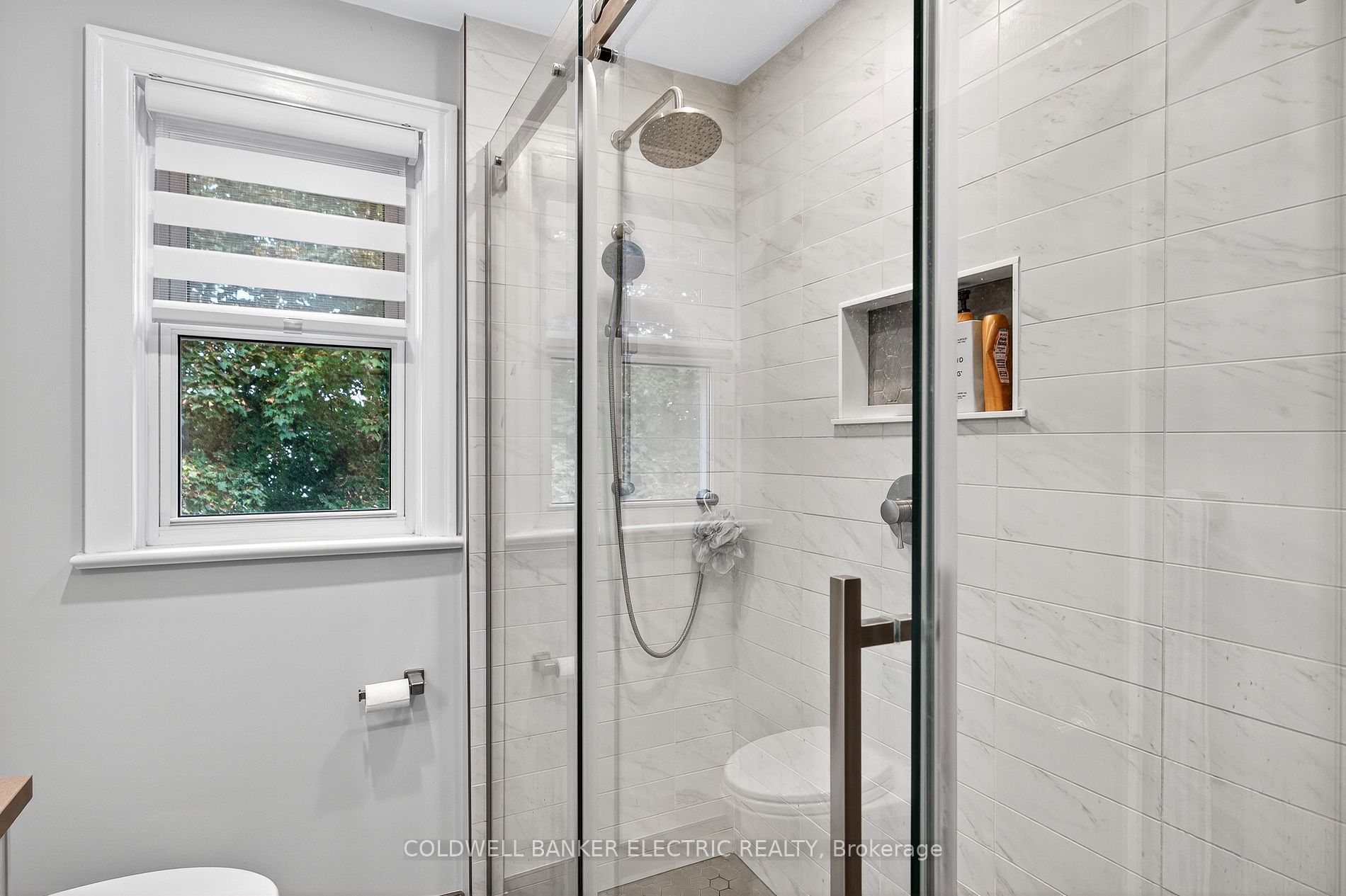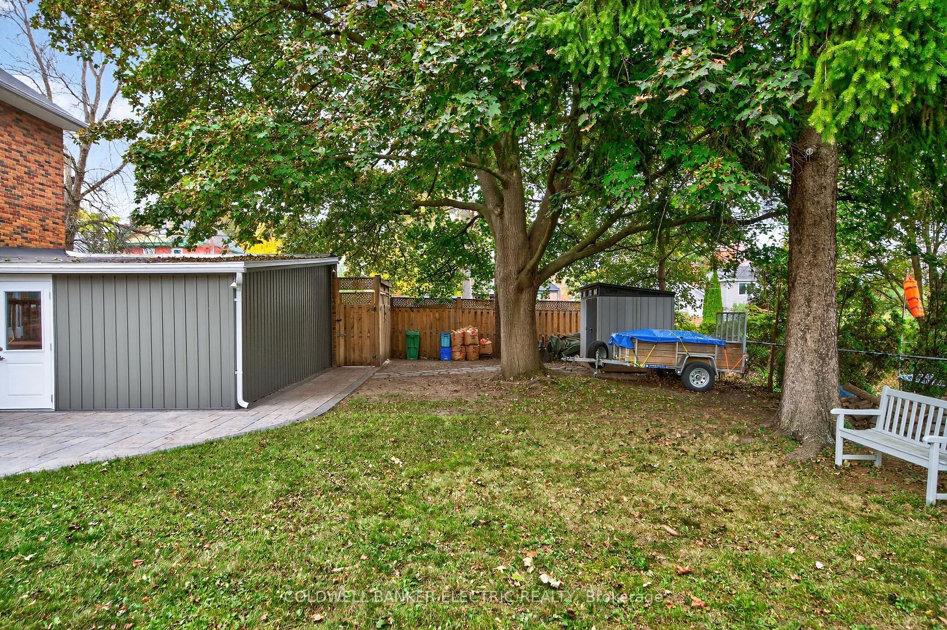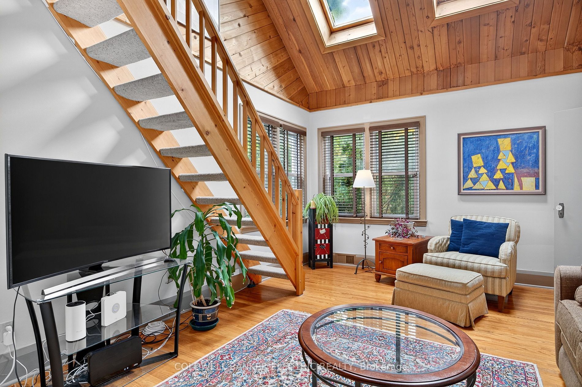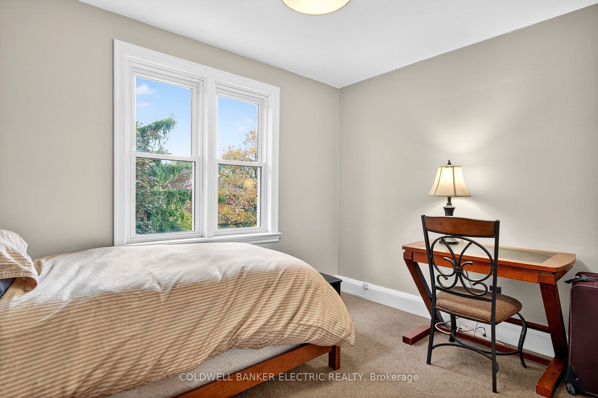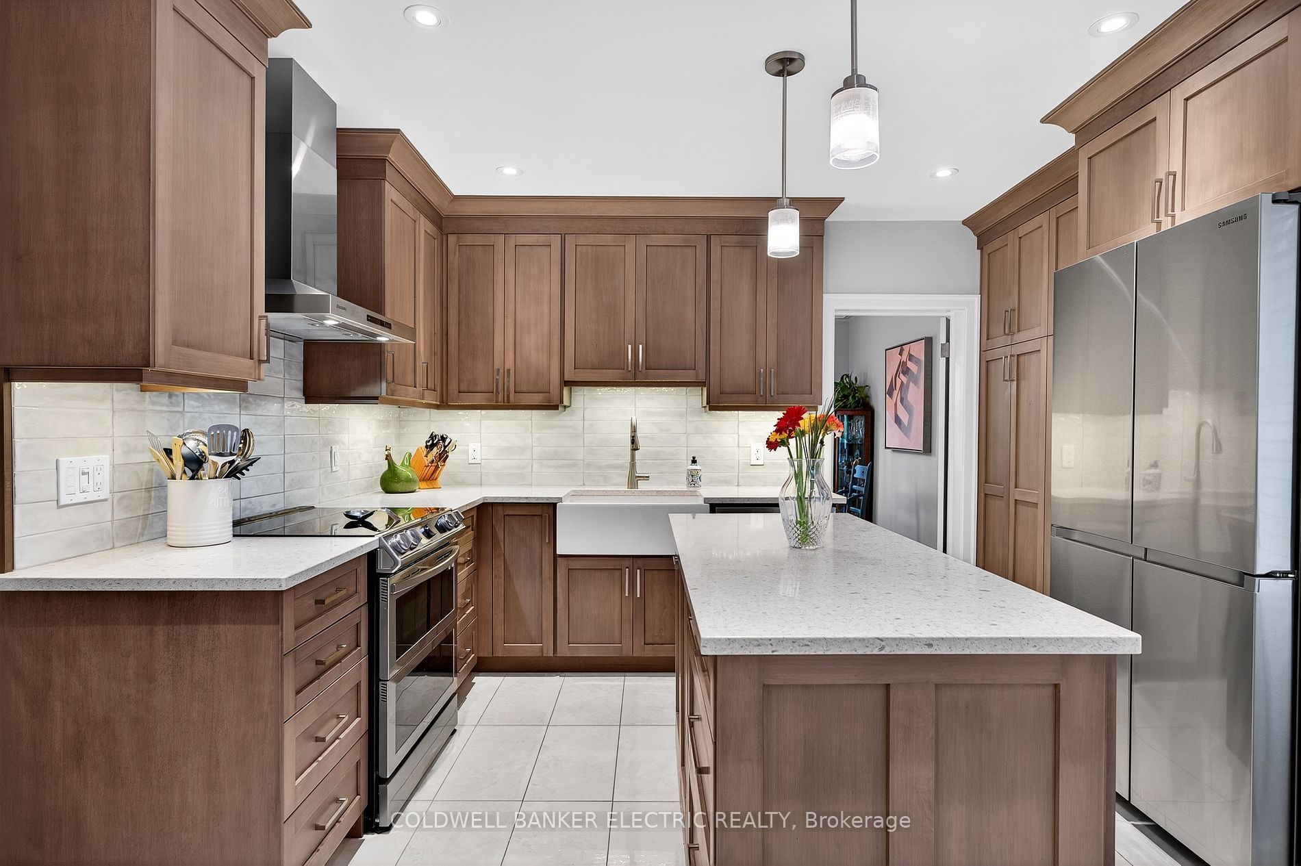 Located in the sought-after teachers college area of peterborough, this charming all-brick two-storey home sits on a desirable corner lot in one of the city's most established neighbourhoods - known for its tree-lined streets, character homes, and walkable access to downtown amenities. Step inside to find original hardwood floors flowing through a warm and inviting spacious living room with a cozy fireplace. The formal dining room offers a welcoming environment for entertaining and leads into the beautifully renovated custom maple kitchen - featuring quartz countertops, stainless steel appliances, dovetail cabinetry, and elegant tile flooring. From the kitchen, step out onto the large cedar deck overlooking a fully fenced backyard with a newly constructed patio-perfect for outdoor living and access to the double bay garage offering a functioning ford ev charger. Back into the main house, and down a side hall features a thoughtfully designed family room addition with vaulted wood ceilings, exposed beams, and two skylights. A high end renovated three-piece bathroom completes the space, while a staircase leads to a versatile loft - ideal for a home office or potential fifth bedroom. The second storey offers four bedrooms, including a generously sized primary, along with a beautifully renovated three-piece bathroom with glass shower. The basement provides a rec room and ample storage in the utility / laundry room. Located just minutes to downtown shops, restaurants, and amenities - offering a connected, walkable lifestyle in a well-established neighbourhood. Ideal for families, professionals, or those with a connection to local colleges and universities.