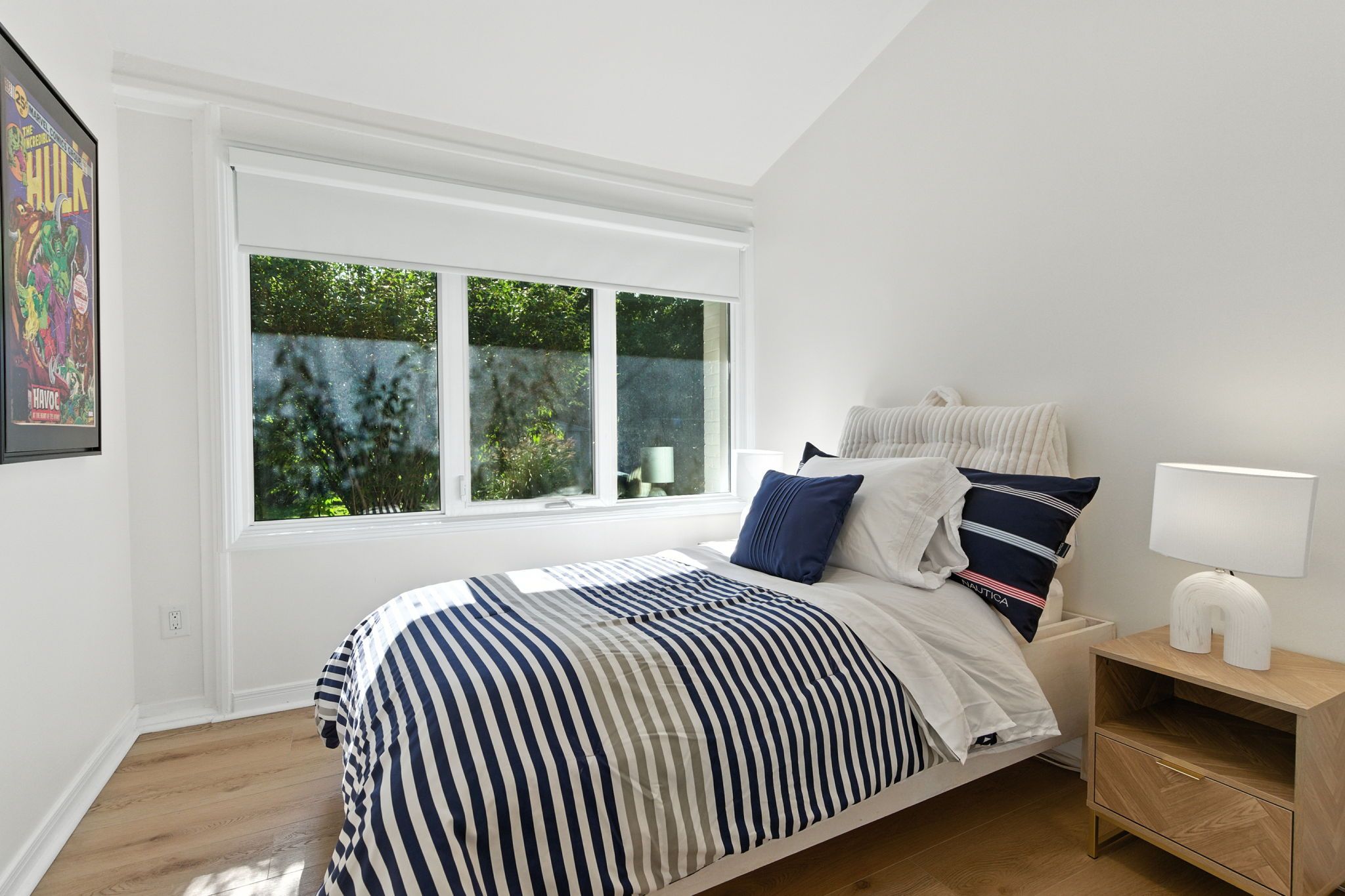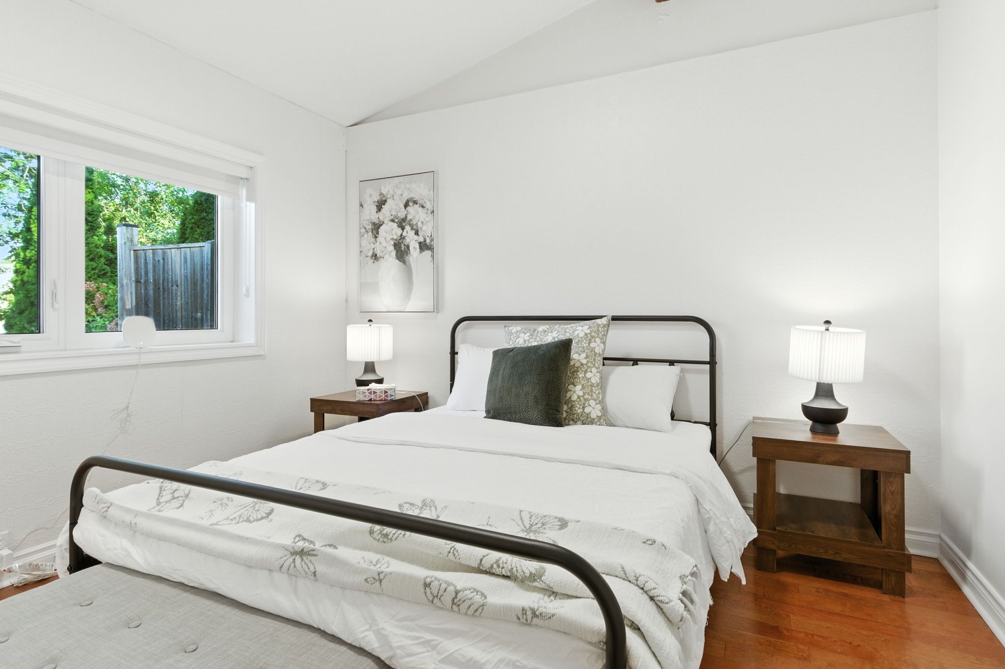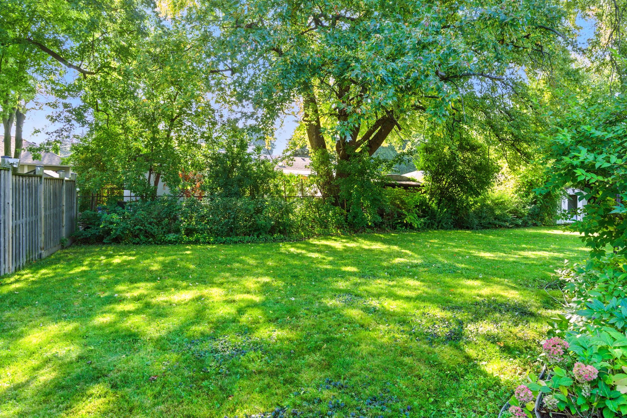 • Private backyard retreat with an expansive patio and mature trees.