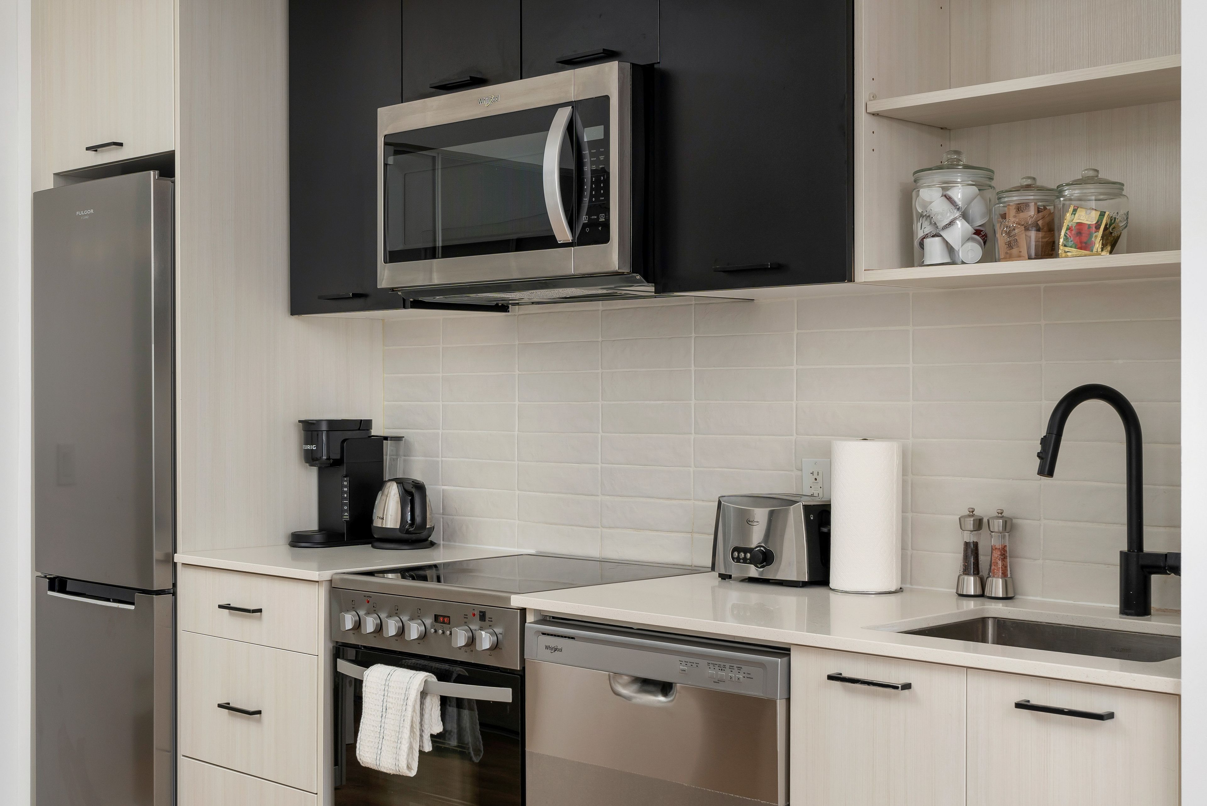 • Chef's kitchen features stainless steel appliances and quartz countertops.