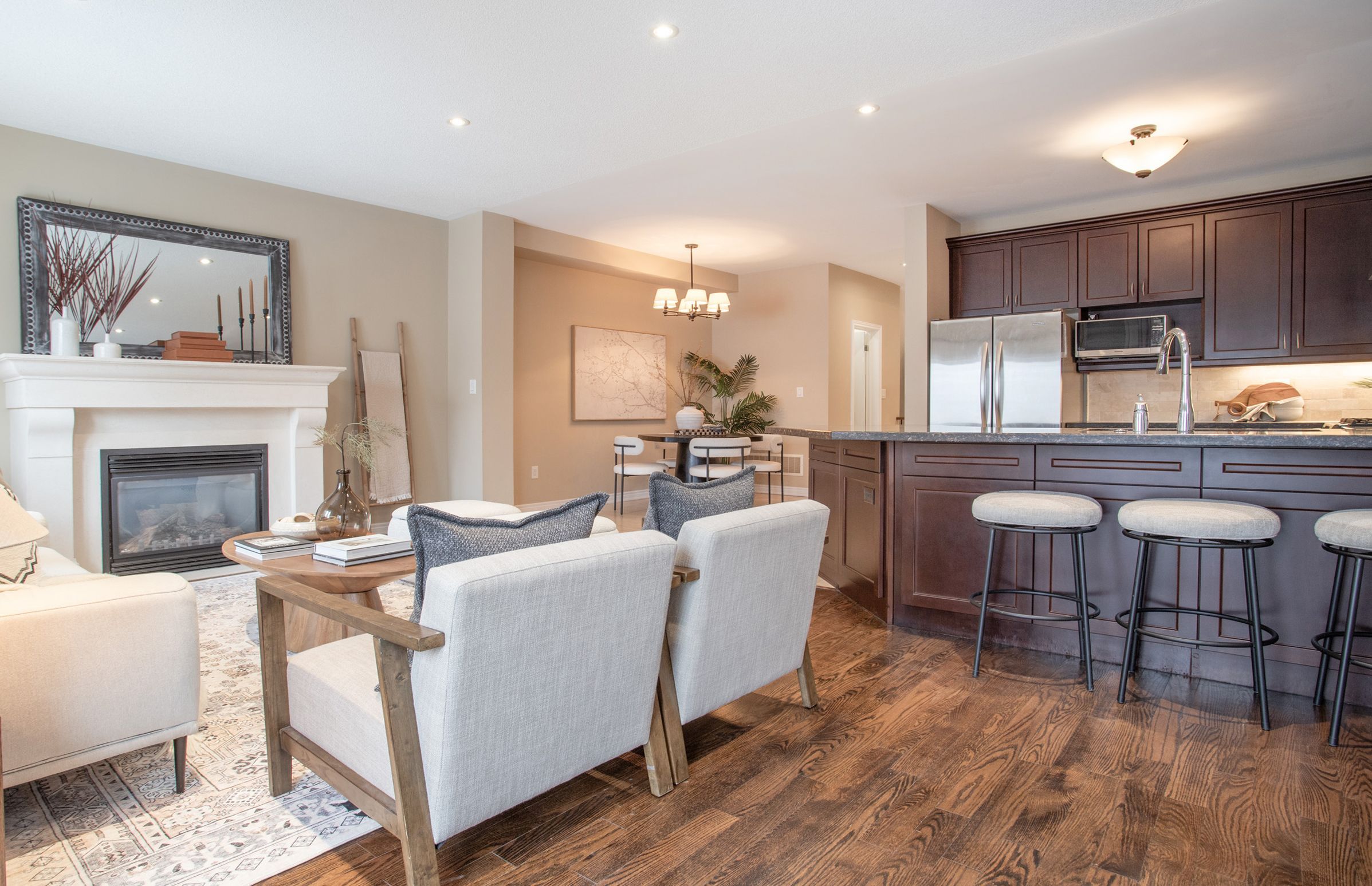 • Great room leads to a patio surrounded by trees and trails.