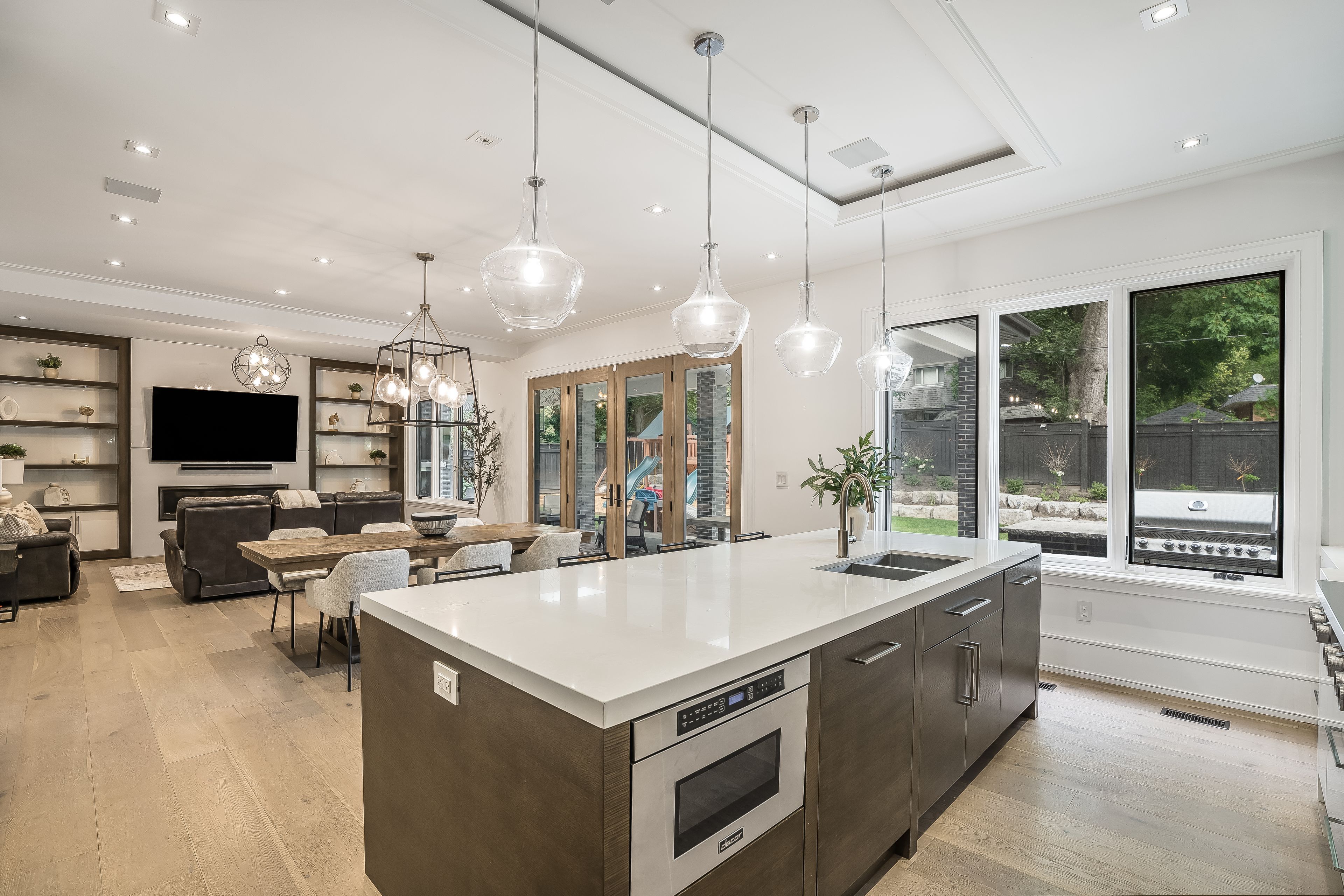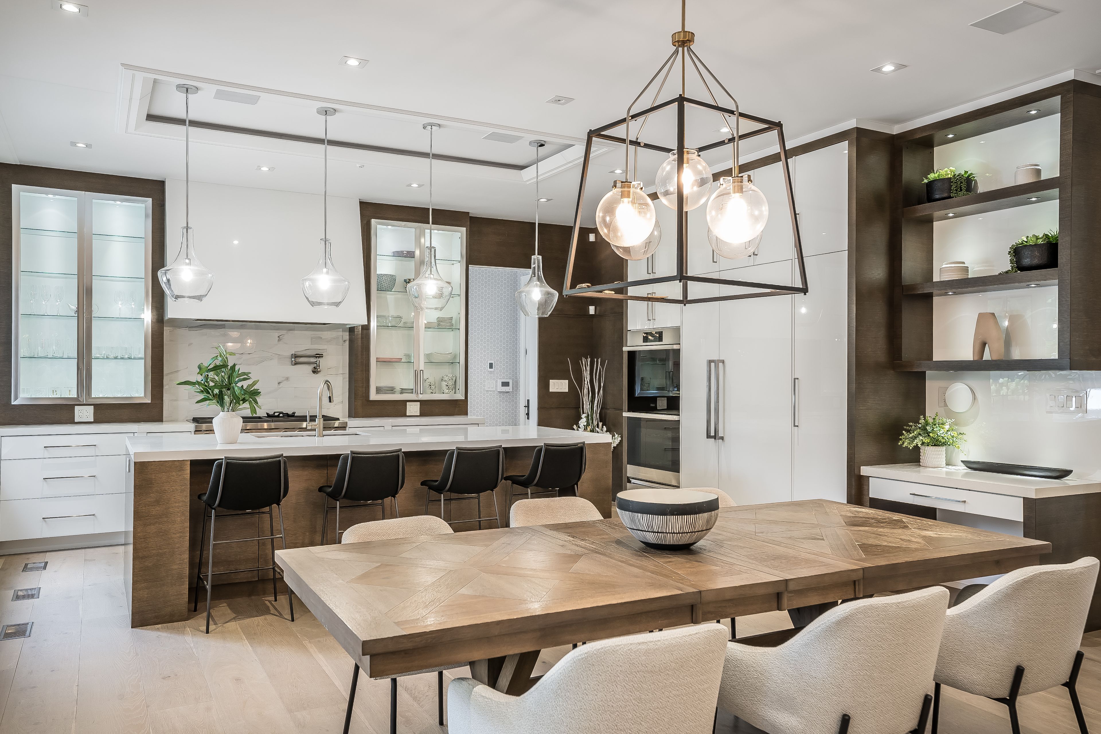 • Modern chef's kitchen with premium appliances and sophisticated dining area.