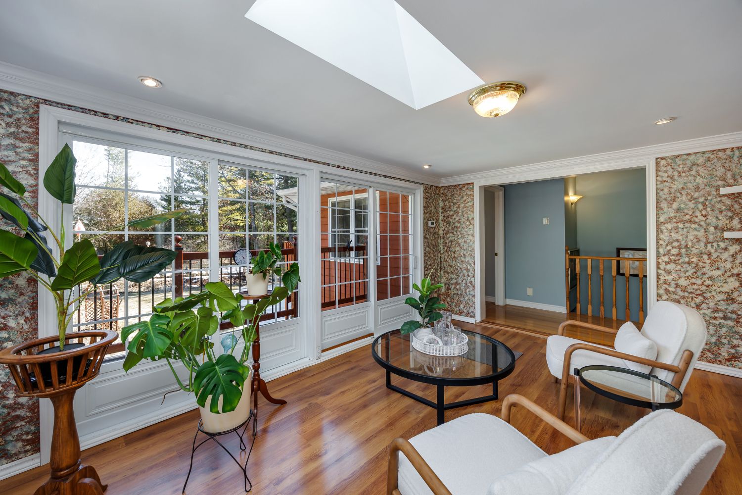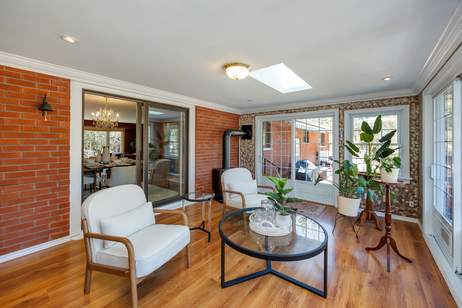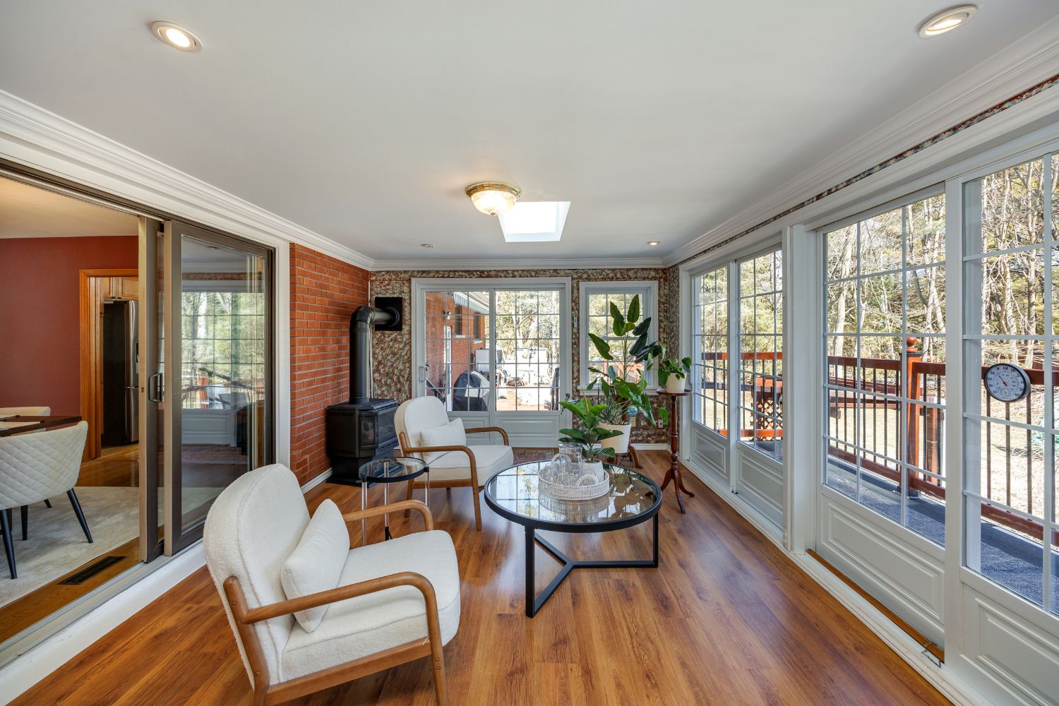 • Impressive sunroom with gas stove and deck access for relaxation.