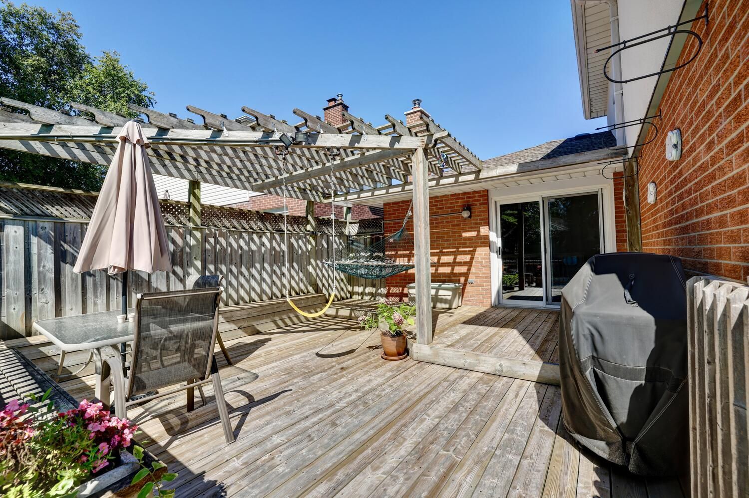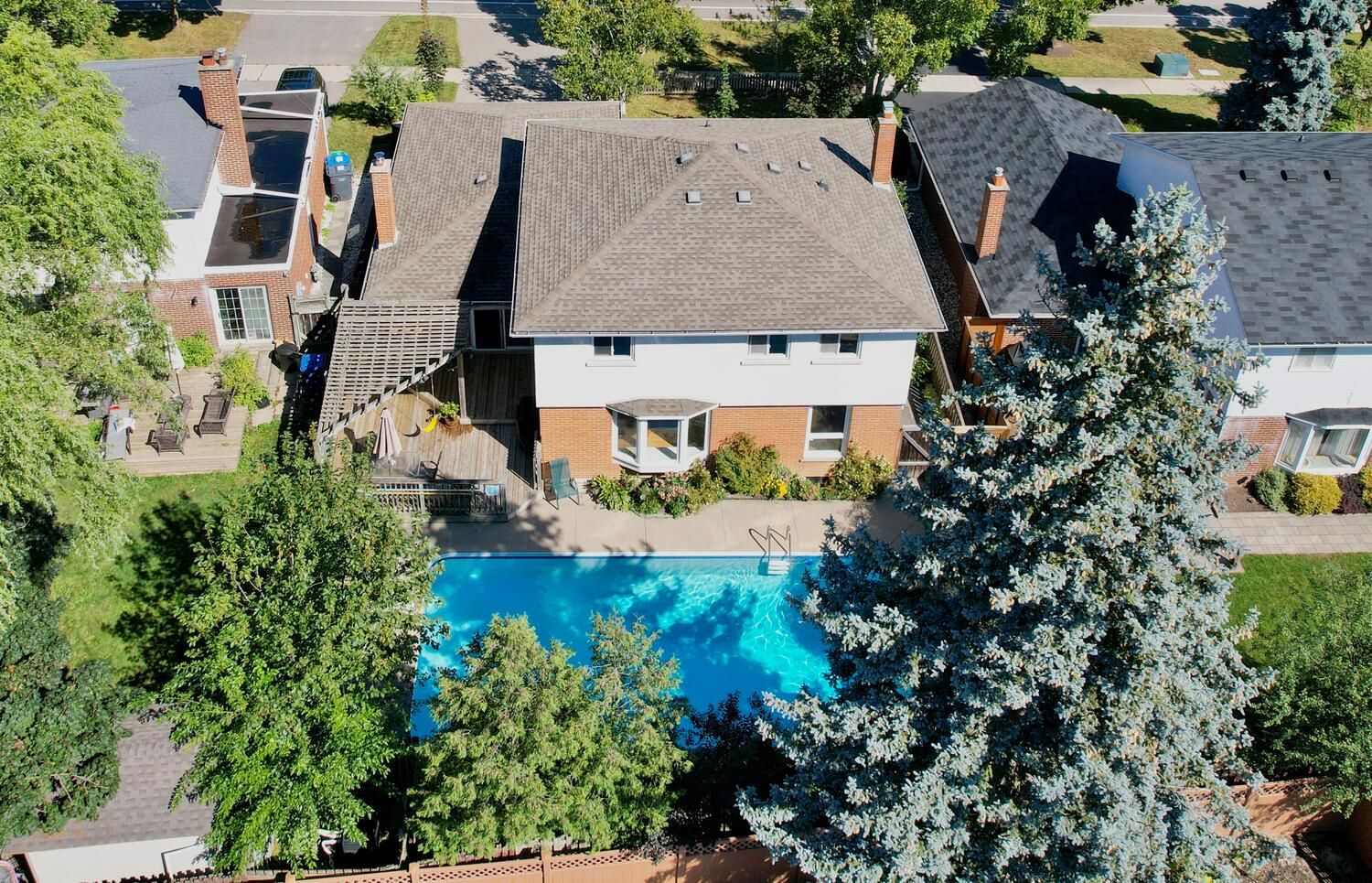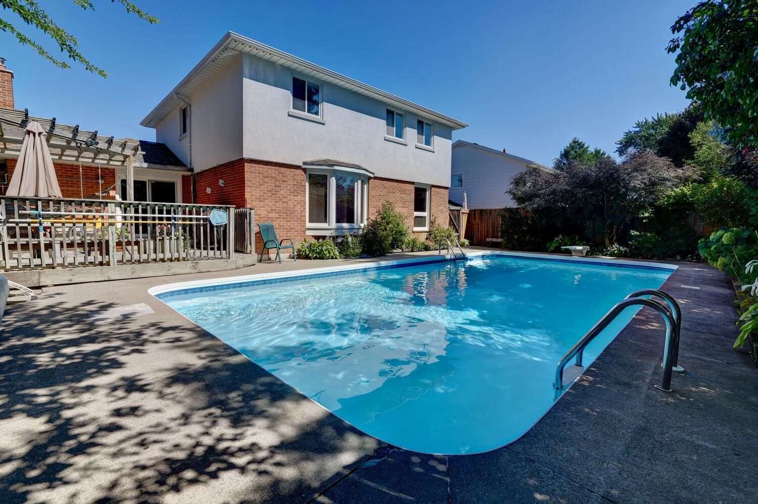 • Backyard oasis with an inground pool, lush gardens, and a large deck.