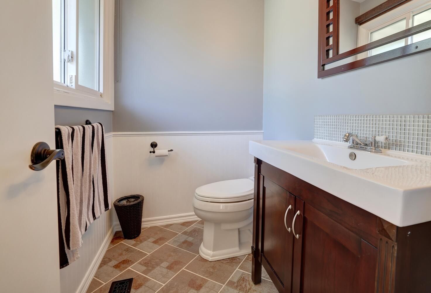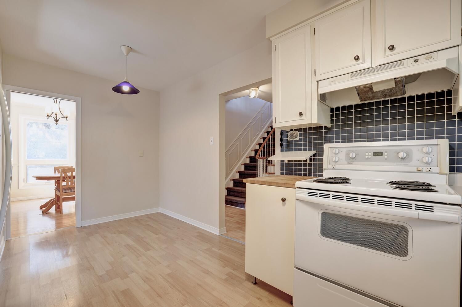 • Family-sized kitchen with breakfast area and ceramic backsplash.