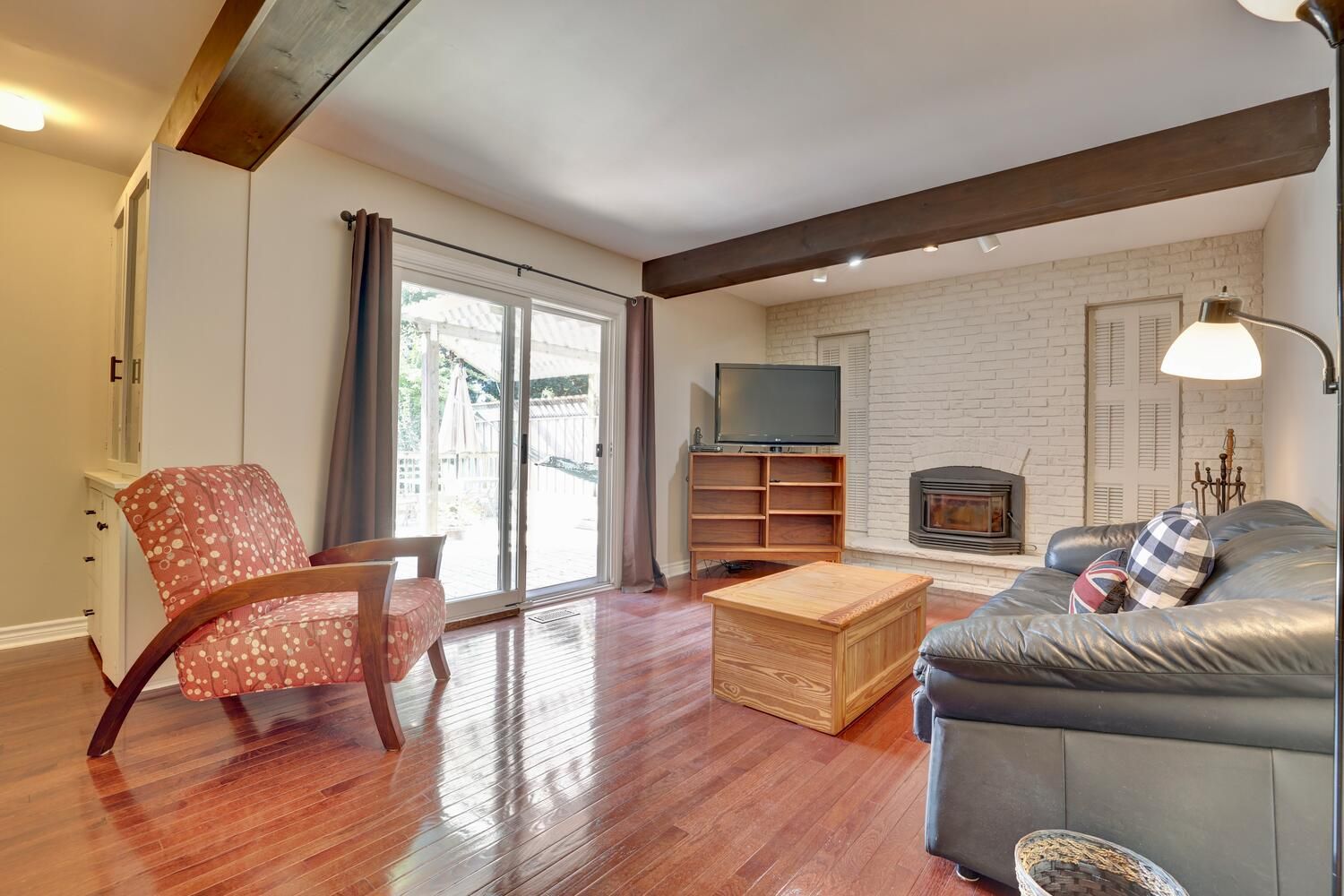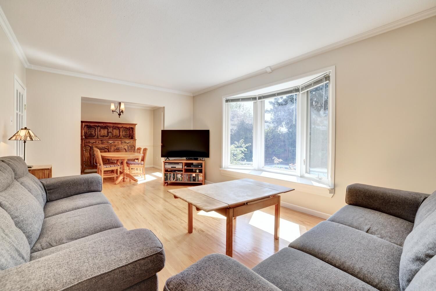 • Large living/dining area with hardwood floors and a view of the pool.
