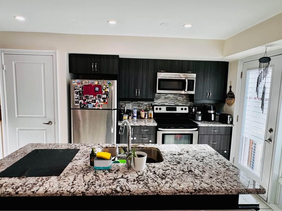 • Modern kitchen with stainless steel appliances and granite countertops.