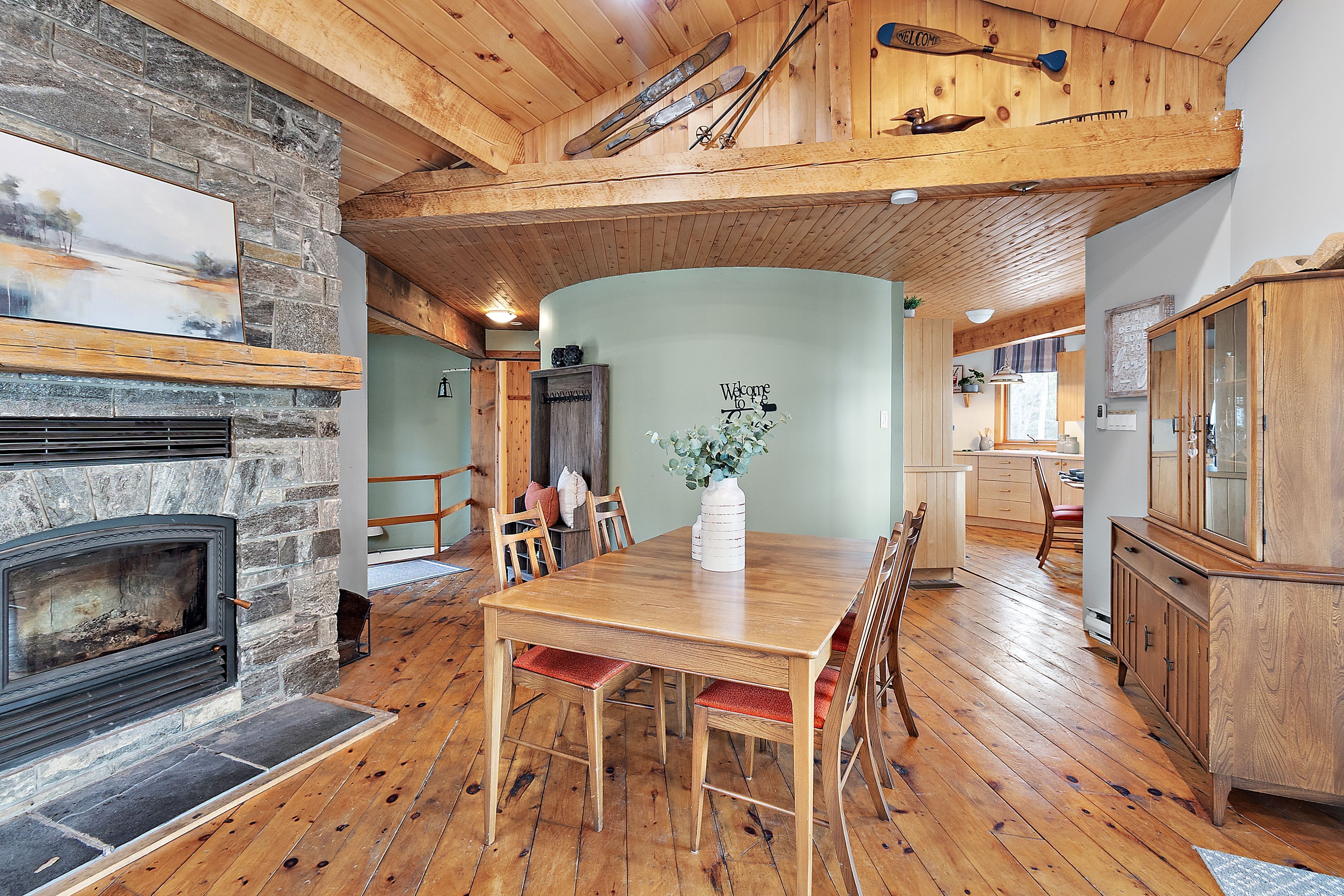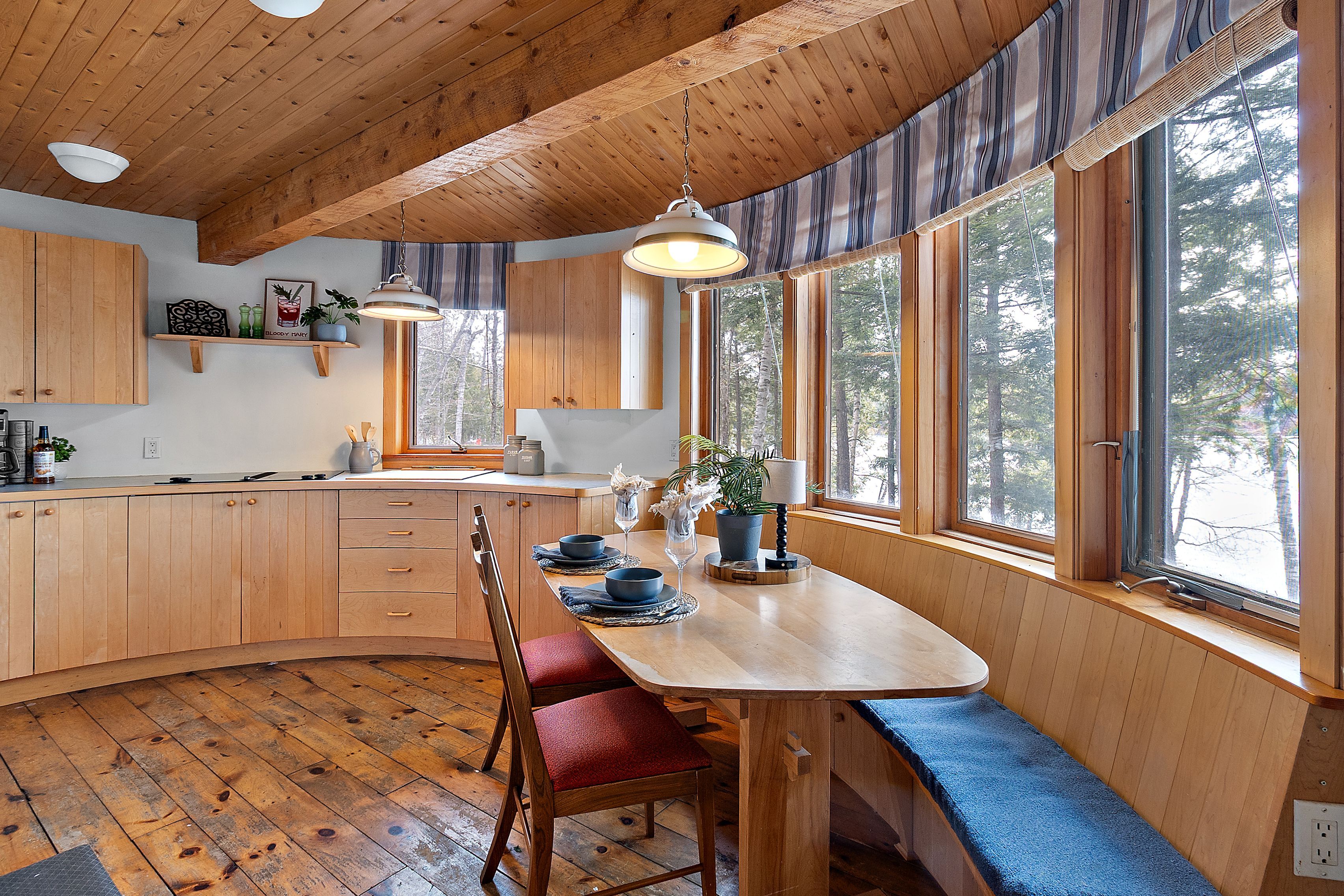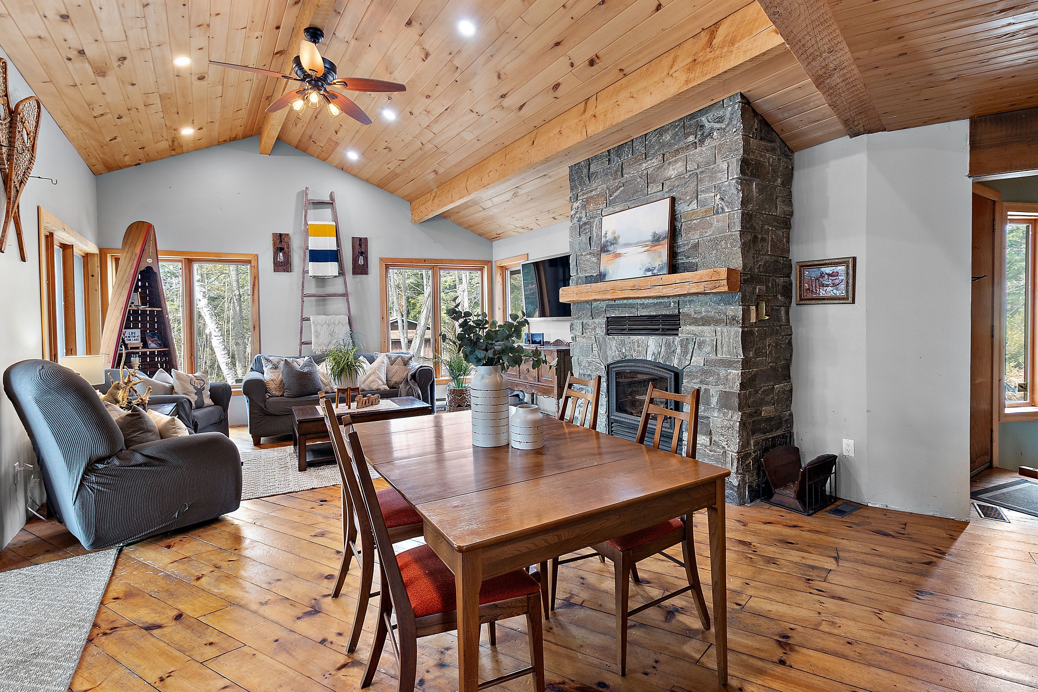 • Bright open-concept living area with large windows and cathedral ceilings.
