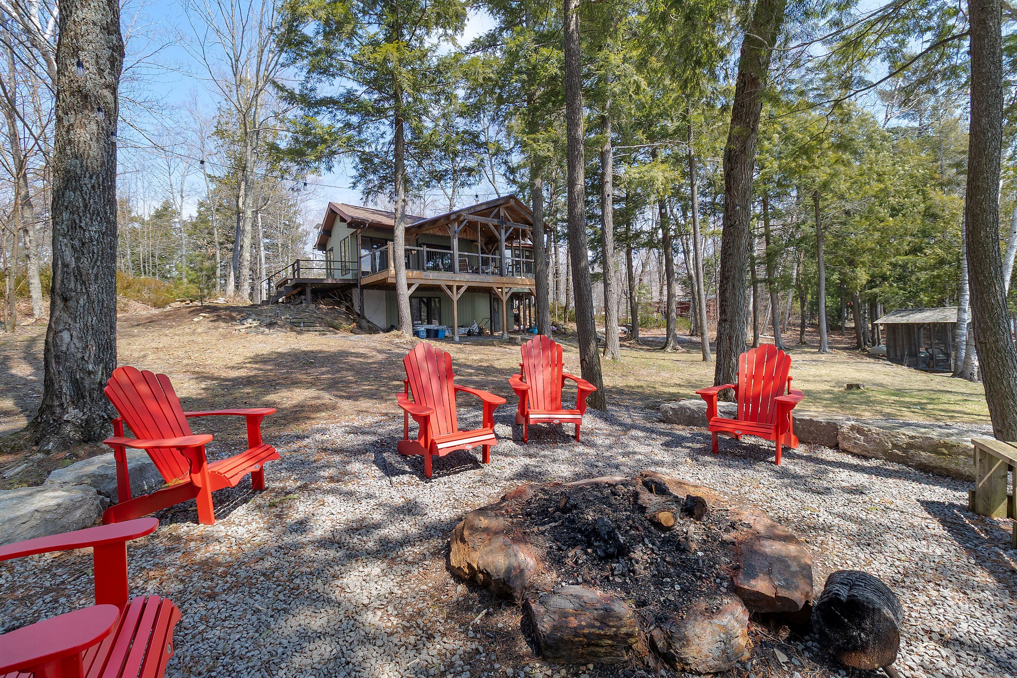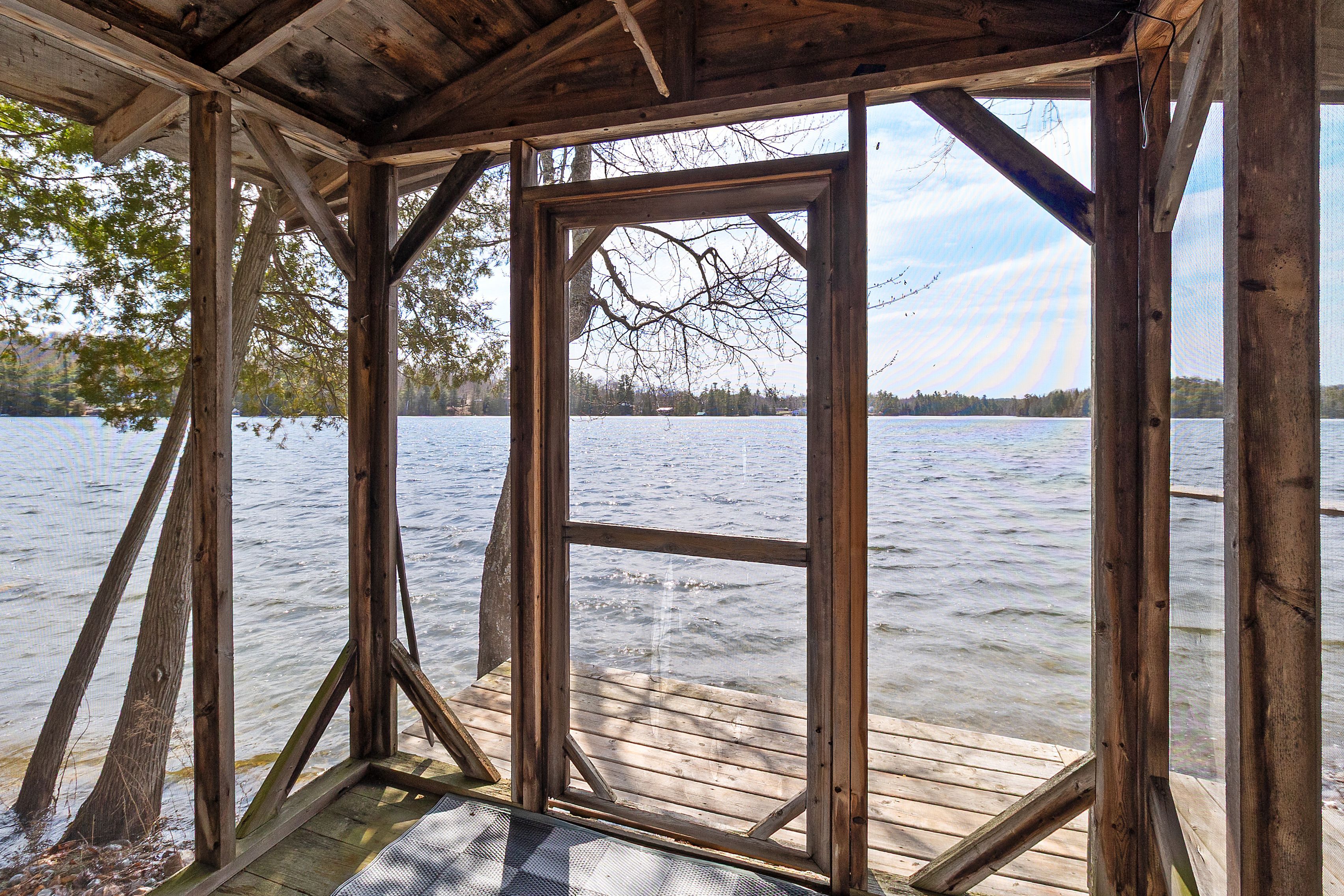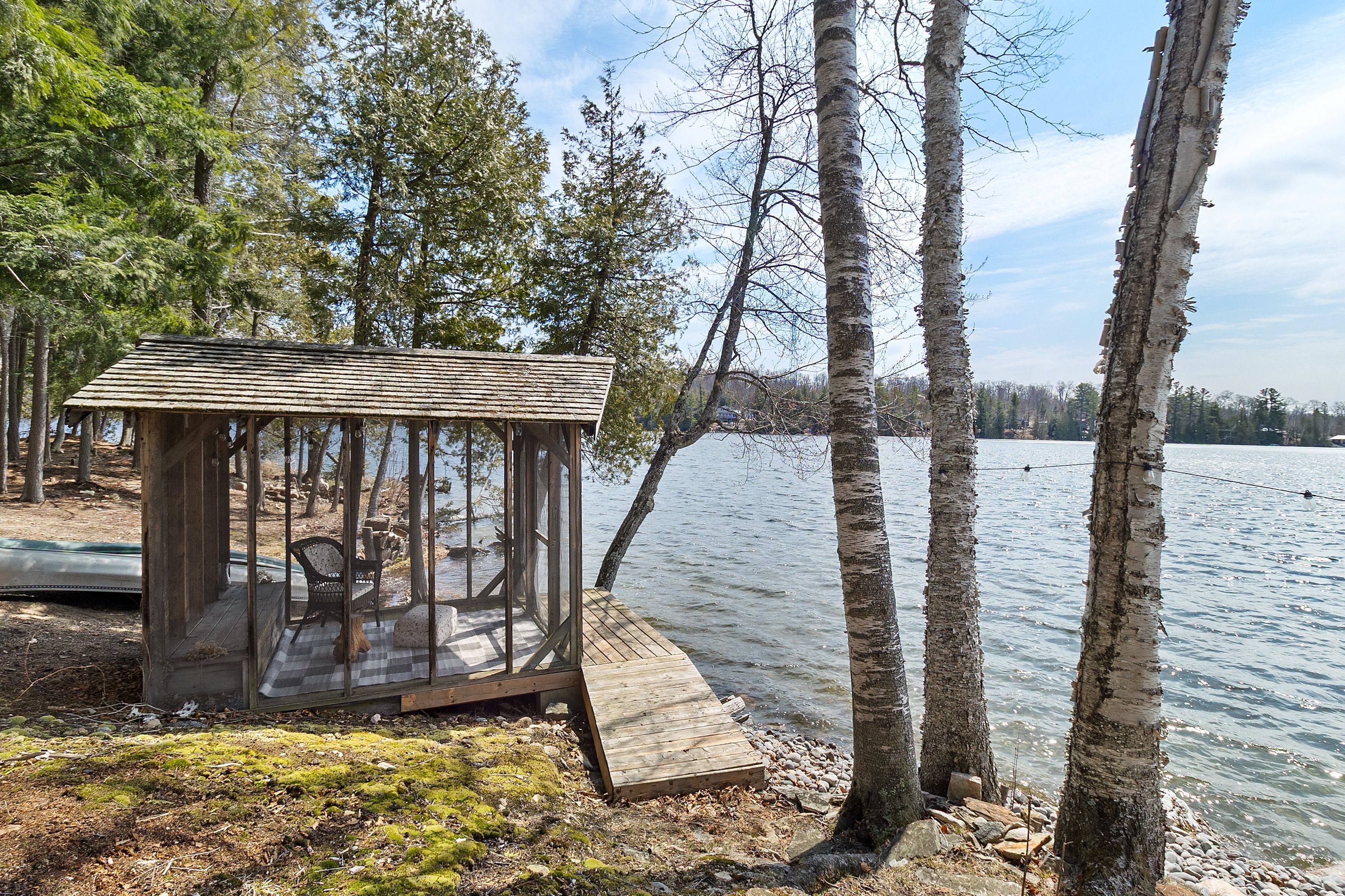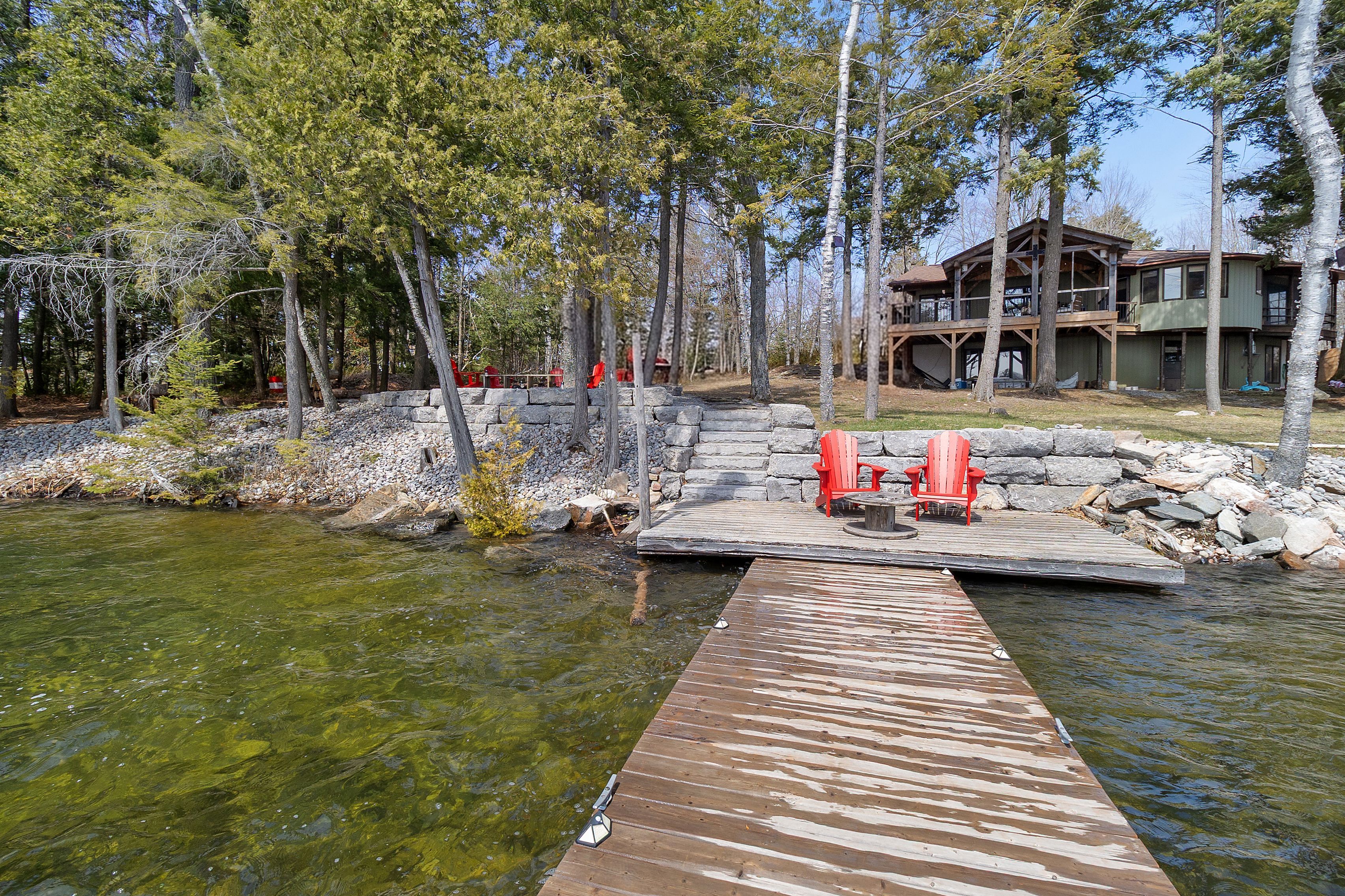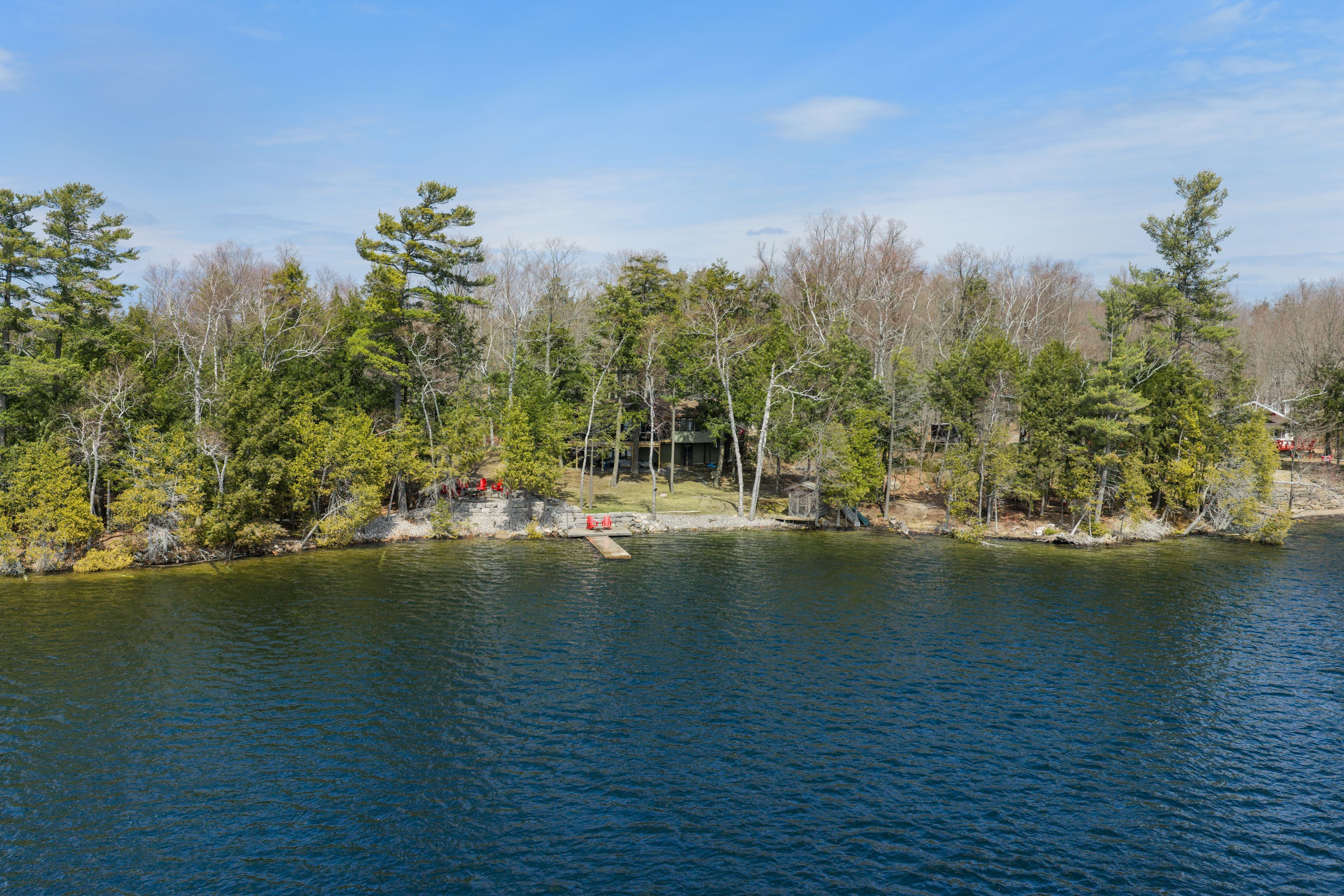 Rare opportunity to own a serene, four-season retreat set on the peninsula of grindstone lake. Impressive, approx 300 feet of pristine shoreline, this exceptional property offers breathtaking, panoramic water views from nearly every angle. Tucked away in a uniquely private setting, the peninsula location ensures minimal traffic, maximum tranquility, and front-row access to some of the lake's most picturesque scenery. Perfect for those who appreciate nature, with frequent wildlife sightings adding to the experience. Designed for both relaxation and entertaining, the outdoor spaces are truly special. An expansive covered deck invites gatherings with family and friends, while the screened-in porch, off the primary bdrm, provides a quiet, bug-free escape to enjoy your morning coffee or unwind at sunset. Down by the water, the private dock is ready for endless summer days spent boating, swimming, and fishing. Inside, the home showcases a bright and airy open-concept living & dining area, highlighted by cathedral ceilings and a stunning floor to ceiling stone fireplace that creates a warm and inviting focal point. Large windows throughout the home capture the beauty of the lake, bringing the outdoors in, and filling the space with natural light. Charm and character, make this home truly one of a kind. The walkout basement presents a fantastic opportunity to customize additional living spaces to suit your needs. Equipped with modern essentials including a propane furnace, well, and septic system, along with reliable cell and internet service, this property ensures comfort year-round. With maintained year road access and the nearby community of plevna just a short drive away for everyday conveniences, makes this an ideal setting for a full-time residence or the ultimate seasonal escape. Whether you're seeking peaceful lakeside living or a place to create lasting memories in every season, this home delivers an unmatched lifestyle.