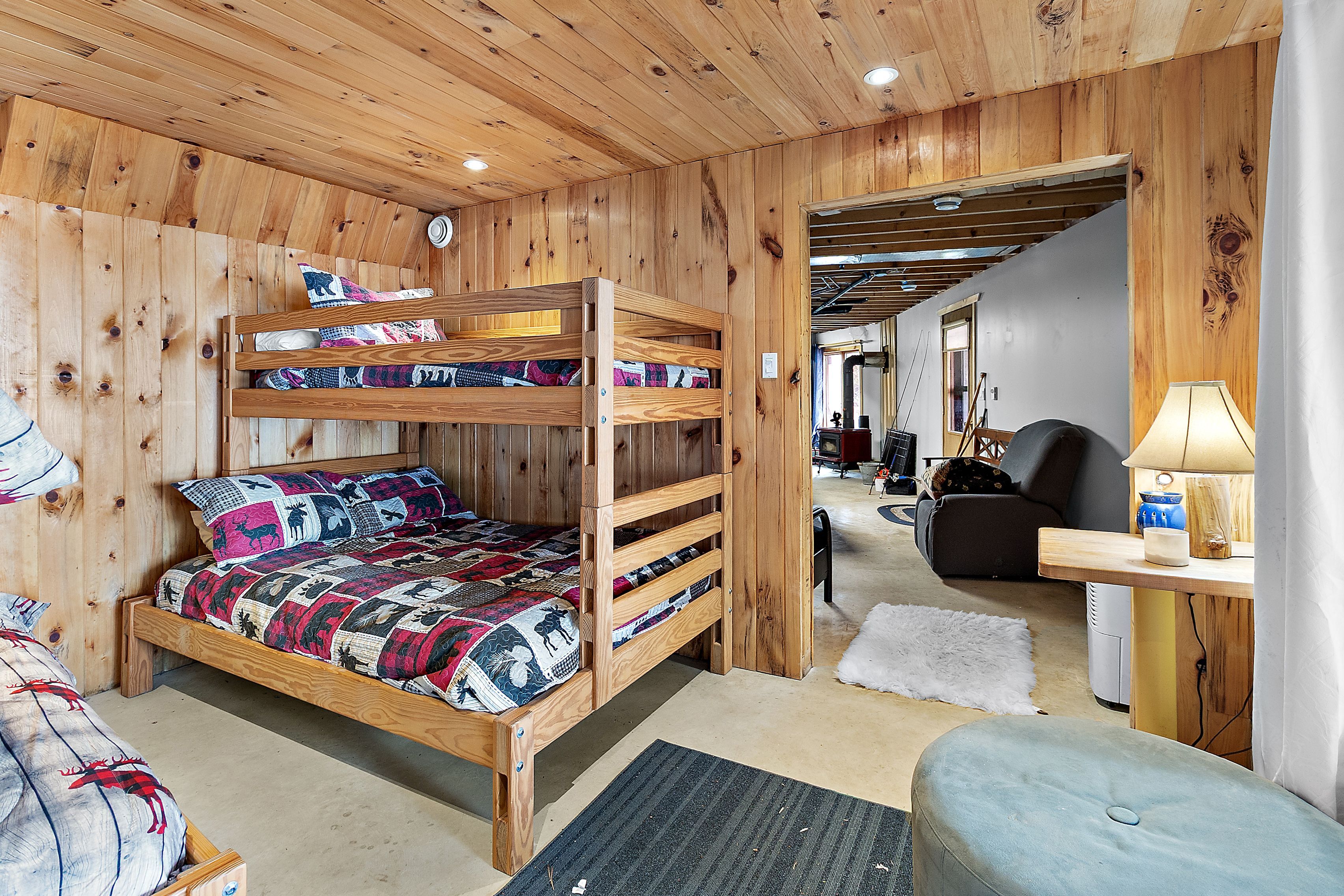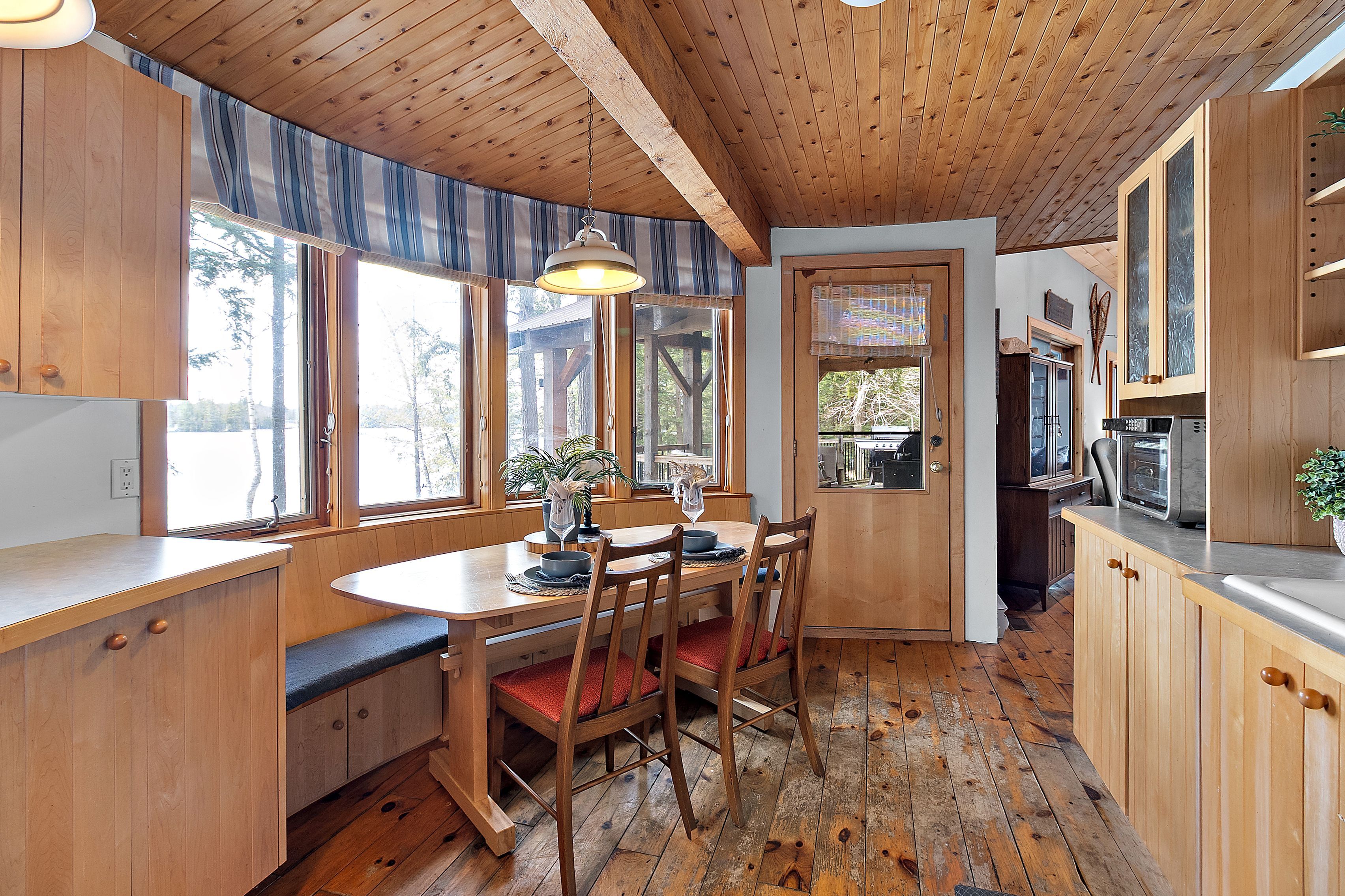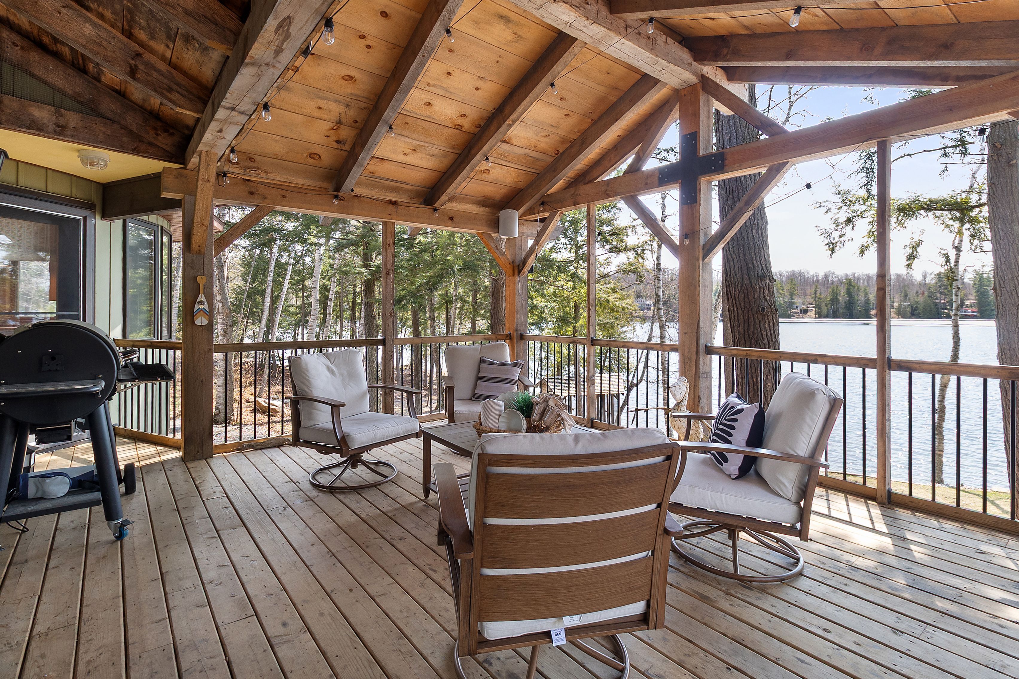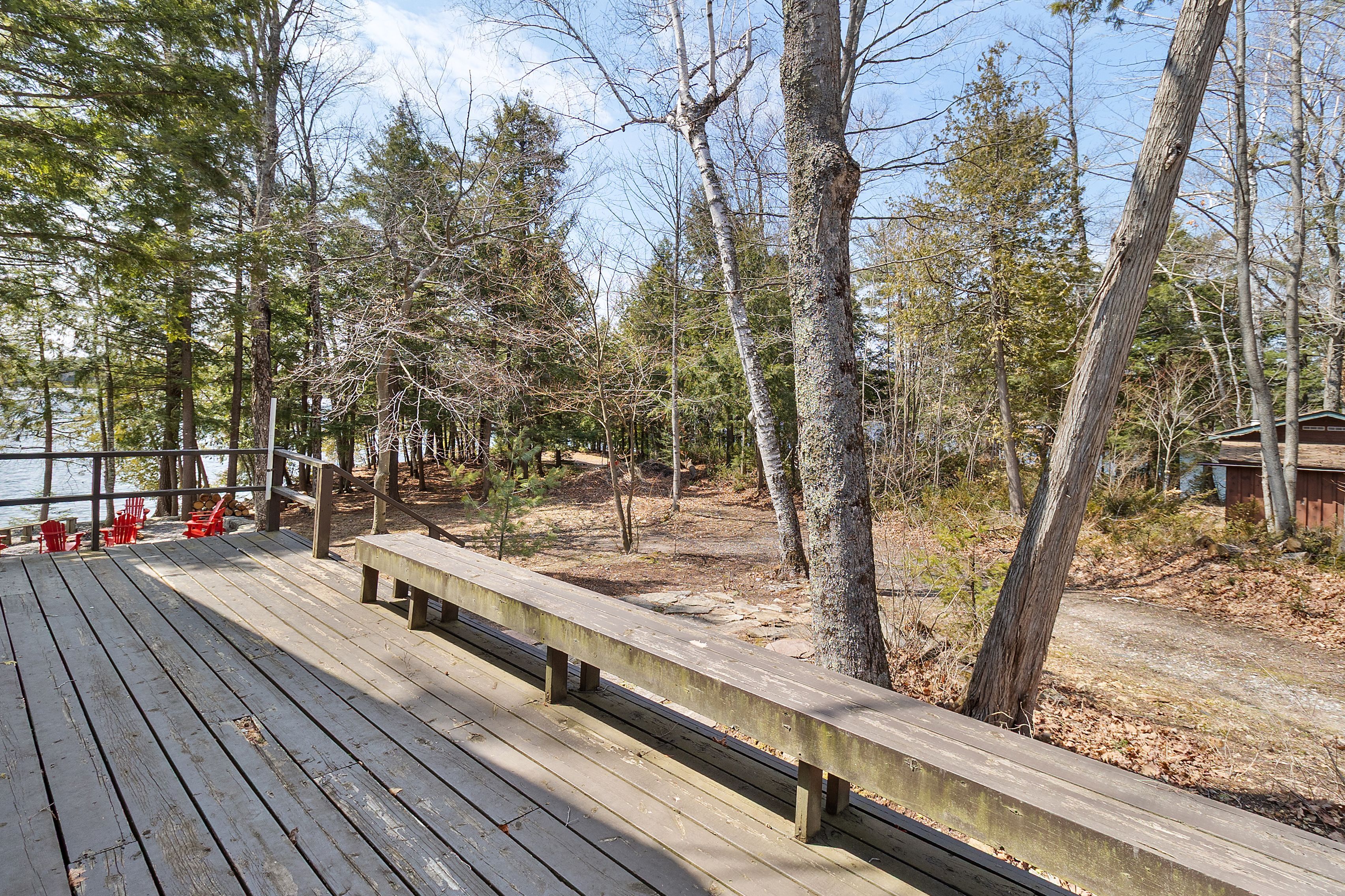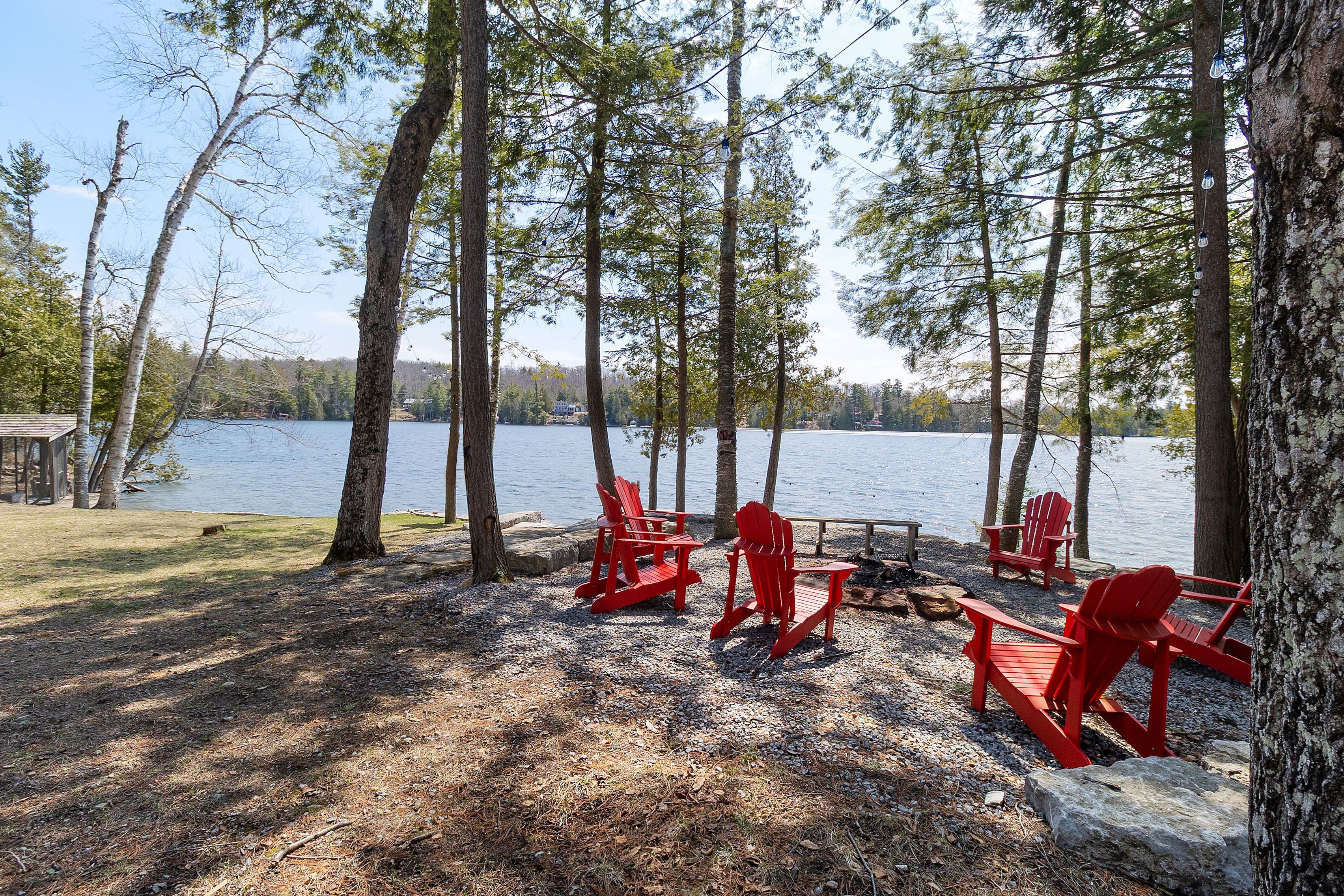 Rare opportunity to own a serene, four-season retreat set on the peninsula of grindstone lake. Impressive, approx 300 feet of pristine shoreline, this exceptional property offers breathtaking, panoramic water views from nearly every angle. Tucked away in a uniquely private setting, the peninsula location ensures minimal traffic, maximum tranquility, and front-row access to some of the lake's most picturesque scenery. Perfect for those who appreciate nature, with frequent wildlife sightings adding to the experience. Designed for both relaxation and entertaining, the outdoor spaces are truly special. An expansive covered deck invites gatherings with family and friends, while the screened-in porch, off the primary bdrm, provides a quiet, bug-free escape to enjoy your morning coffee or unwind at sunset. Down by the water, the private dock is ready for endless summer days spent boating, swimming, and fishing. Inside, the home showcases a bright and airy open-concept living & dining area, highlighted by cathedral ceilings and a stunning floor to ceiling stone fireplace that creates a warm and inviting focal point. Large windows throughout the home capture the beauty of the lake, bringing the outdoors in, and filling the space with natural light. Charm and character, make this home truly one of a kind. The walkout basement presents a fantastic opportunity to customize additional living spaces to suit your needs. Equipped with modern essentials including a propane furnace, well, and septic system, along with reliable cell and internet service, this property ensures comfort year-round. With maintained year road access and the nearby community of plevna just a short drive away for everyday conveniences, makes this an ideal setting for a full-time residence or the ultimate seasonal escape. Whether you're seeking peaceful lakeside living or a place to create lasting memories in every season, this home delivers an unmatched lifestyle.