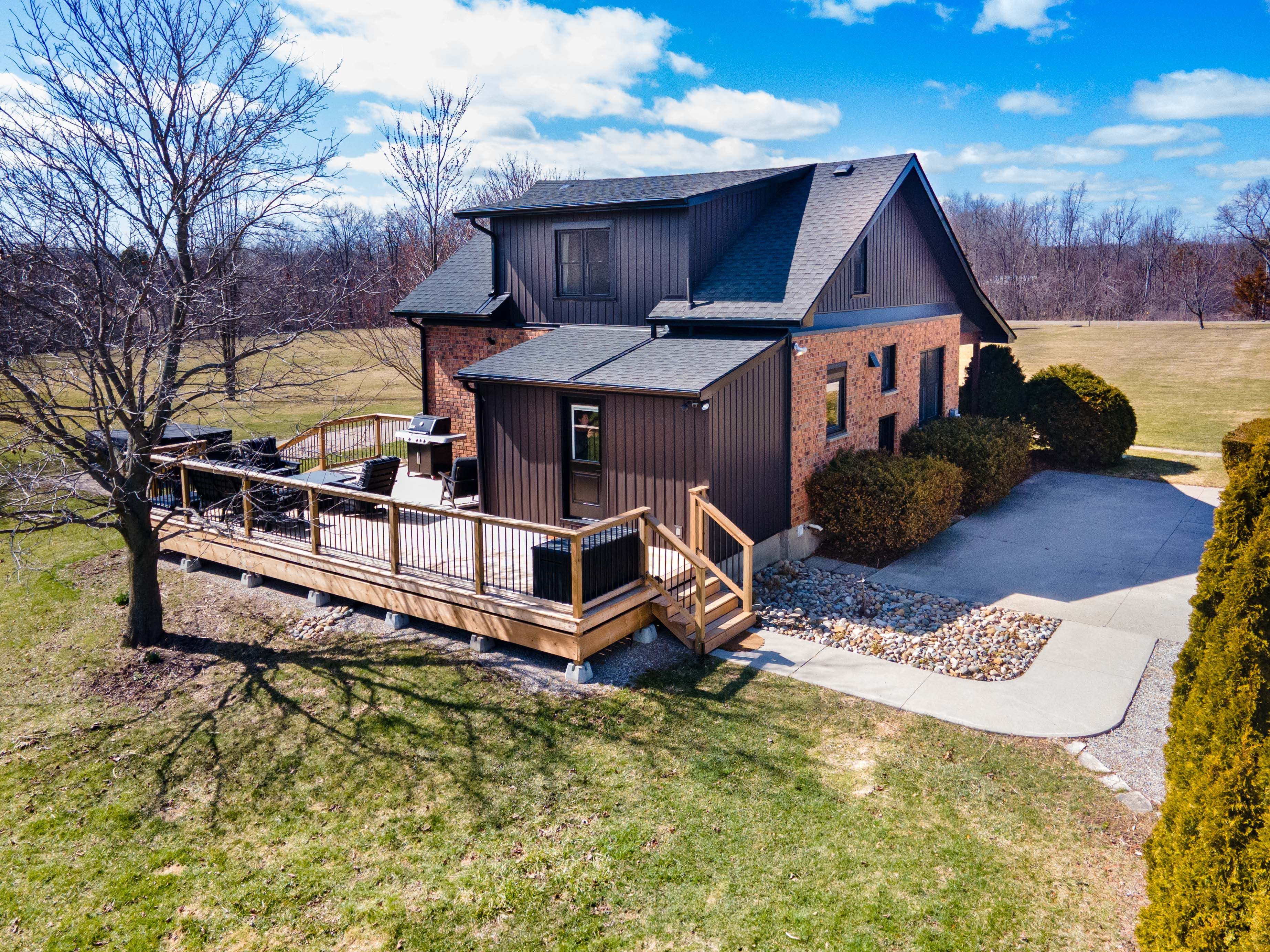 • Expansive outdoor spaces with a deck and hot tub overlooking countryside.