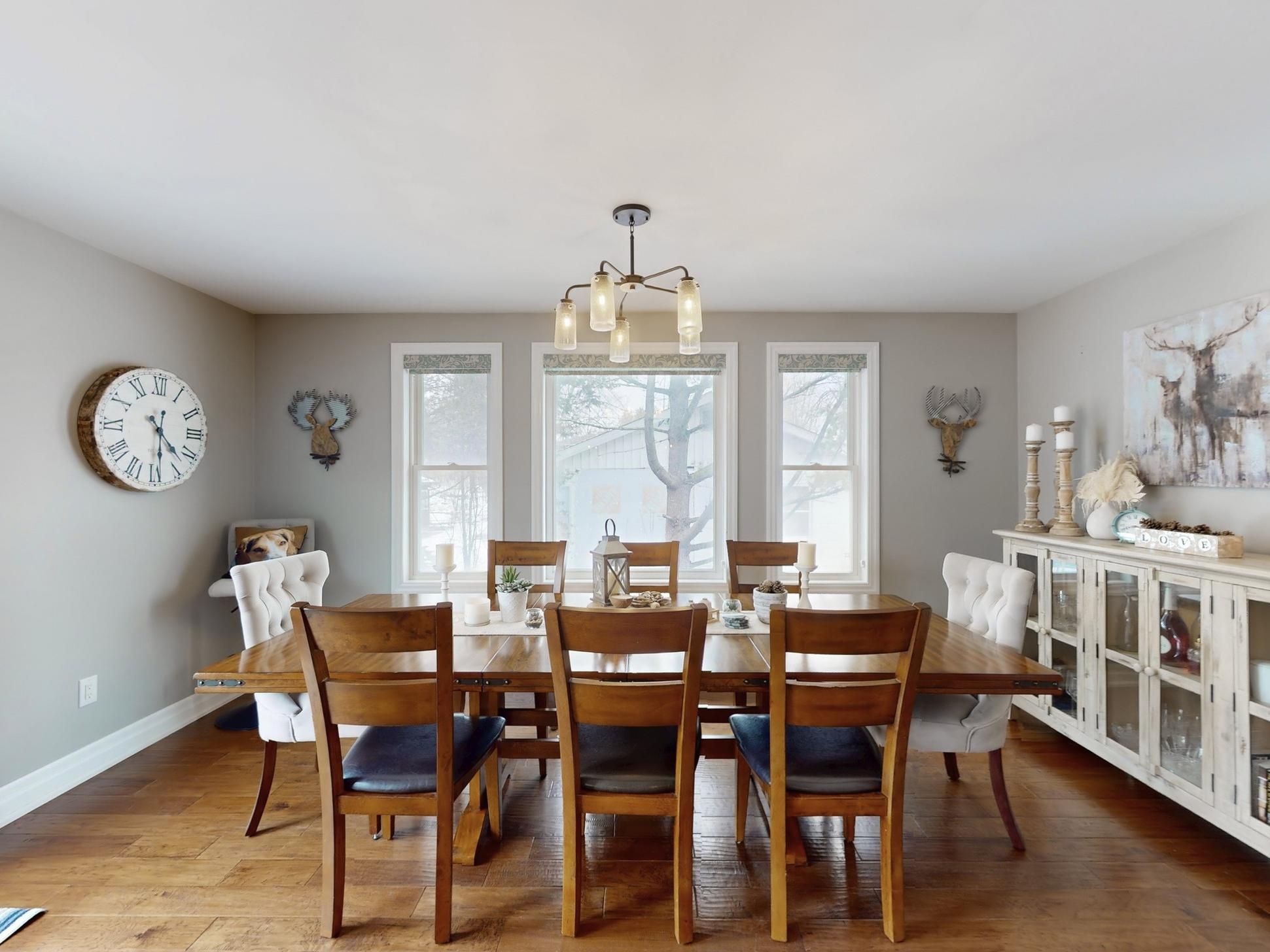 Welcome to 23285 lakeridge road, a beautifully appointed 3+2 bedroom raised bungalow with approximately 3,000sqft of finished living space! This home features a charming wrap-around front porch, set on a spacious lot backing onto forest for an exceptional sense of privacy, comfort, and style. Thoughtfully designed, this inviting home features smooth ceilings, engineered hardwood flooring throughout the main level, large picture windows that fill the interior with natural light, and a bright open-concept layout ideal for both everyday living and entertaining. Generously sized principal rooms offer excellent functionality, while the primary suite is enhanced by a large walk-in closet and a spa-inspired 3-piece ensuite. The kitchen is both elegant and practical, showcasing granite countertops, a farmhouse sink, breakfast bar seating, and an abundance of tall cabinetry, with a walk-out to the rear deck for seamless access to the fully fenced backyard, an ideal setting to enjoy your morning coffee or unwind at the end of the day. The finished lower level is bright and welcoming, complete with oversized above-grade windows, vinyl flooring, a spacious open-concept recreation room, an additional living area, two extra rooms, a dry bar, and a rough-in for a 3-piece bathroom, offering outstanding flexibility for extended family living, guest accommodations, or a future in-law suite. Set well back from the road with a long driveway and ample parking, this property offers a peaceful country setting while remaining close to everyday conveniences. Ideally located on the border of brock and georgina township, where you can enjoy the convenient access to amenities in both communities, including schools, parks, libraries, community centres, beaches, marinas, boat launches, and a wide range of year-round recreational opportunities. A perfect blend of lifestyle, and convenience.