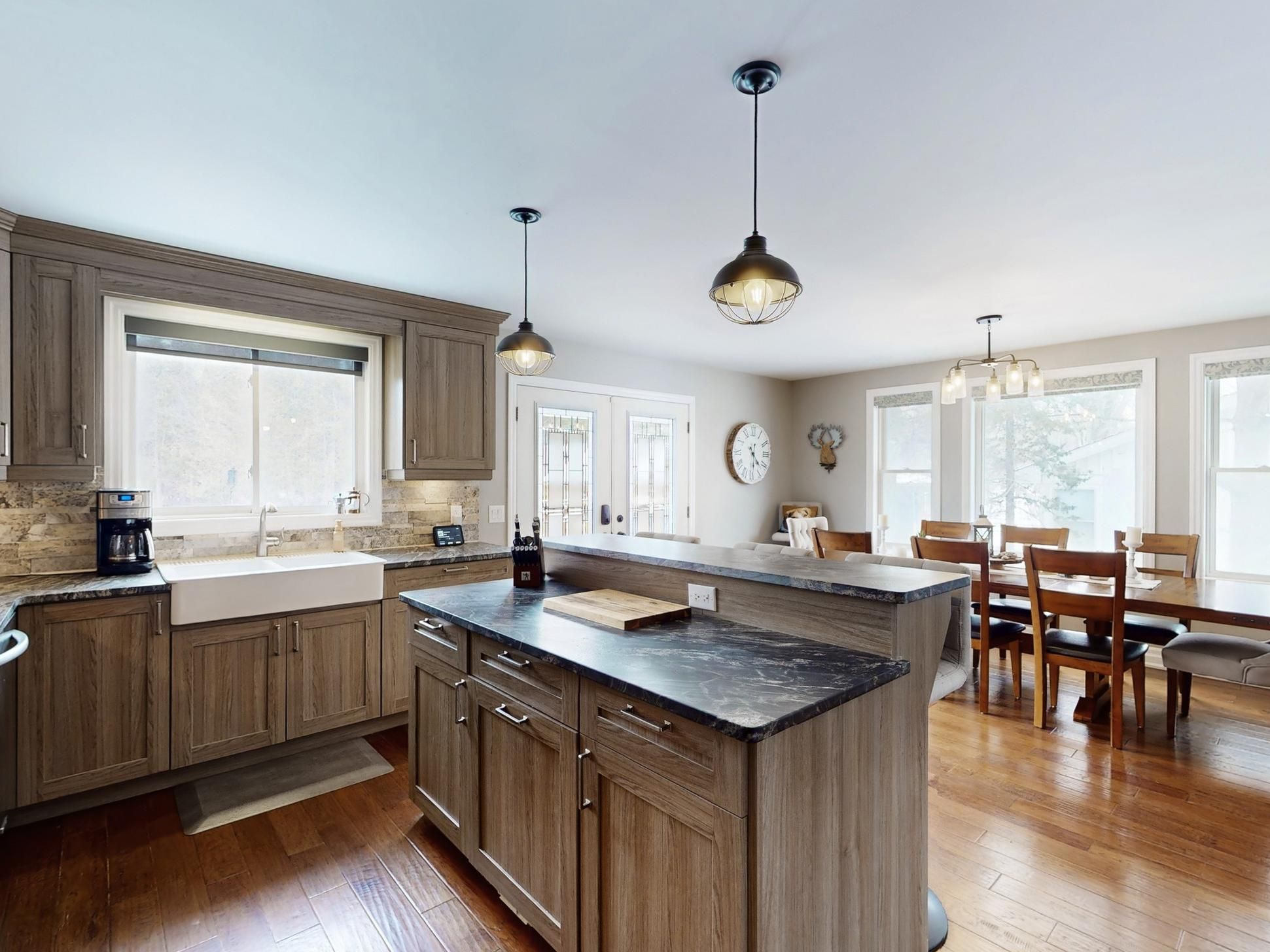 • Elegant kitchen with granite countertops and seamless access to the backyard.