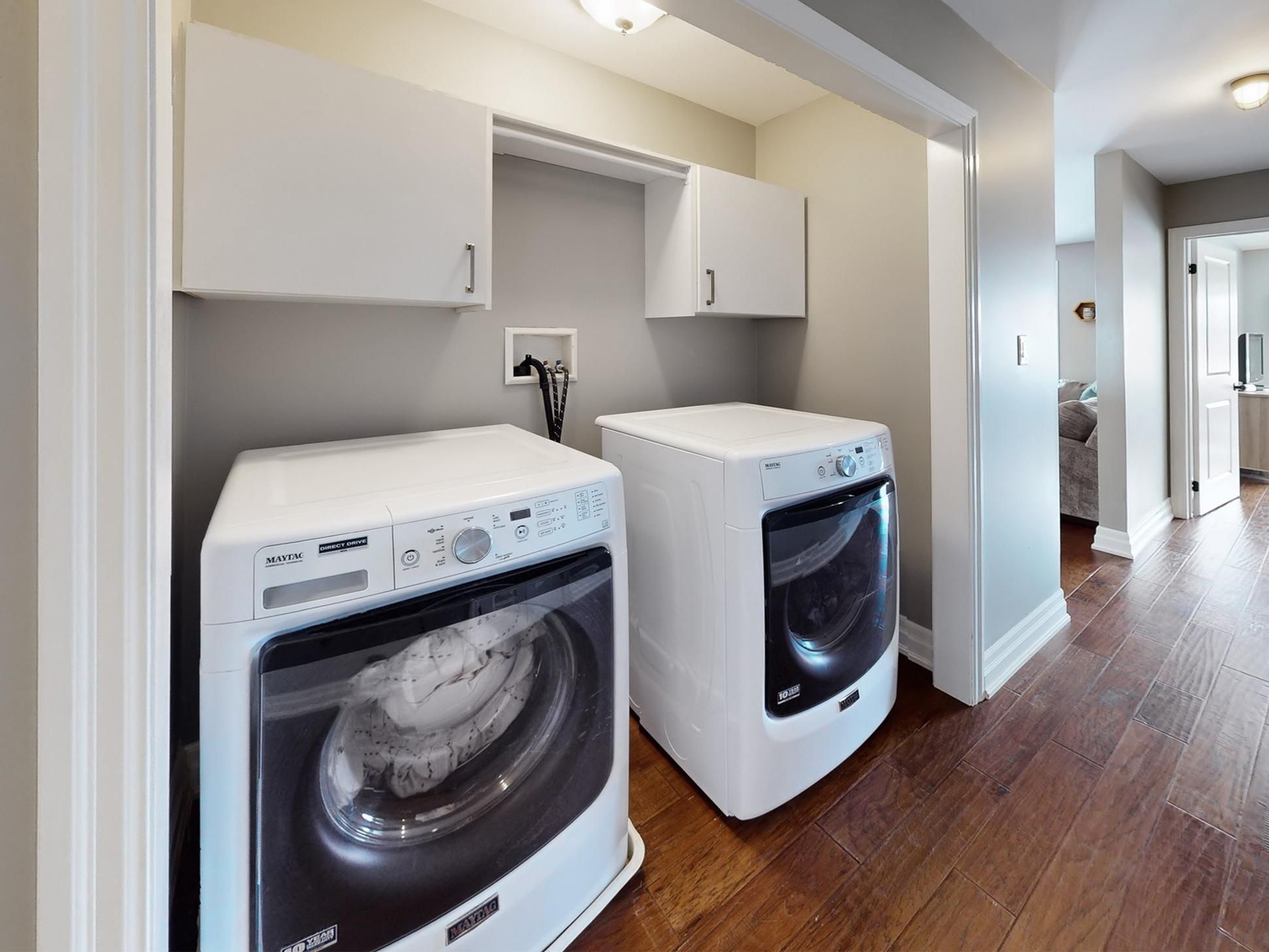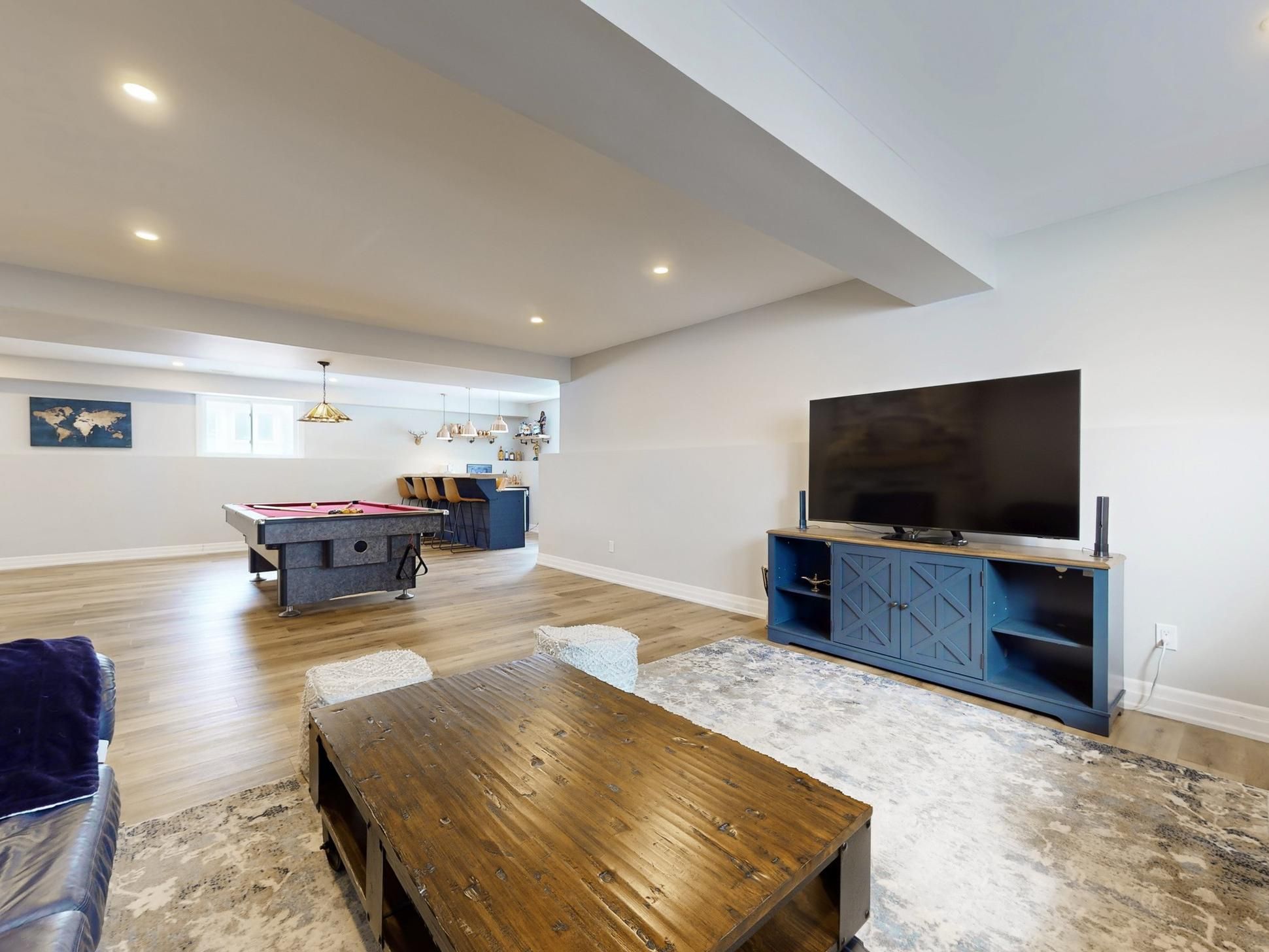 • Bright open-concept layout with large windows and engineered hardwood flooring.