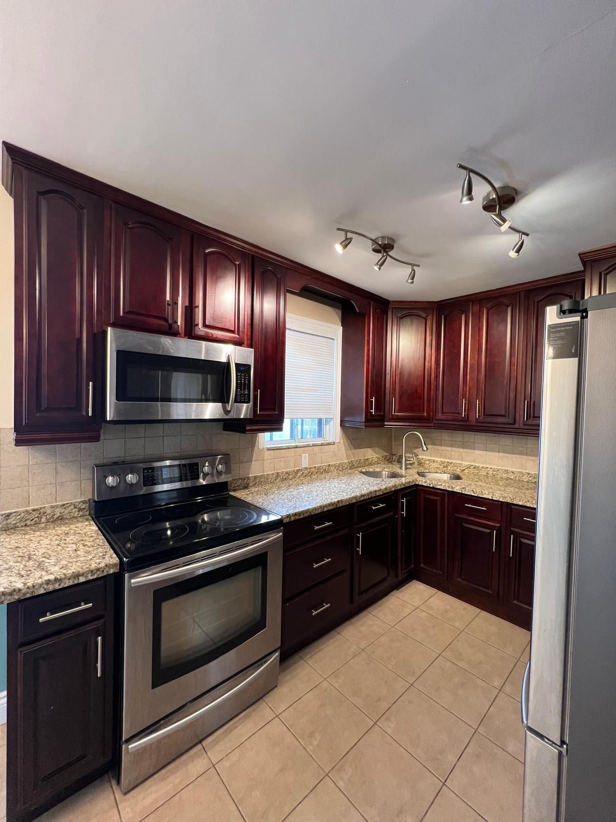 • Modern kitchen with stainless steel appliances and granite countertops.