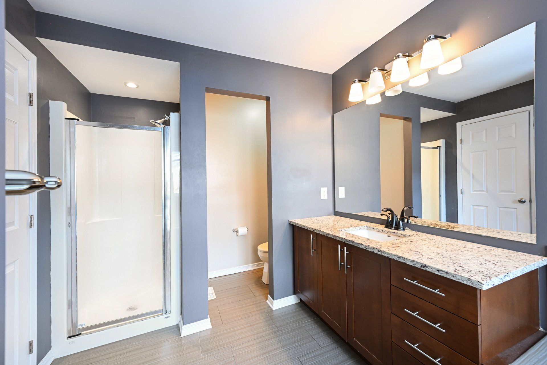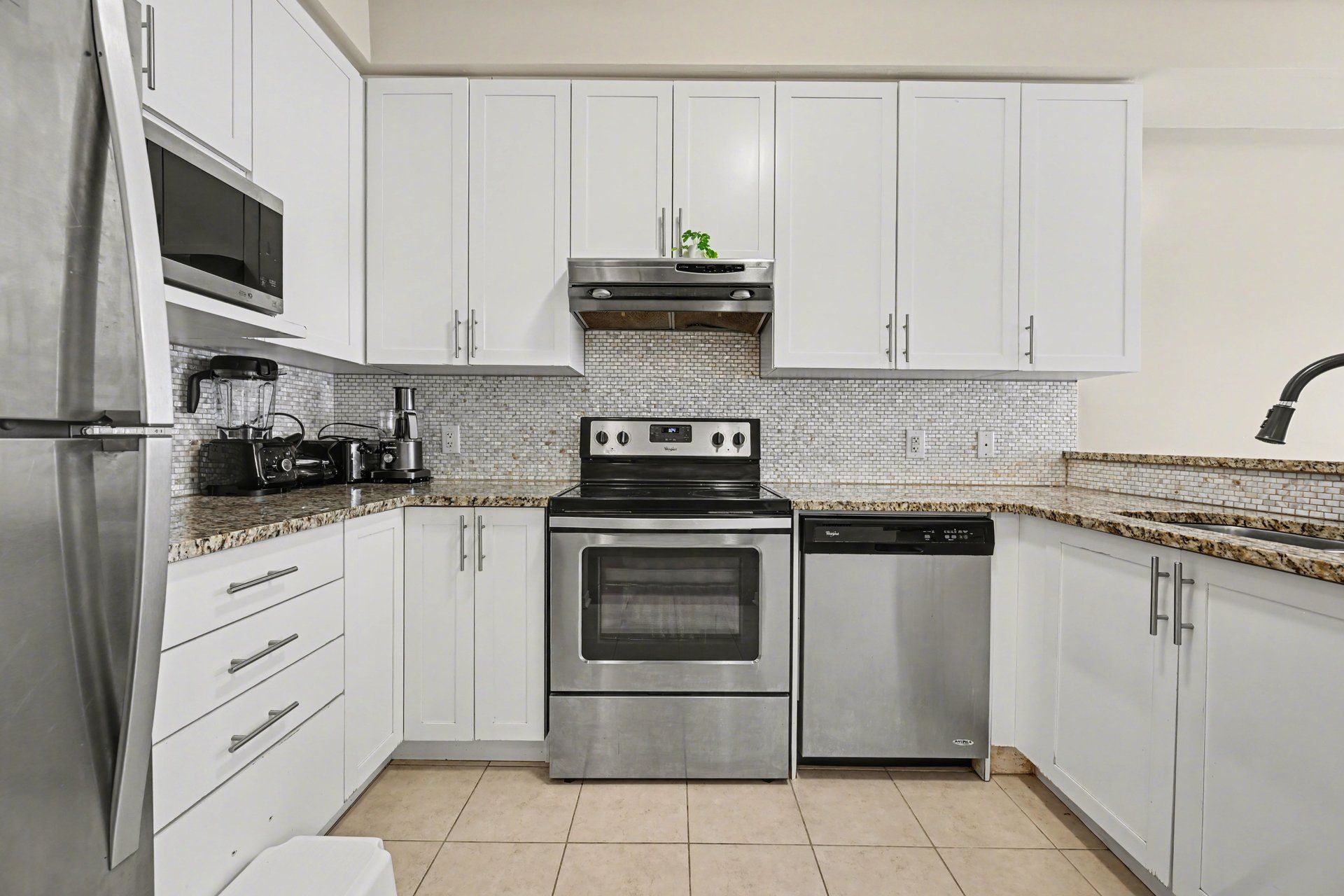 • Modern kitchen features stainless steel appliances and granite countertops.