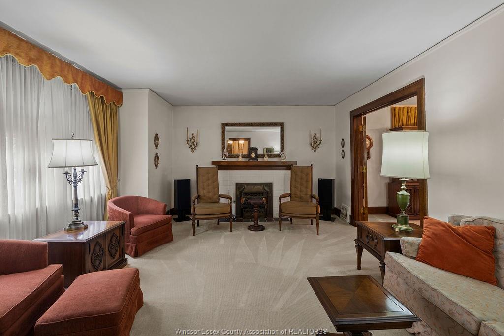 boxed out bay window area and fireplace, to the double glass french door set on the classic