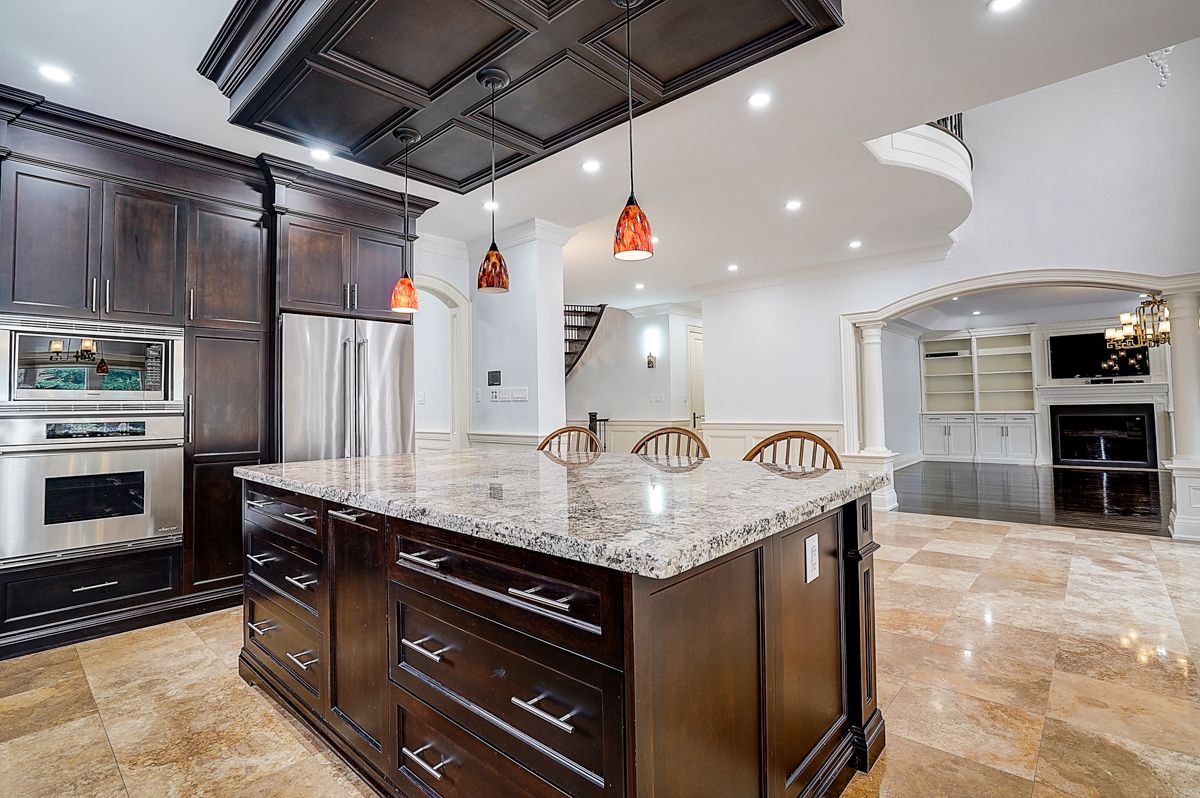 • High-end chef's kitchen overlooking a spacious pool and oversized yard.