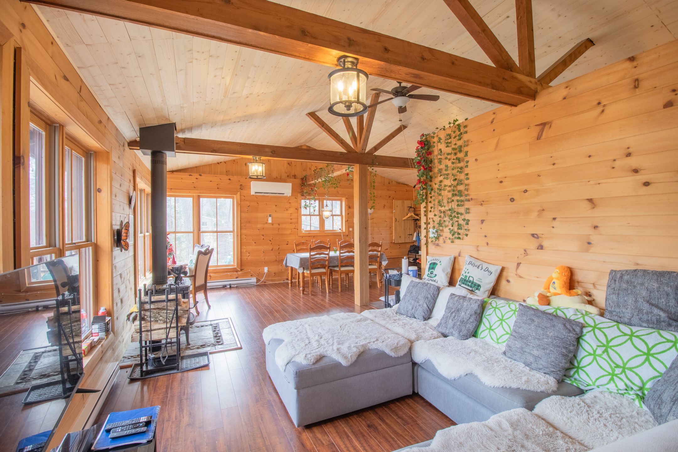 Welcome to this charming water front 4 season cottage is enveloped by a lush green oasis on a 1. 23 acre of land, nestled on a huge lot, just 40 minutes from ottawa, offering fantastic privacy and a direct connection to nature. Surrounded by towering trees and the soothing sounds of the madawaska river, this retreat blends rustic charm with modern comfort. Inside, the two bedroom, two bathroom space boasts an open-concept design with a soaring cathedral ceiling, creating an airy, light-filled ambiance. Gather around the acoustic fireplace for cozy evenings, or unwind in the big sunroom where sunlight streams in year-round. Foam insulation in the roof and under the floor, recent installed air source heating pump/air conditioner, plus the baseboard heater and wood furnace make it really comfortable no matter in the cold winter and hot summer. Step outside to the huge deck facing the river, complete with a contemporary deck handrail ideal for dining, stargazing, or simply soaking in the serene views. The property features a private dock on the madawaska river, where very clear water invites you to enjoy fishing, swimming, and boating on the quiet, peaceful river. Practical amenities include high-speed internet(perfect for vacation stays or remote work),abundant parking space, and a new air-source heat pump for year-round comfort. Whether you are kayaking at dawn, working from the sunroom, or savoring the stillness of your green oasis, this cottage offers a rare blend of adventure and seclusion. Calabogie peaks ski resort and motorsports park in a very short driving distance. A true sanctuary where memories are made.