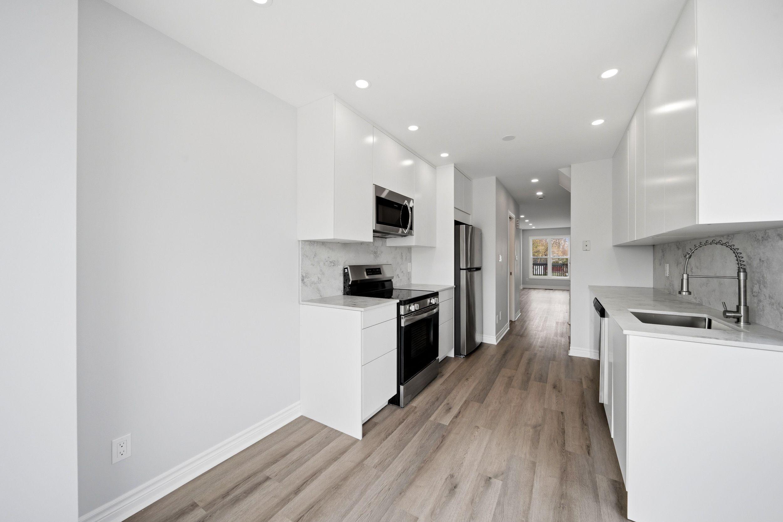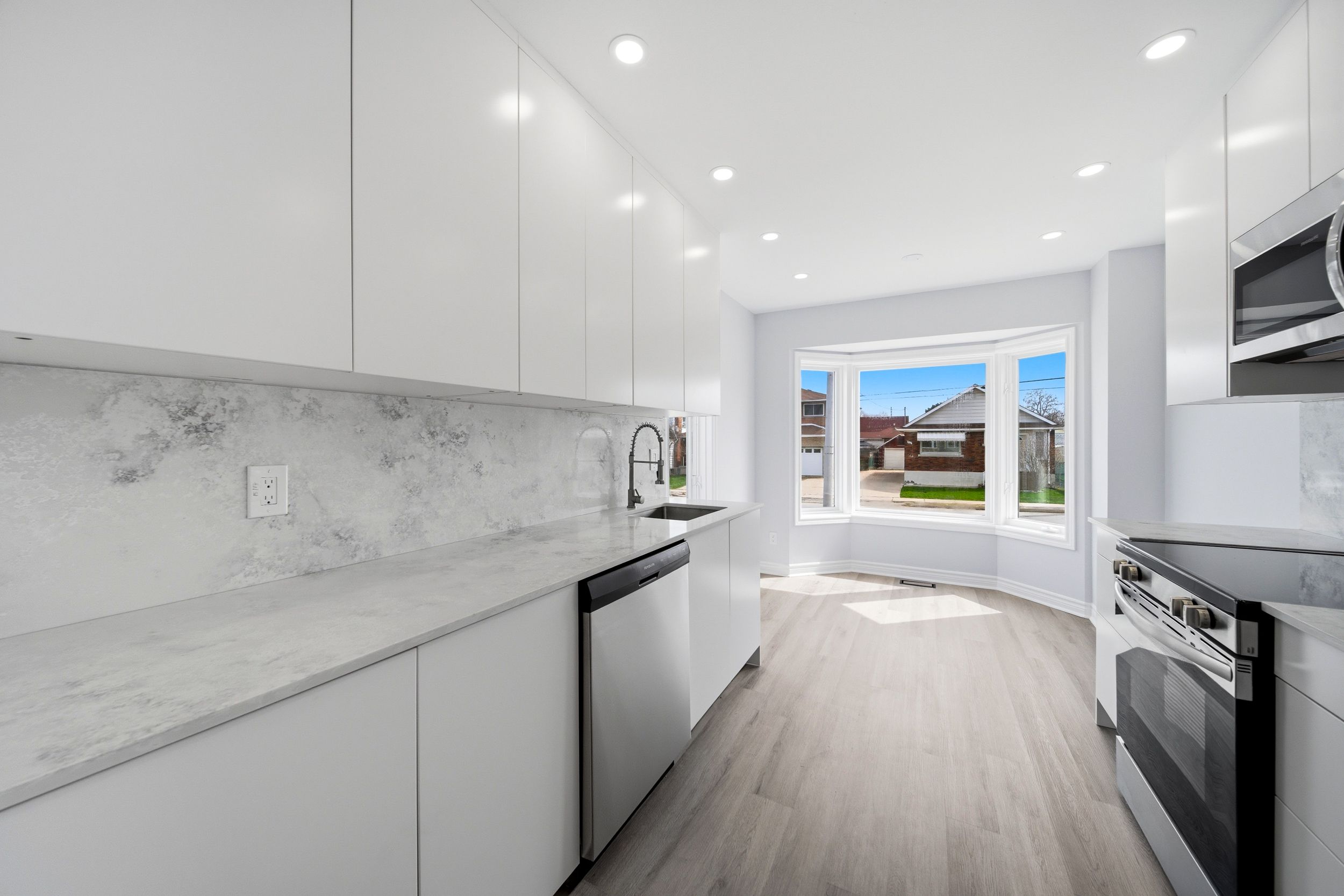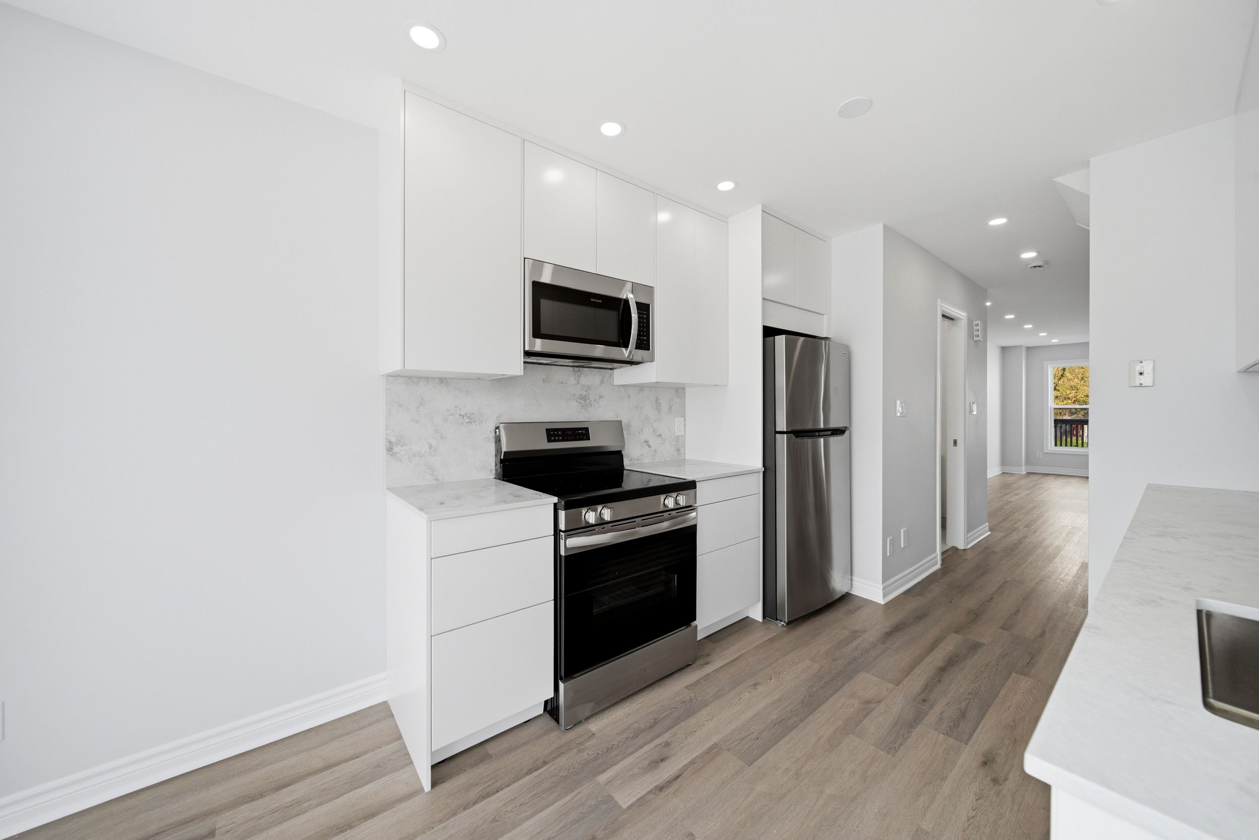 • Bright, modern kitchen with stainless steel appliances and quartz countertops.