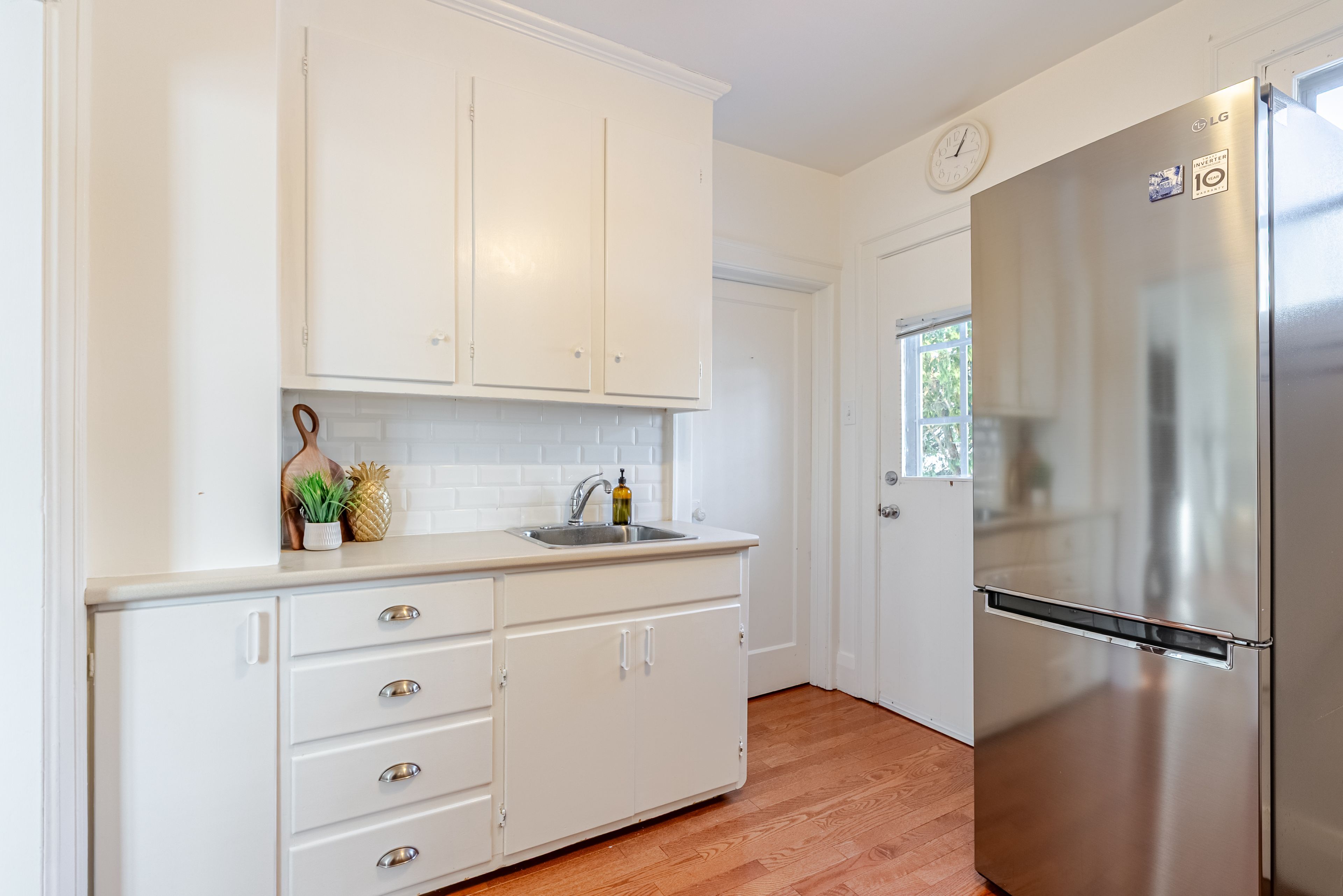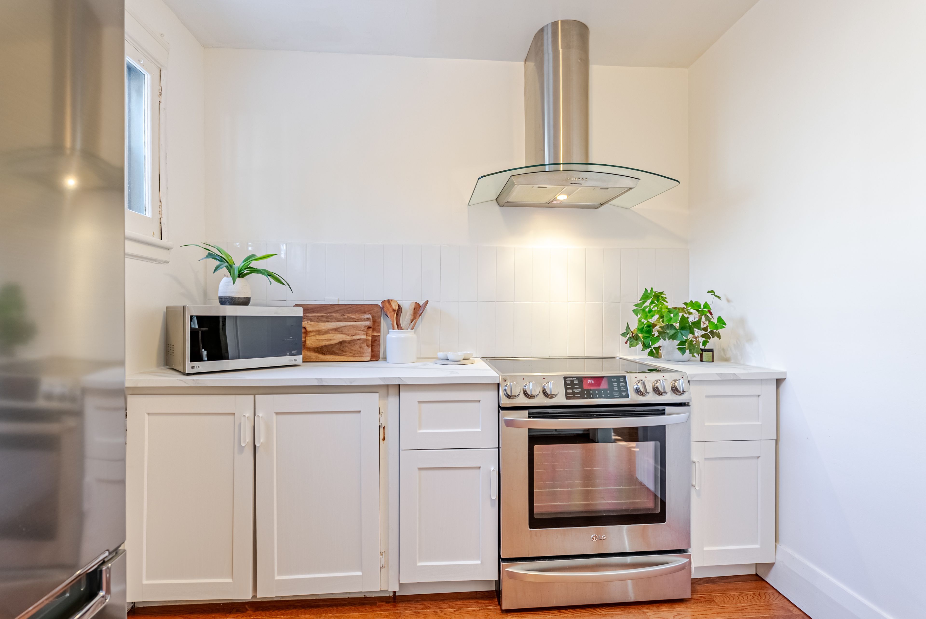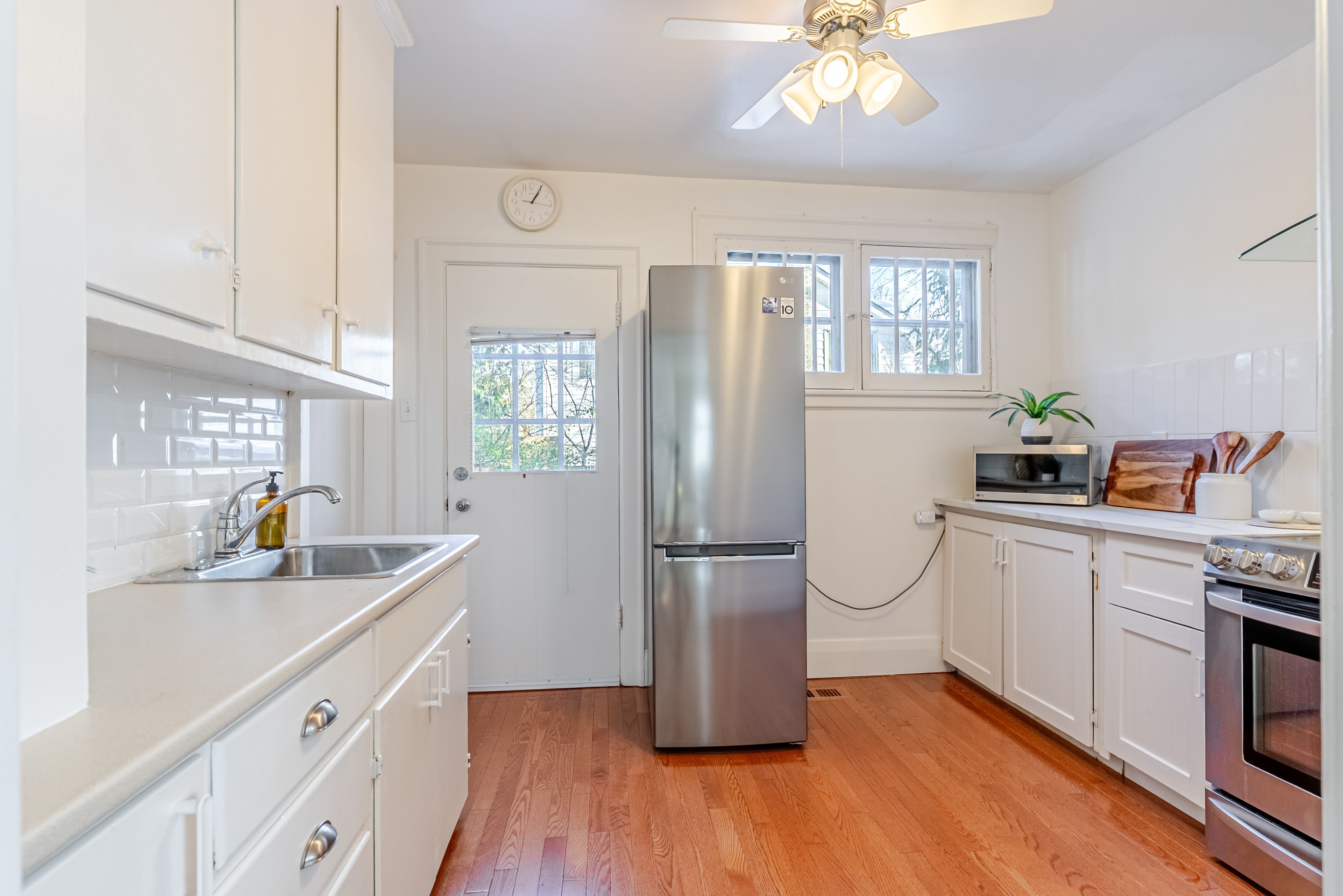 • Functional kitchen with new countertops and stainless steel appliances.