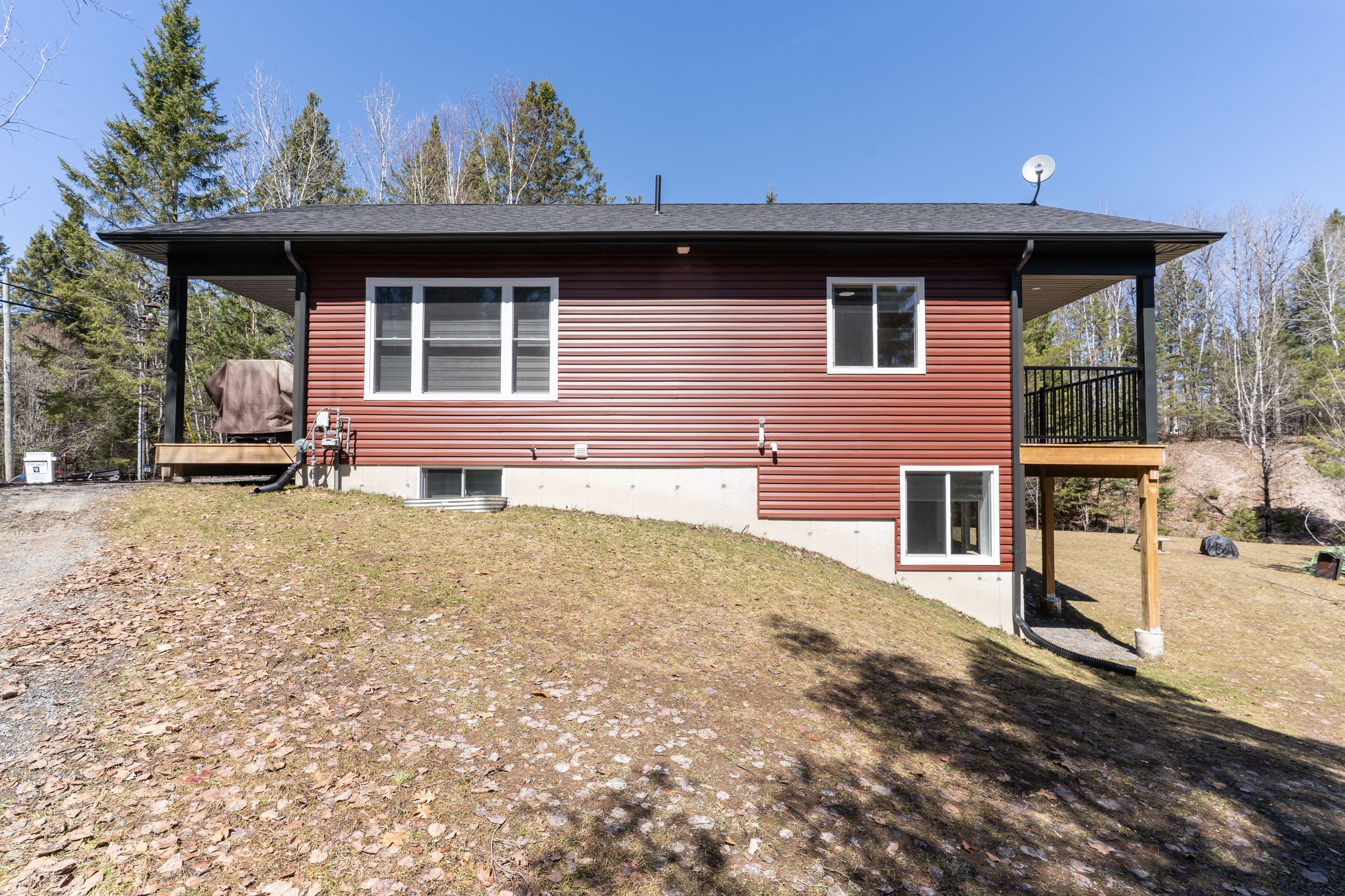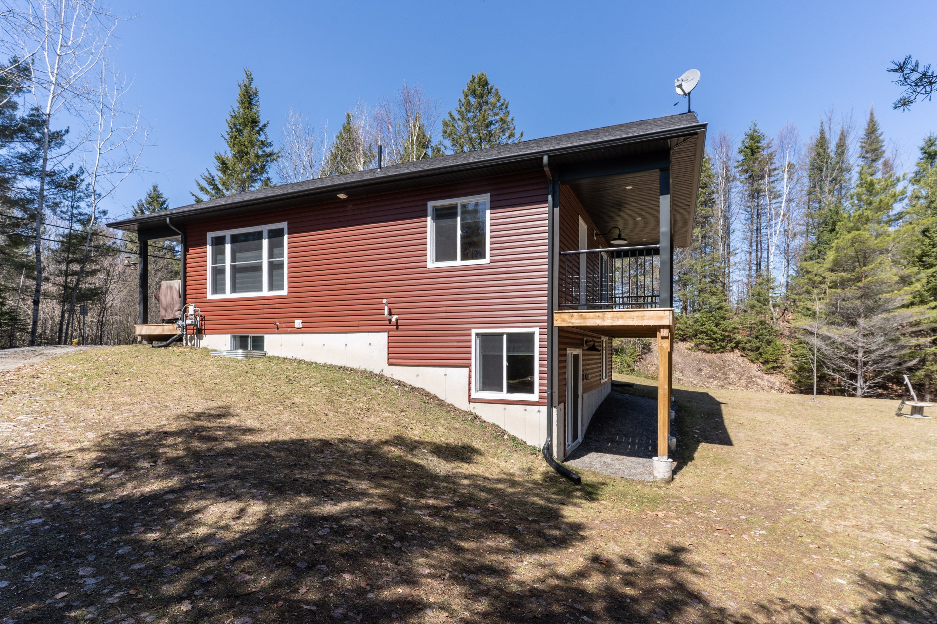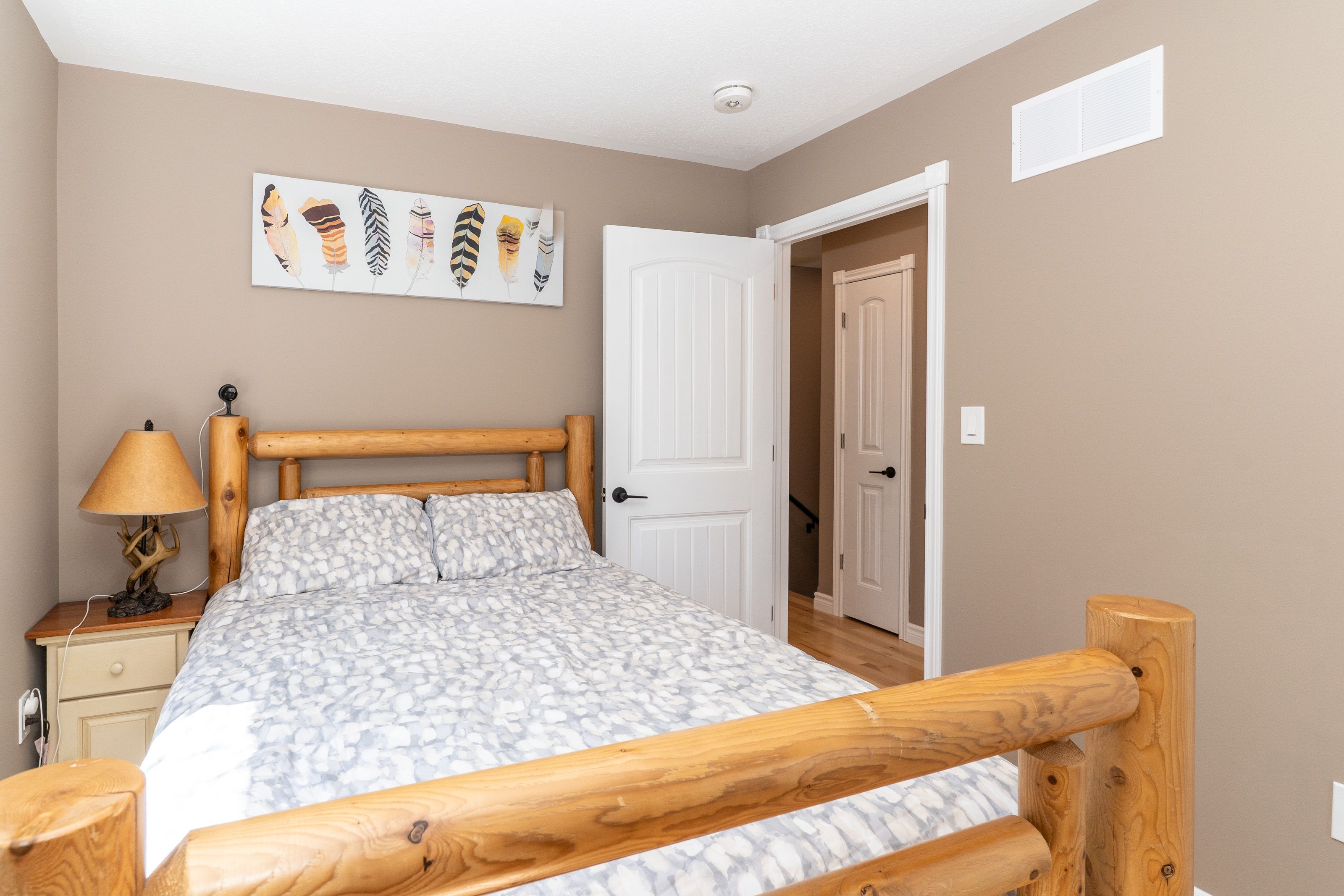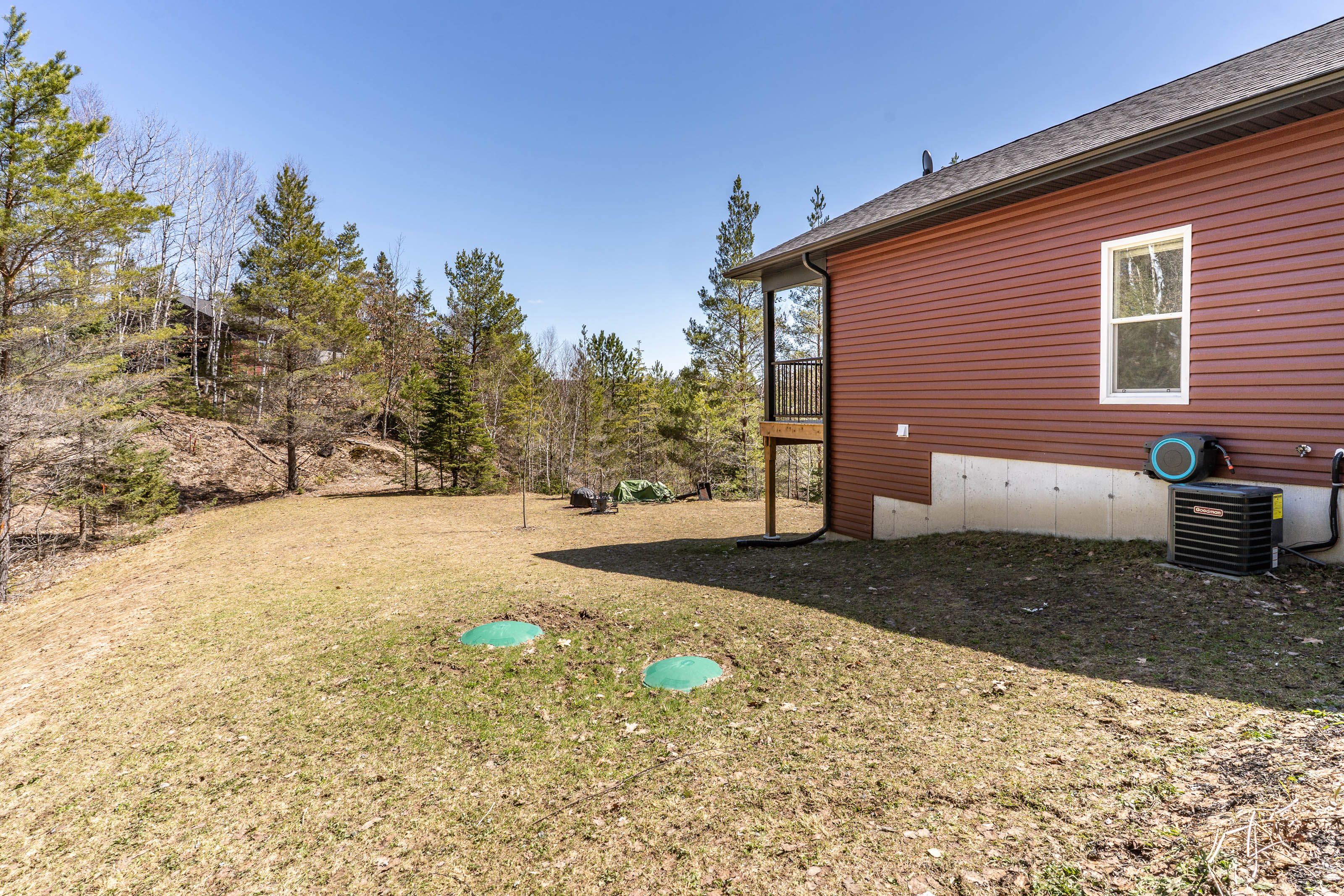 Cottage like character /setting with in town on a 1 acre lot. This 2 years young, well built 3 bedroom chalet style home suits all ages and stages. Featuring main floor laundry, covered porches front and back walk out to sunrise and sunset views!! Open concept living area, bright and airy. Fibre optic internet. Lower level offers additional living space, another 4 pce bath, and a bedroom. Walkout to private rear yard .... Patio and natural landscaped yard with fire pit for evening pleasure. All appliances - including microwave/convection oven will remain . This large frontage lot has potential for future development or room to grow. Look today - will not disappoint ! Note: floor plans in docs