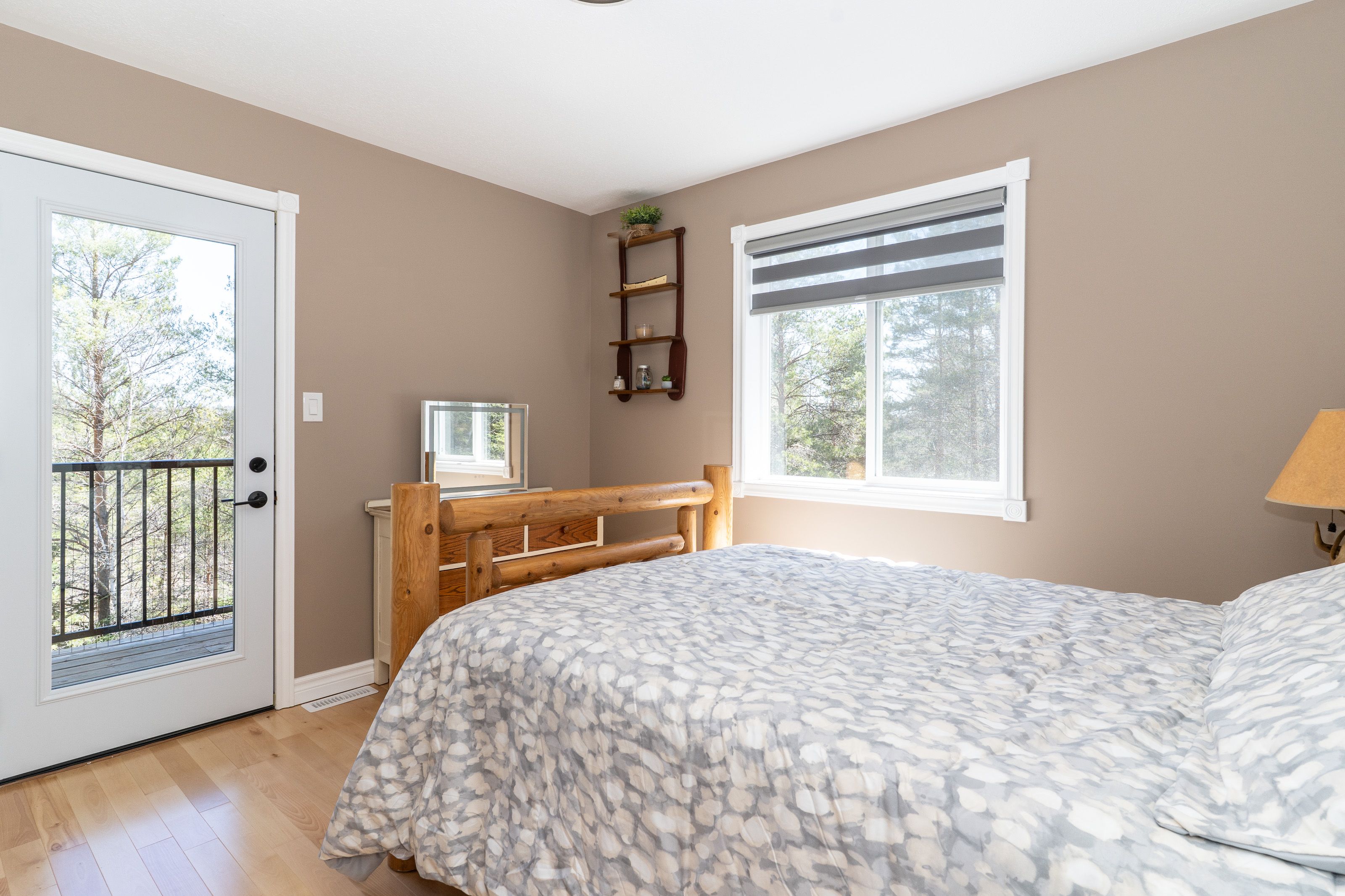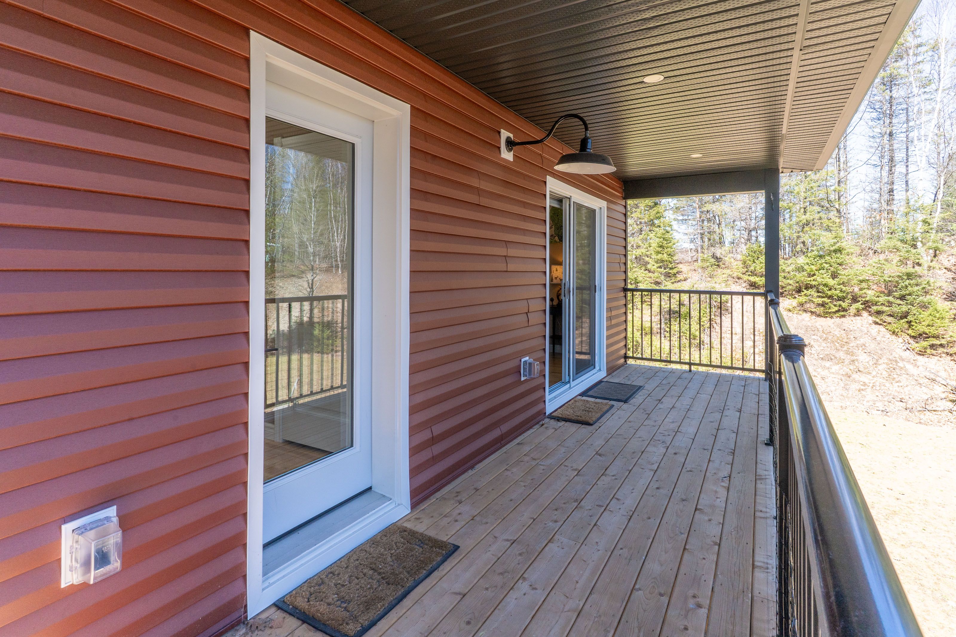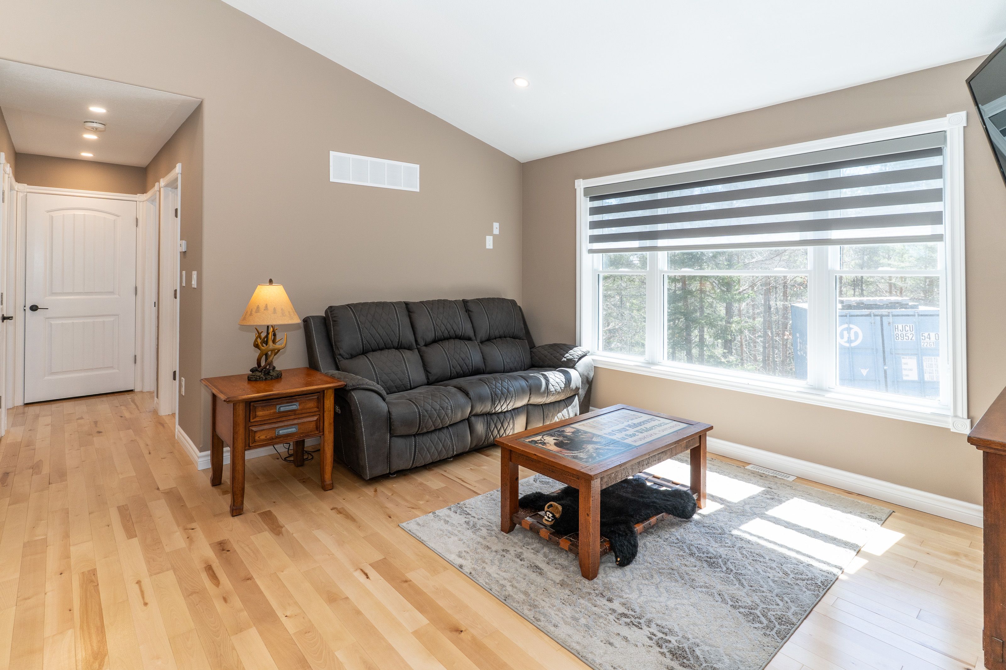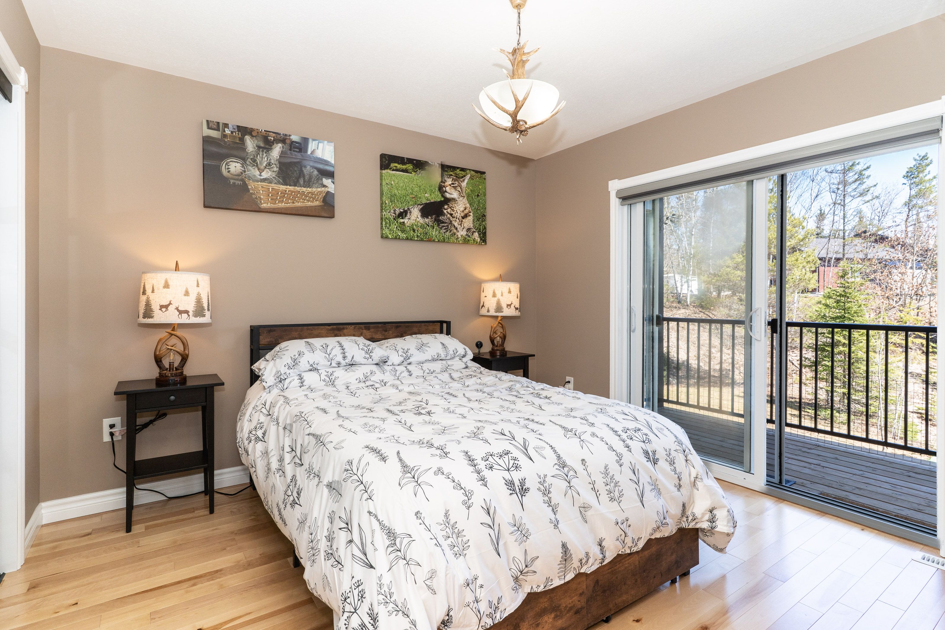 Cottage like character /setting with in town on a 1 acre lot. This 2 years young, well built 3 bedroom chalet style home suits all ages and stages. Featuring main floor laundry, covered porches front and back walk out to sunrise and sunset views!! Open concept living area, bright and airy. Fibre optic internet. Lower level offers additional living space, another 4 pce bath, and a bedroom. Walkout to private rear yard .... Patio and natural landscaped yard with fire pit for evening pleasure. All appliances - including microwave/convection oven will remain . This large frontage lot has potential for future development or room to grow. Look today - will not disappoint ! Note: floor plans in docs