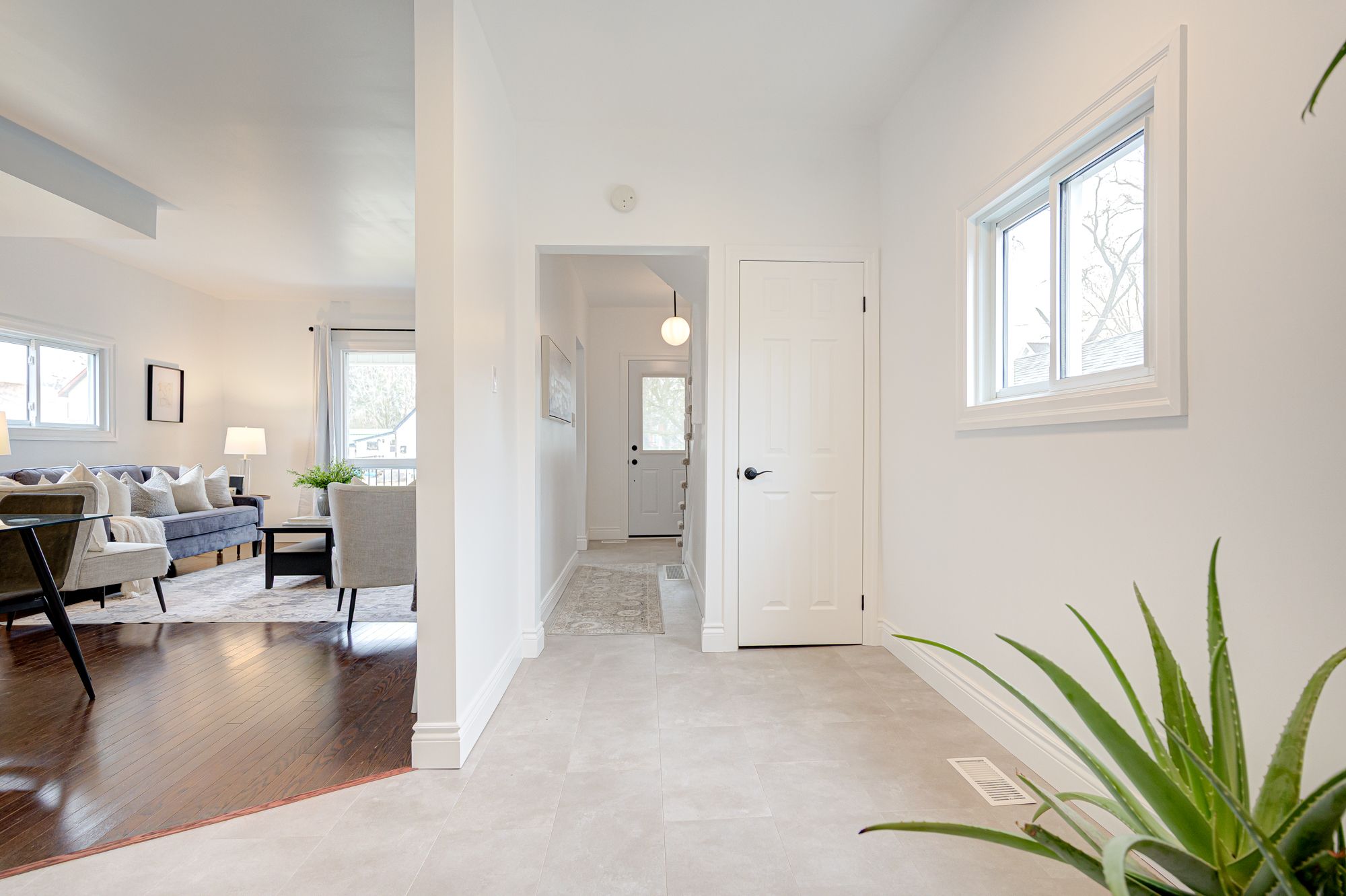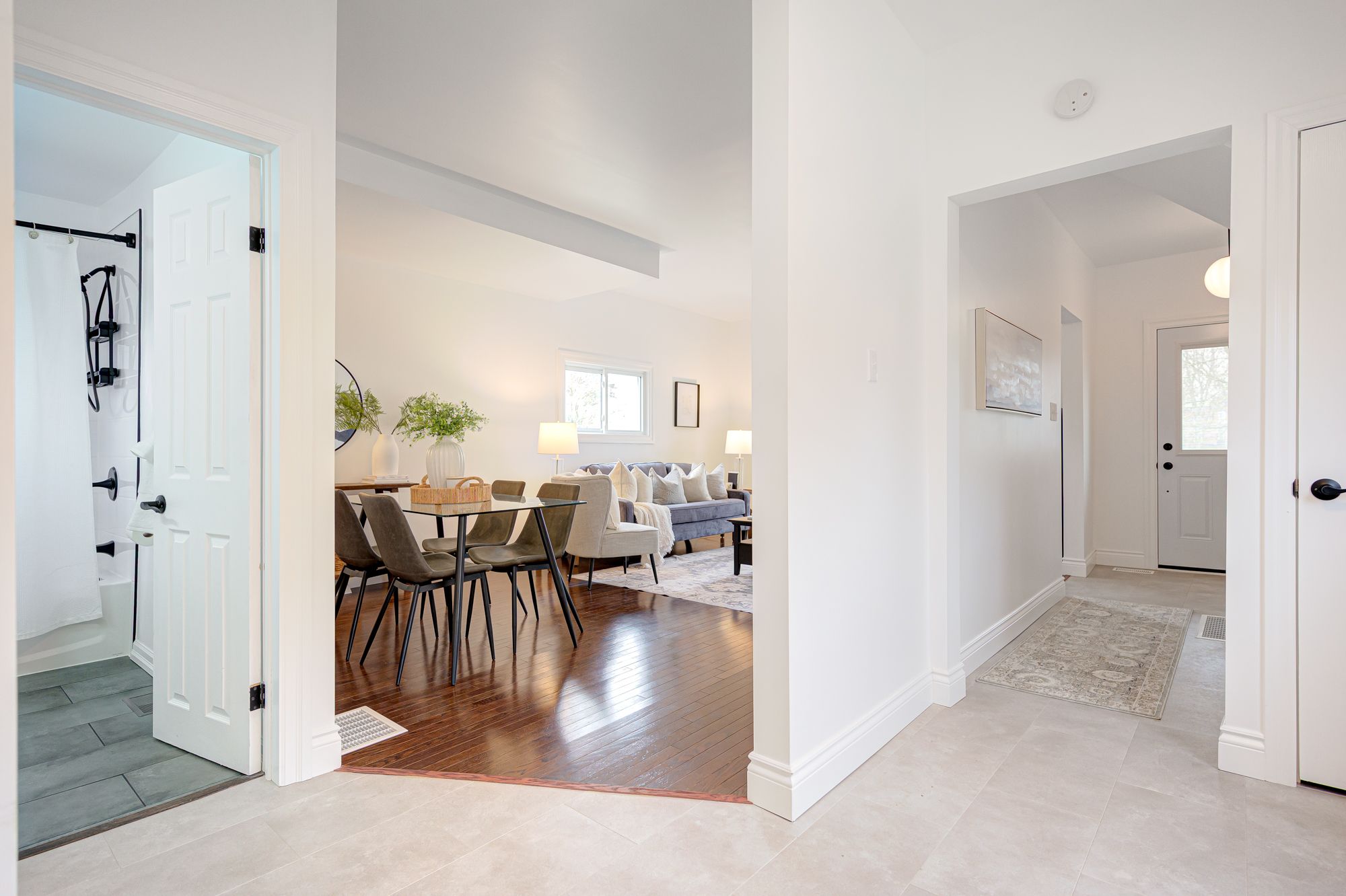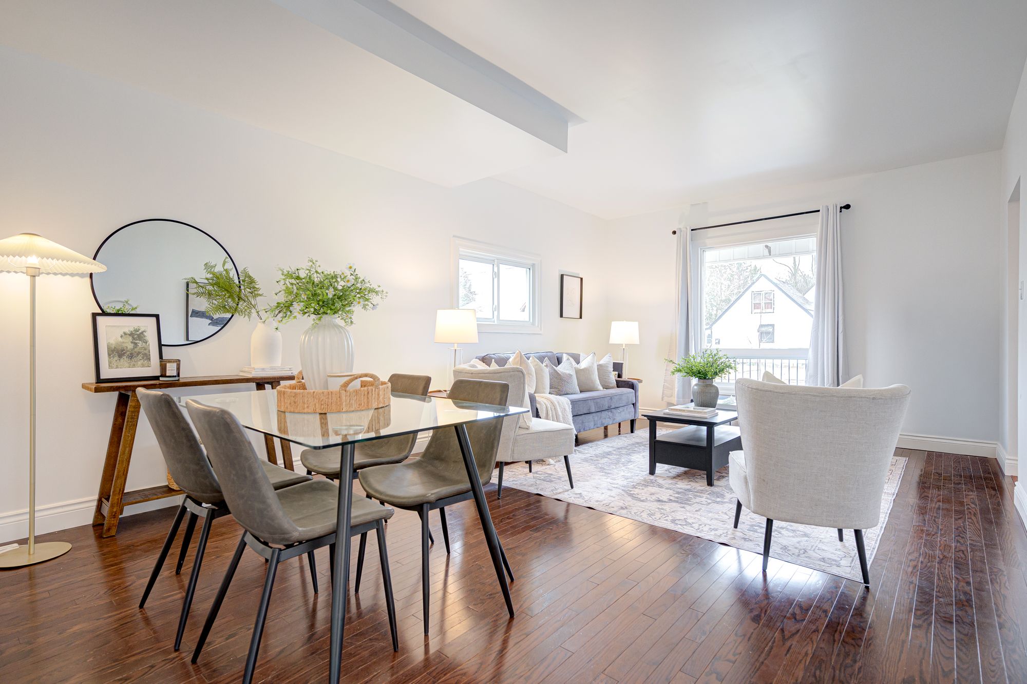 • Bright, airy living space with rich hardwood and luxury vinyl flooring.